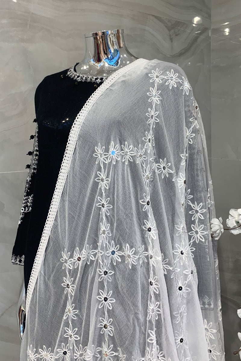 This beautiful casual dupatta features white floral thread work embroidery throughout the front on the chiffon overlay, finished with lace on the border.
