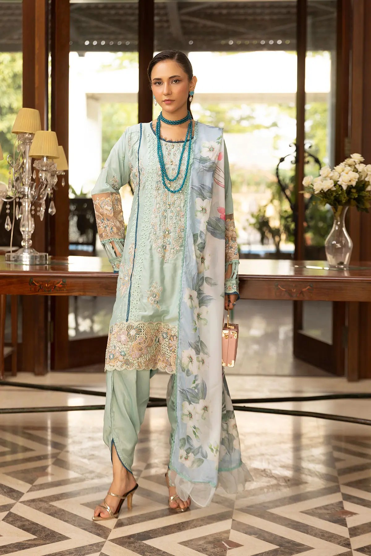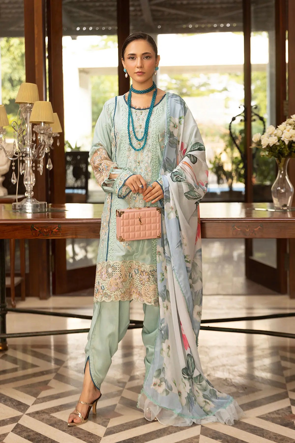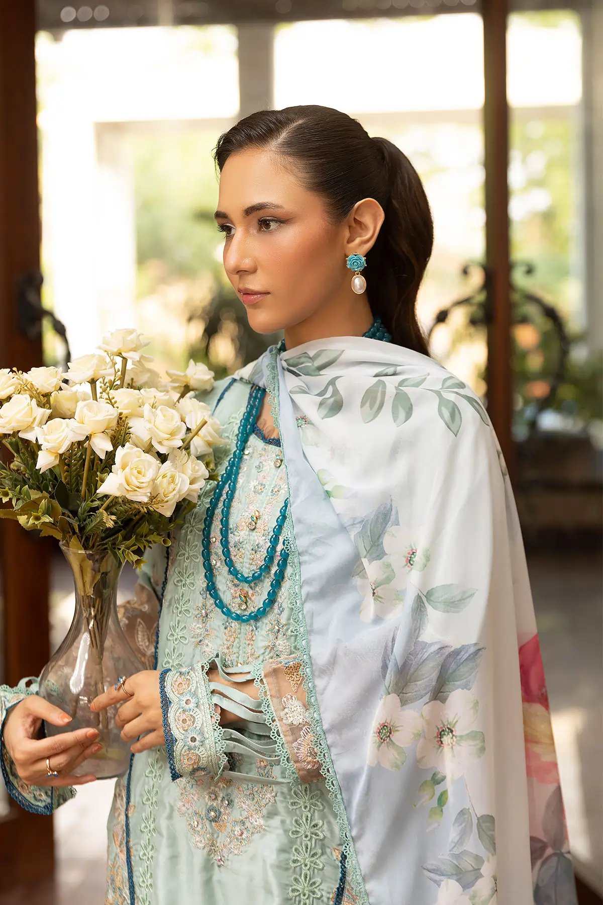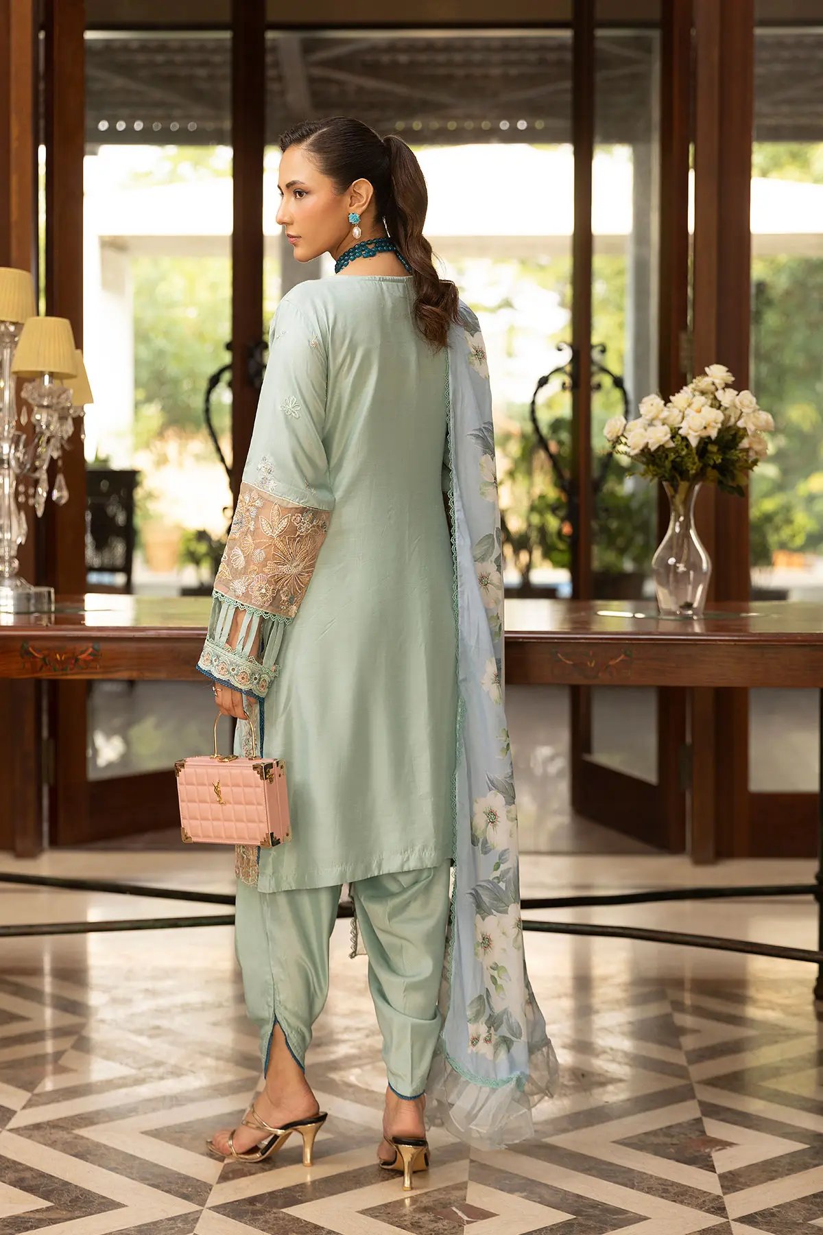 This beautiful 3 piece freesia collection features a straight shirt with luxury thread work embroidery throughout with bead embellishment along the front neckline, finished with contrasted embroidered border. It comes with full length embroidered sleeves with embellished cuffs. Paired with tulip trousers and the look is finished with a digital printed silk dupatta. Perfect mother and daughter collection for this Eid.
