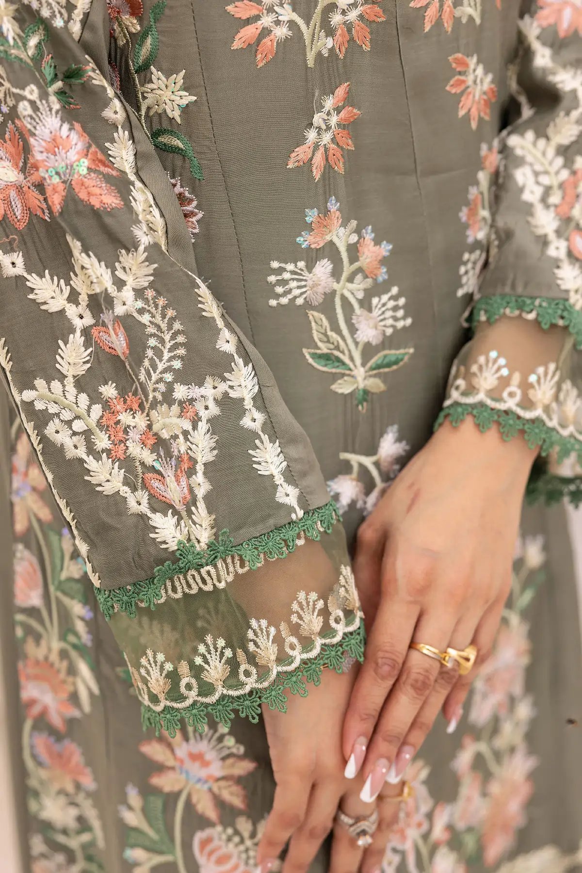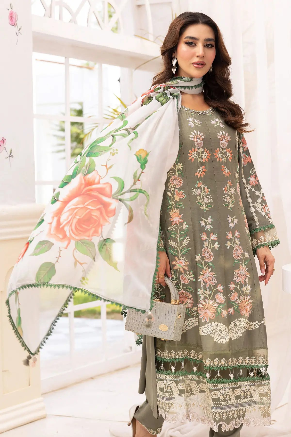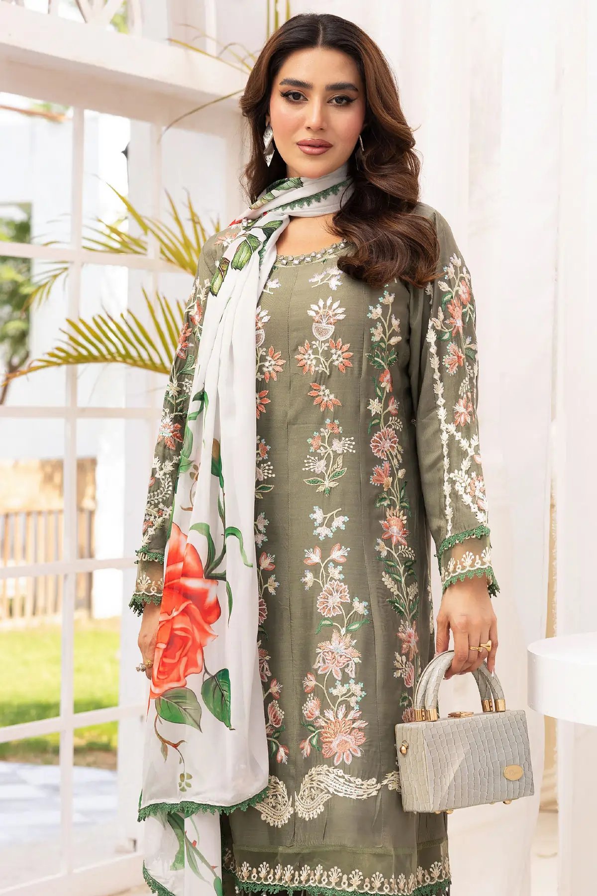 This beautiful 3 piece Freesia collection features a straight shirt with luxury thread work embroidery throughout finished with piping embellished on the bottom, It comes with full length embroidered sleeves. Paired with straight leg trousers with an embroidered border and the look is finished with a contrasted printed silk dupatta. Perfect casual festive collection for this Eid.