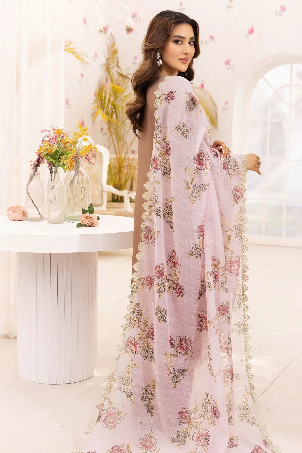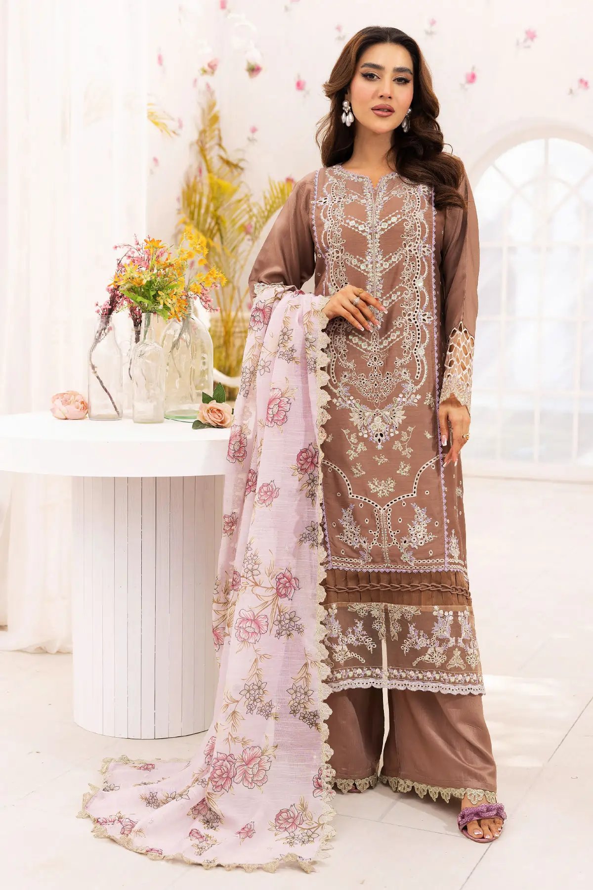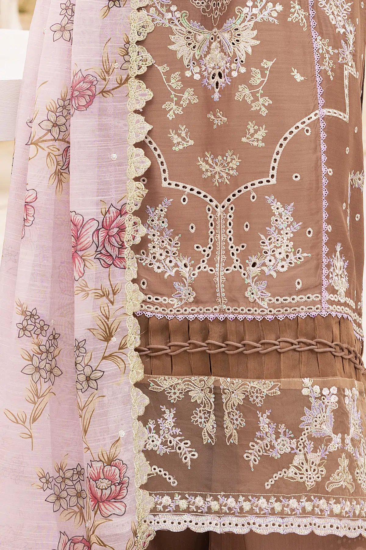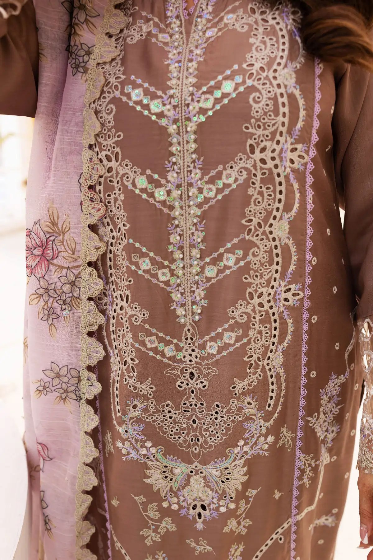 This beautiful 3 piece Freesia collection features a straight shirt with luxury thread work embroidery throughout finished with piping embellished on the bottom, It comes with full length embroidered sleeves. Paired with straight leg trousers with an embroidered border and the look is finished with a contrasted printed silk dupatta. Perfect casual festive collection for this Eid