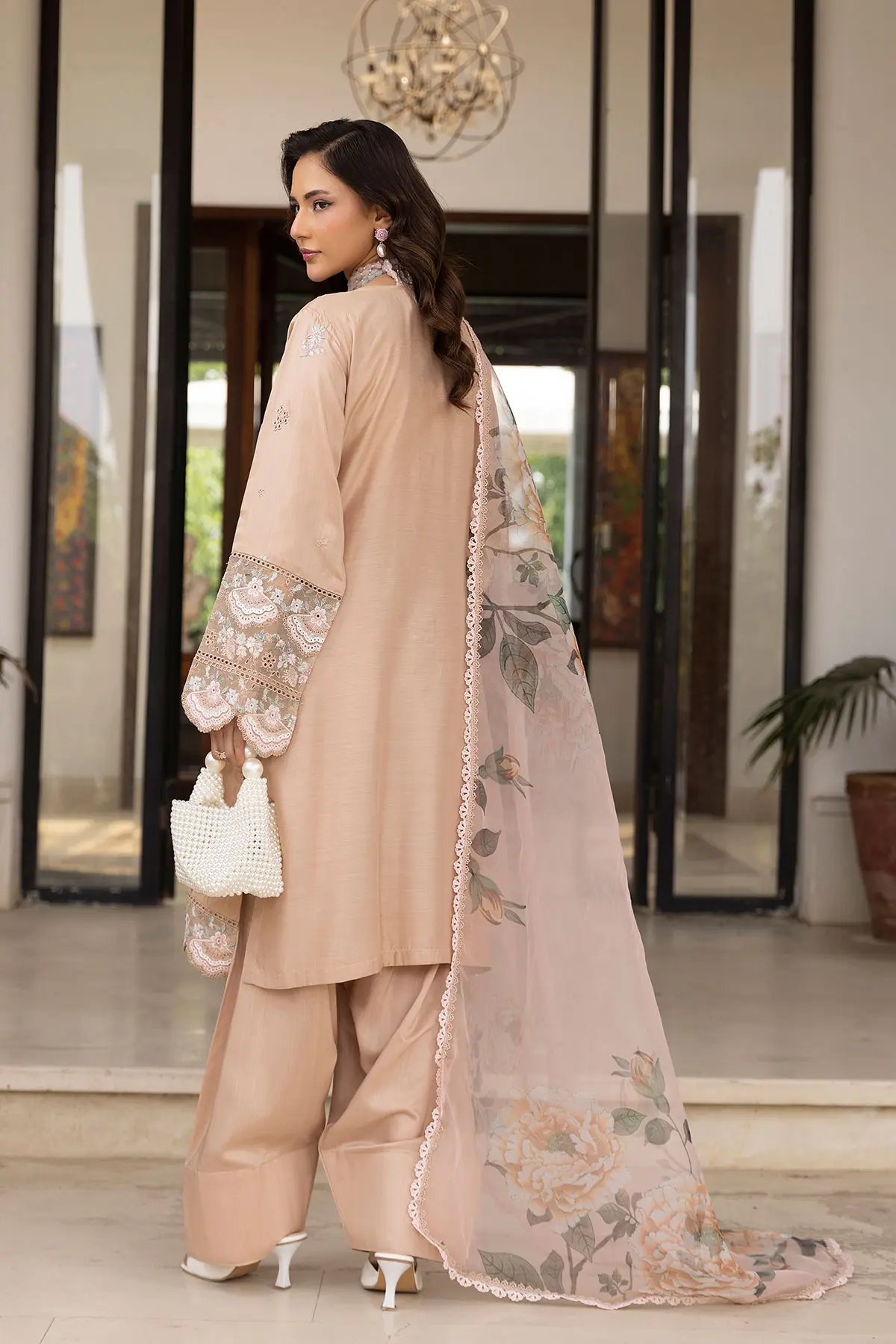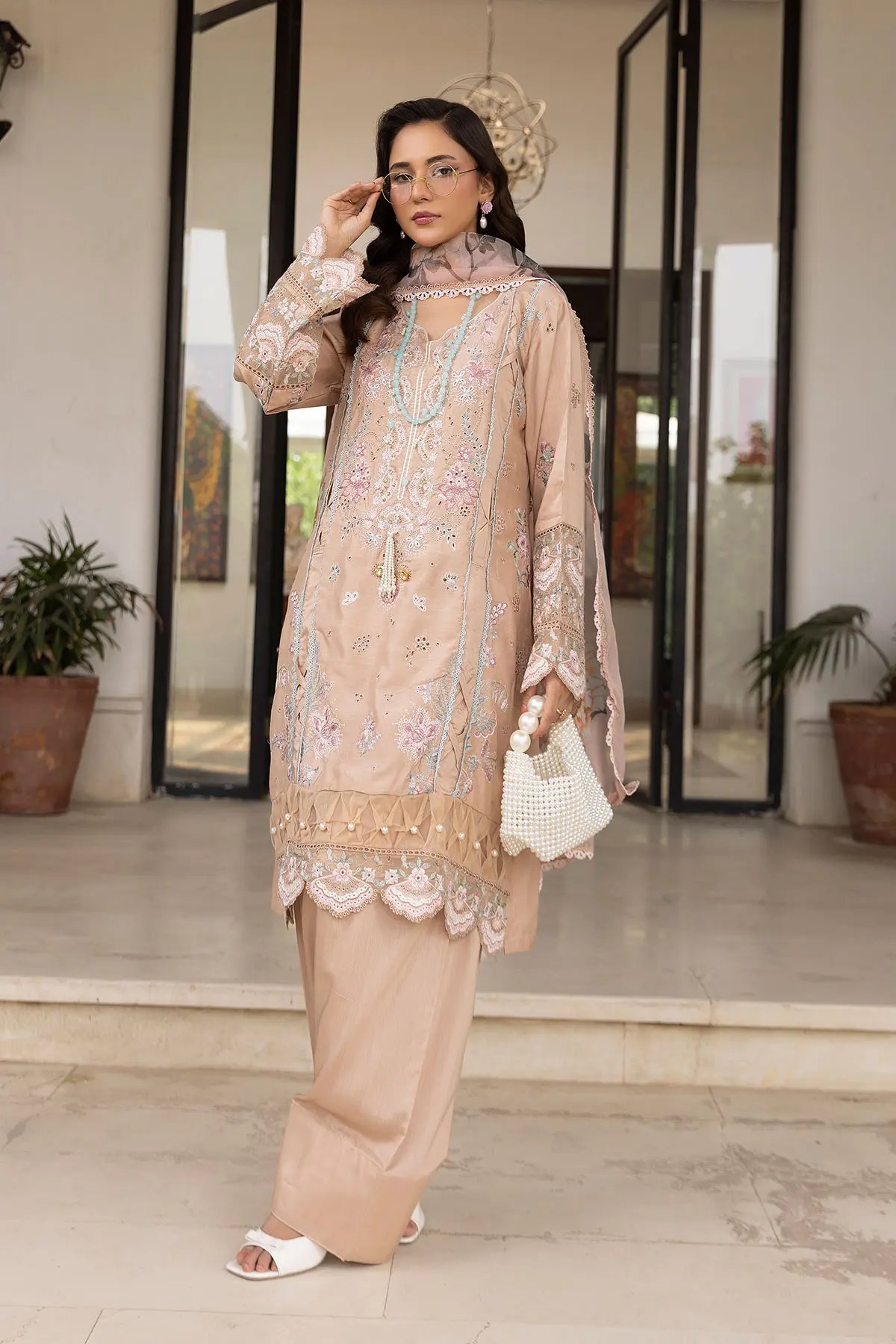 This beautiful 3 piece Freesia collection features a straight shirt with luxury thread work embroidery throughout with pearl tassel embellishment on the waist, finished with a floral embroidered lace border, It comes with full length embroidered sleeves and paired with a farshi shalwar. The look is finished with an embroidered organza dupatta. Perfect casual festive collection for this Eid.