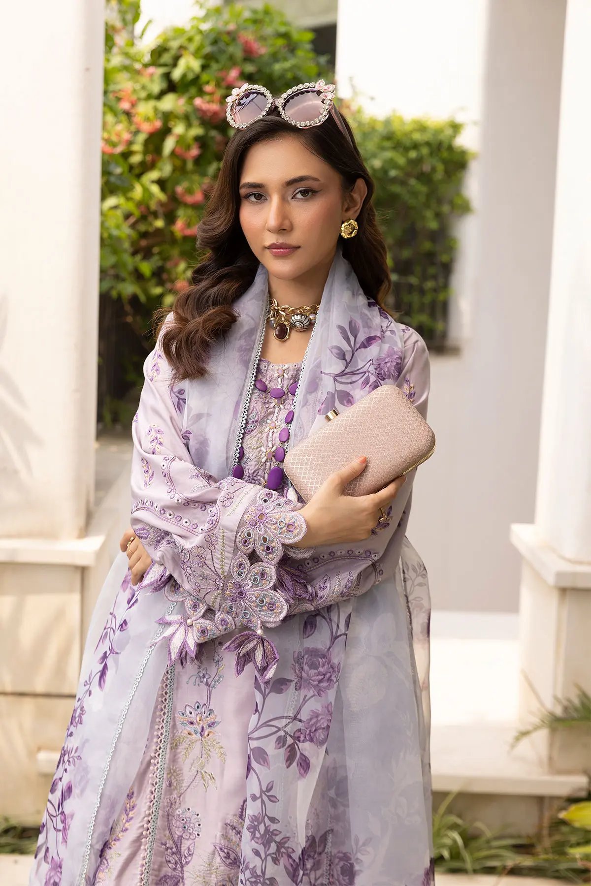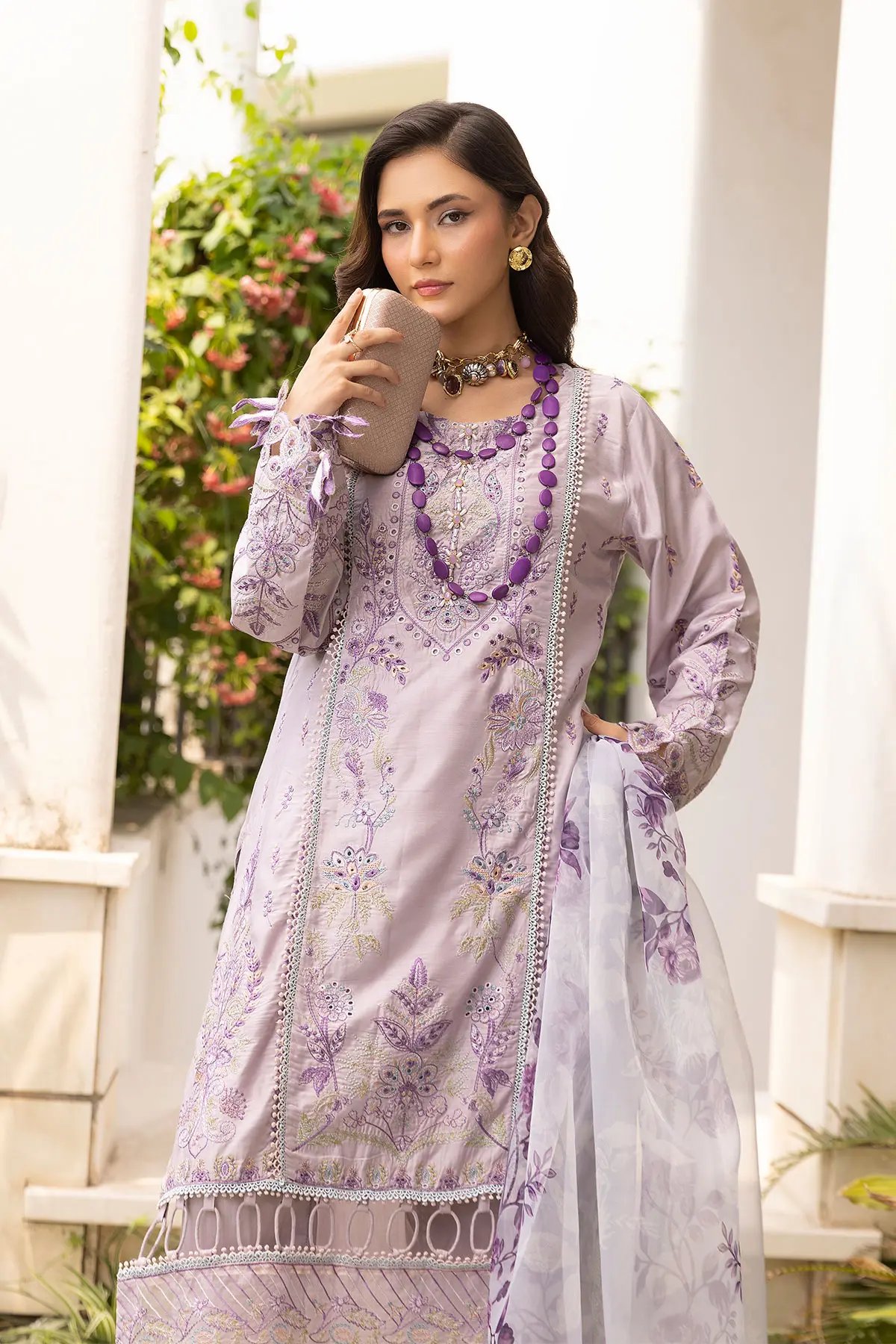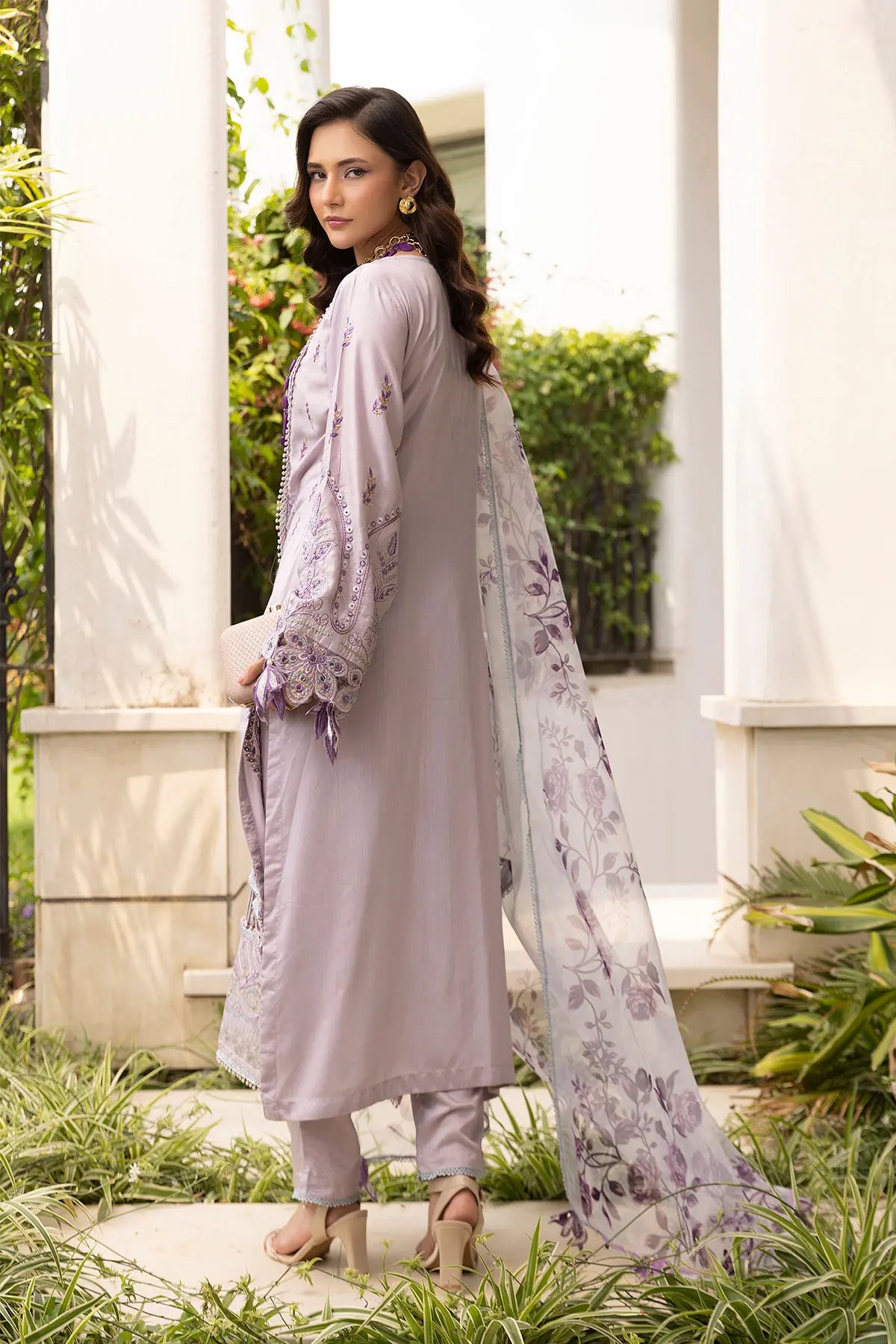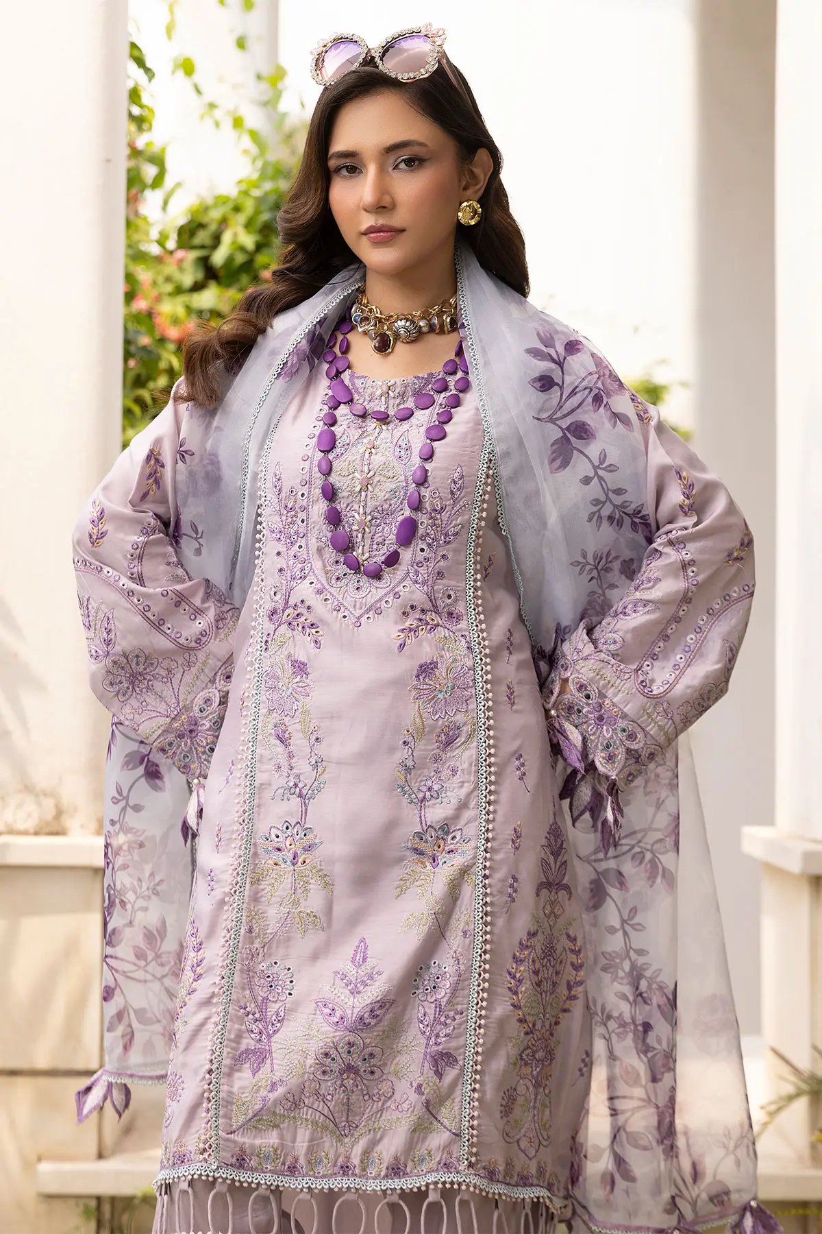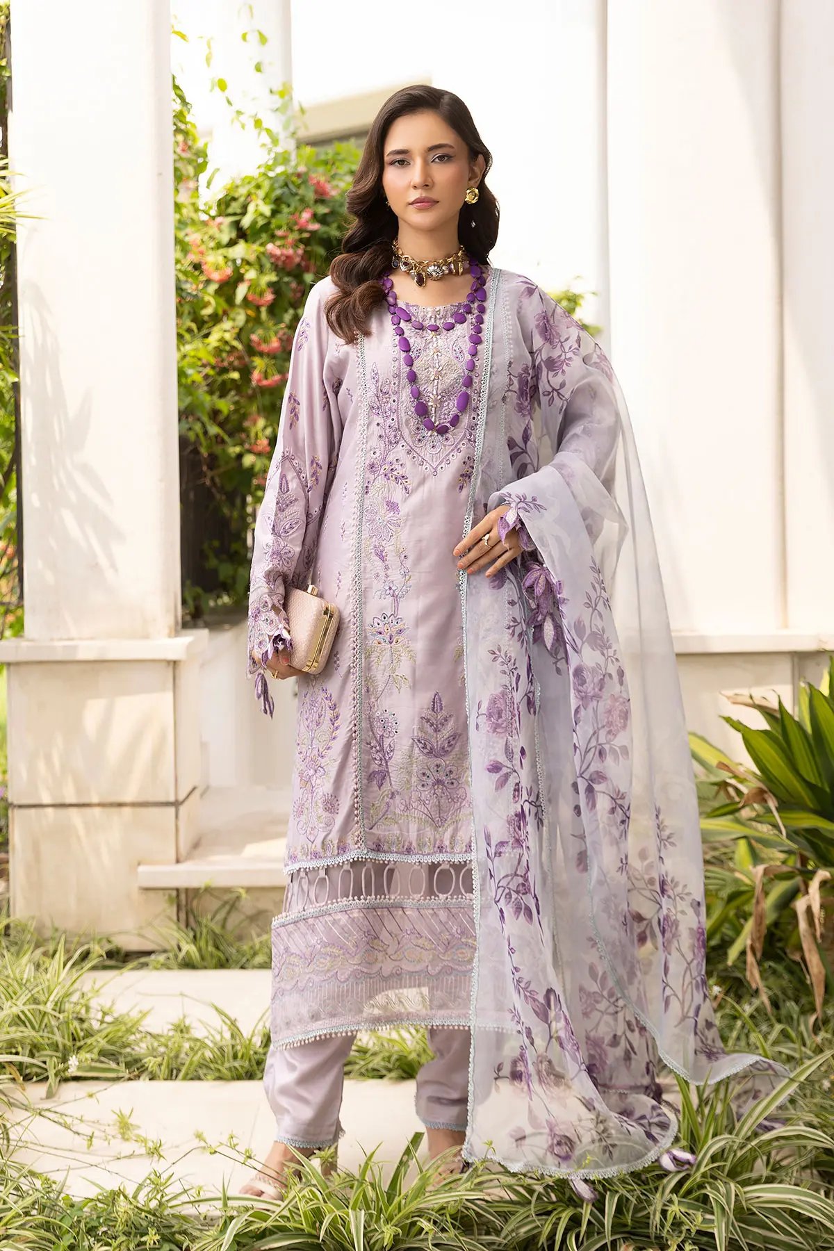 This beautiful 3 piece freesia collection features a straight shirt with luxury thread work embroidery throughout with bead embellishment along the front neckline, finished with cut work piping embellishment border on the bottom, finished with full length embroidered sleeves with floral lace embellished cuffs. Paired with straight leg trousers and the look is finished with a printed organza dupatta. Perfect mother and daughter collection for this Eid.