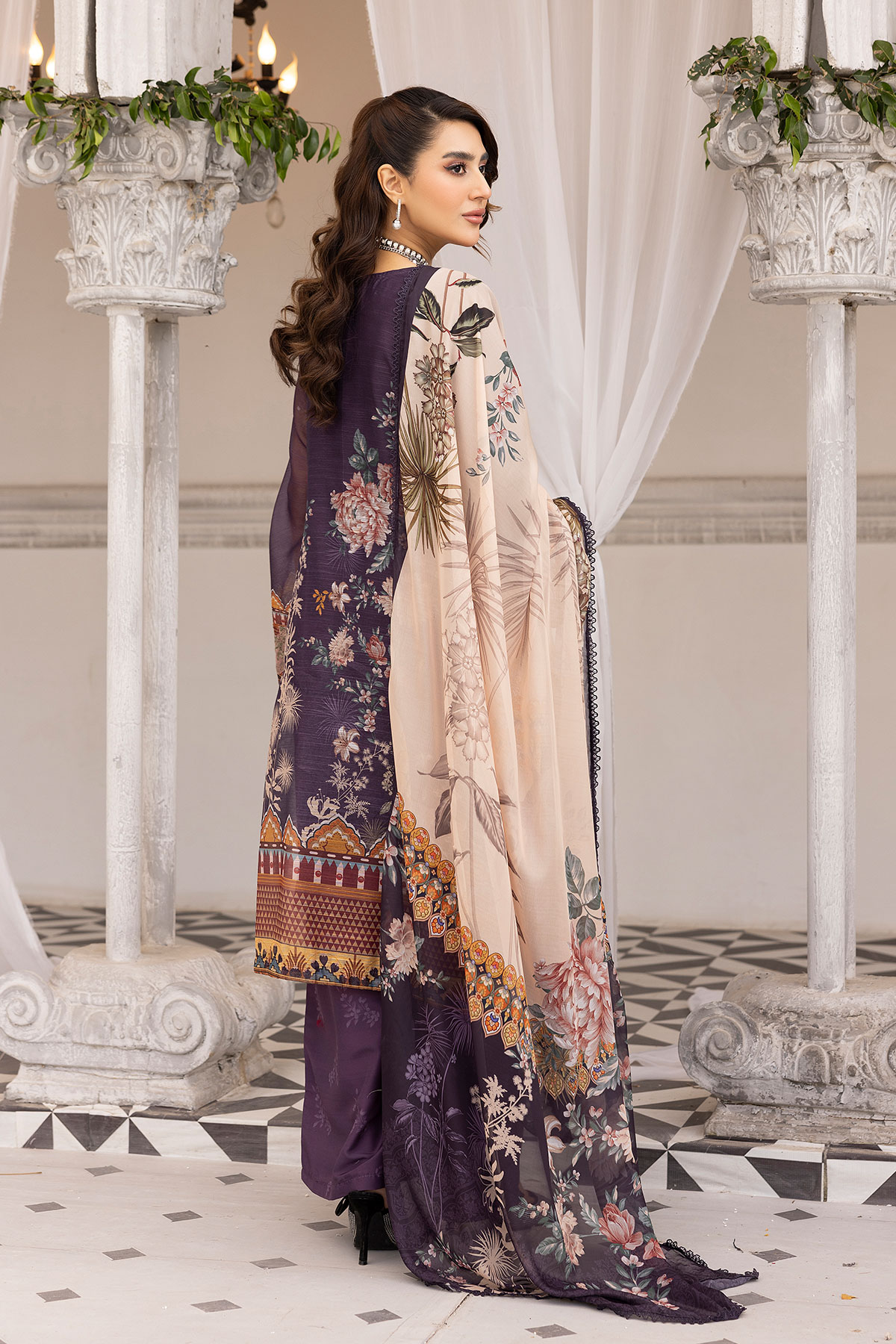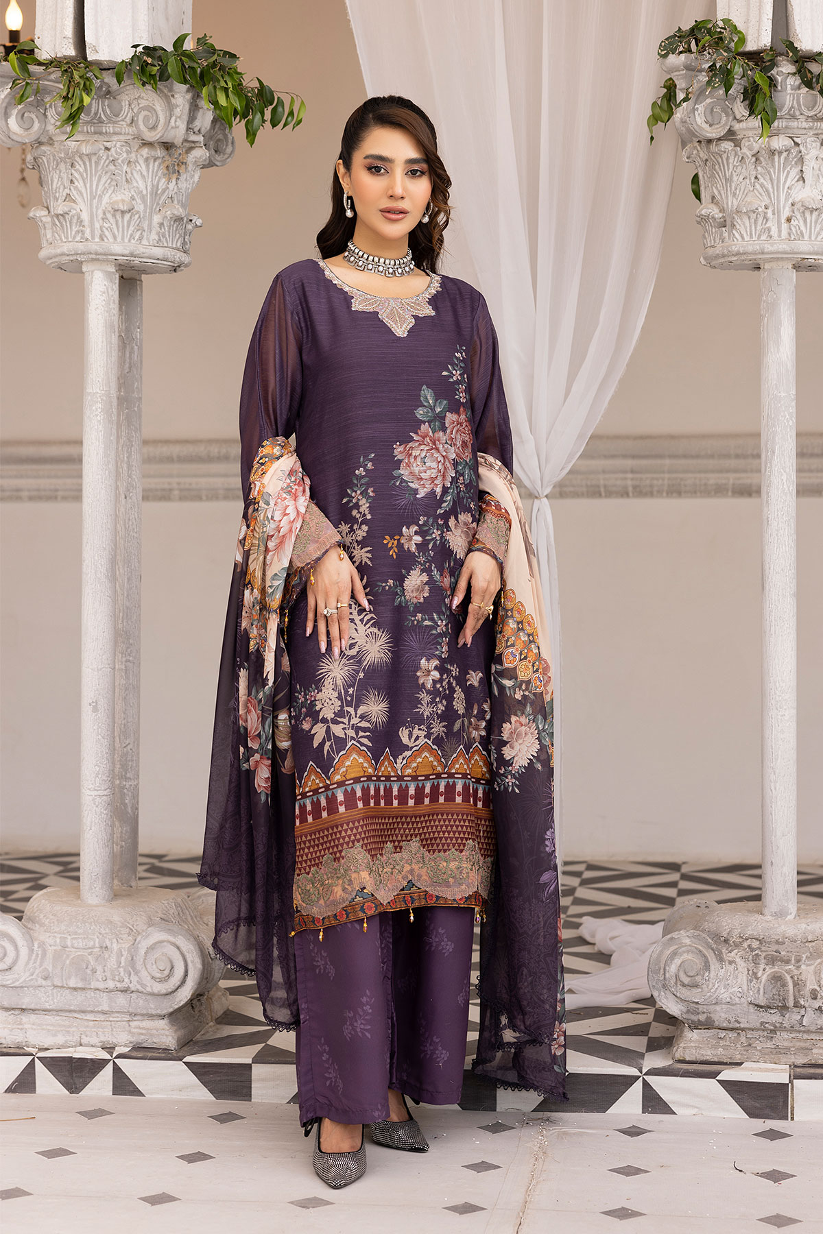 This beautiful 3 piece suit is made from soft monar fabric, featuring a straight kameez with digital printed patterns throughout for a stylish yet traditional look. It comes with a printed plazo, offering a comfortable and flowy fit. The set is completed with a lightweight Khadi net dupatta. Perfect for festive occasions and Eid wear.