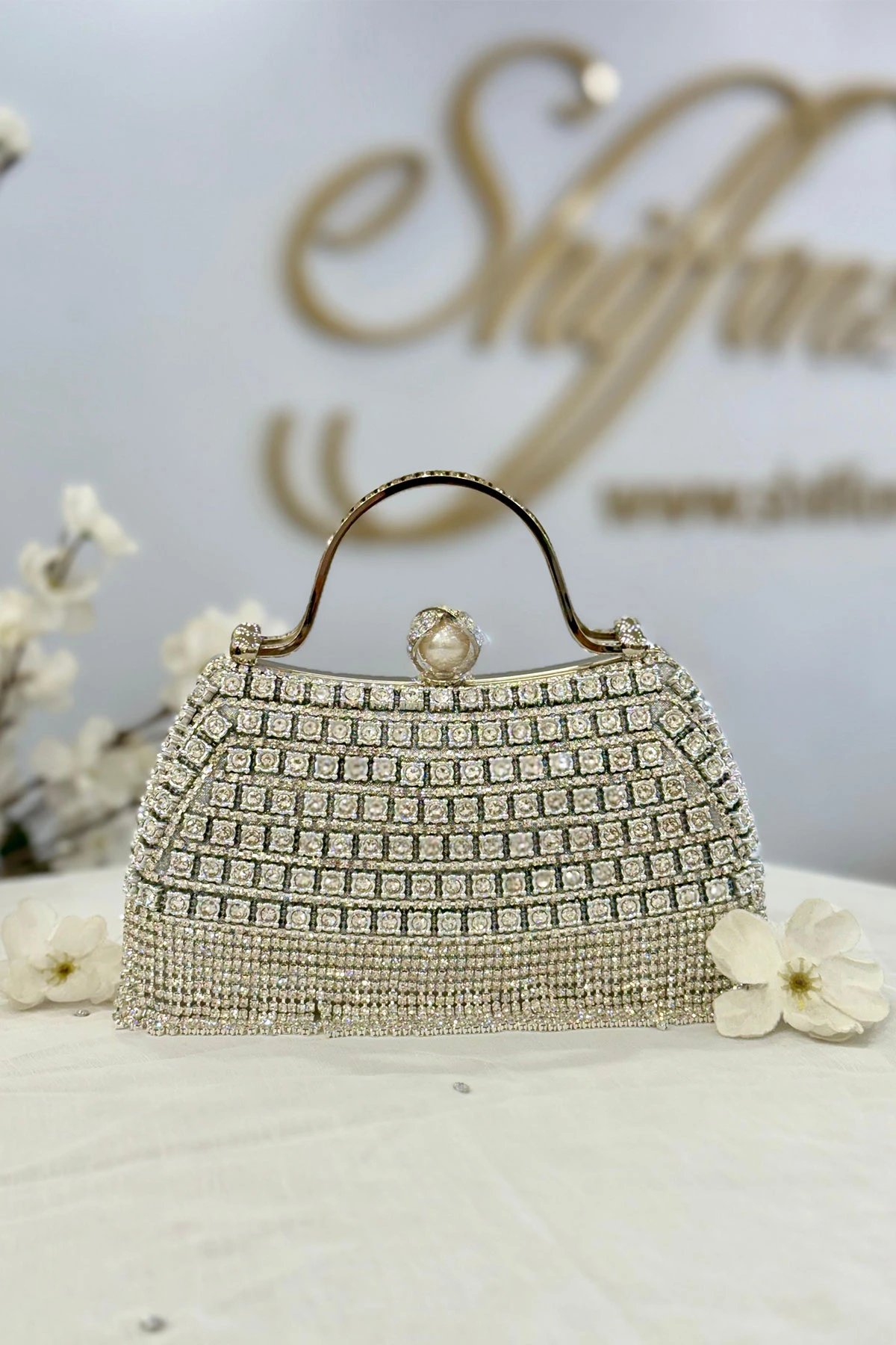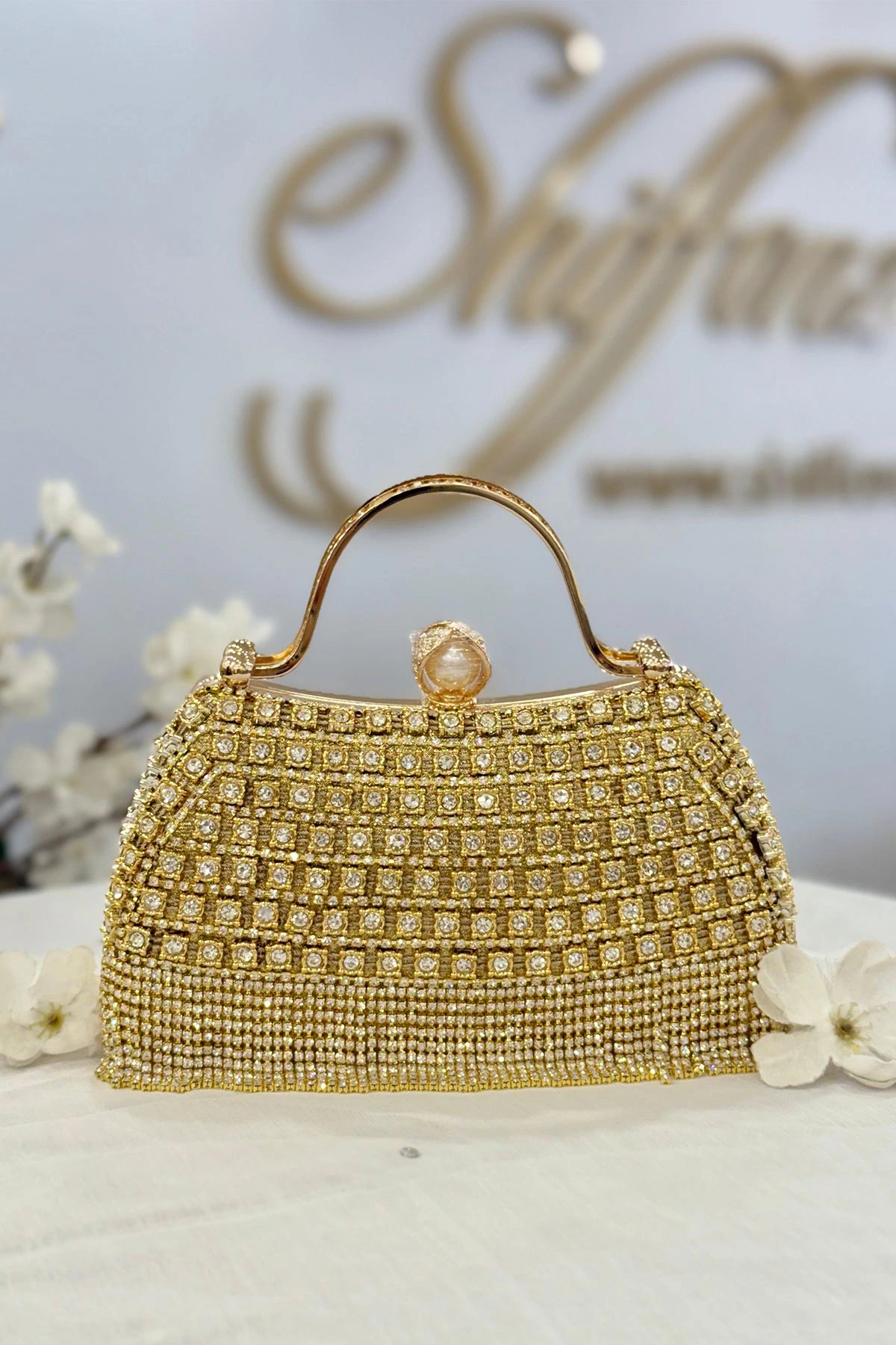 The glided crystal clutch is the ultimate statement piece for glamorous evenings. It’s adorned with shimmering rhinestones and intricate crystal embellishments. Perfect for weddings and special occasions. It holds your essentials in style.
