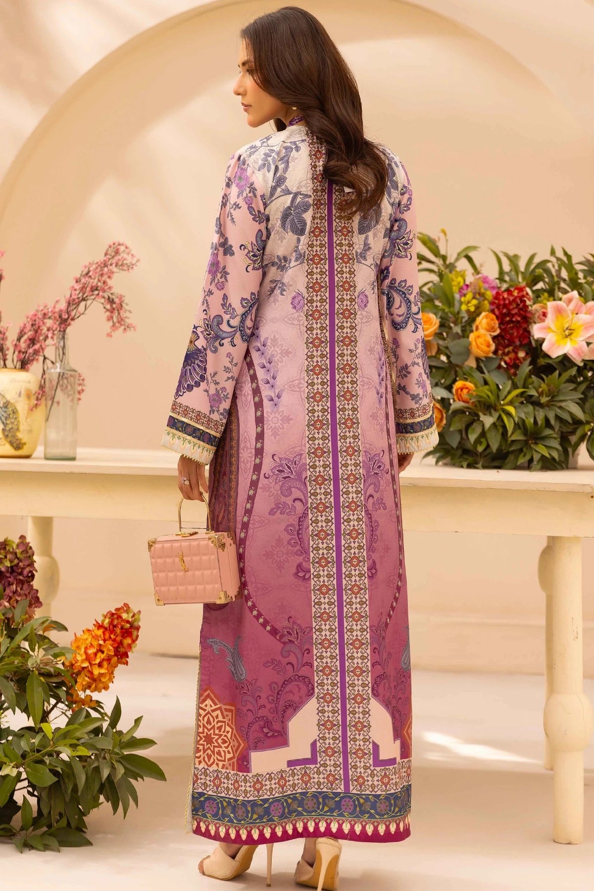 A celebration of timeless elegance, this intricately embroidered long kaftan dress brings heritage artistry into modern occasion wear. It’s adorned with vibrant floral motifs in rich shades creating a striking yet graceful visual harmony. Each detail around the neckline, sleeves, and hem is crafted to elevate the silhouette with depth, texture, and cultural refinement. Paired with straight leg trousers. Perfect mother and daughter collection for this Eid.