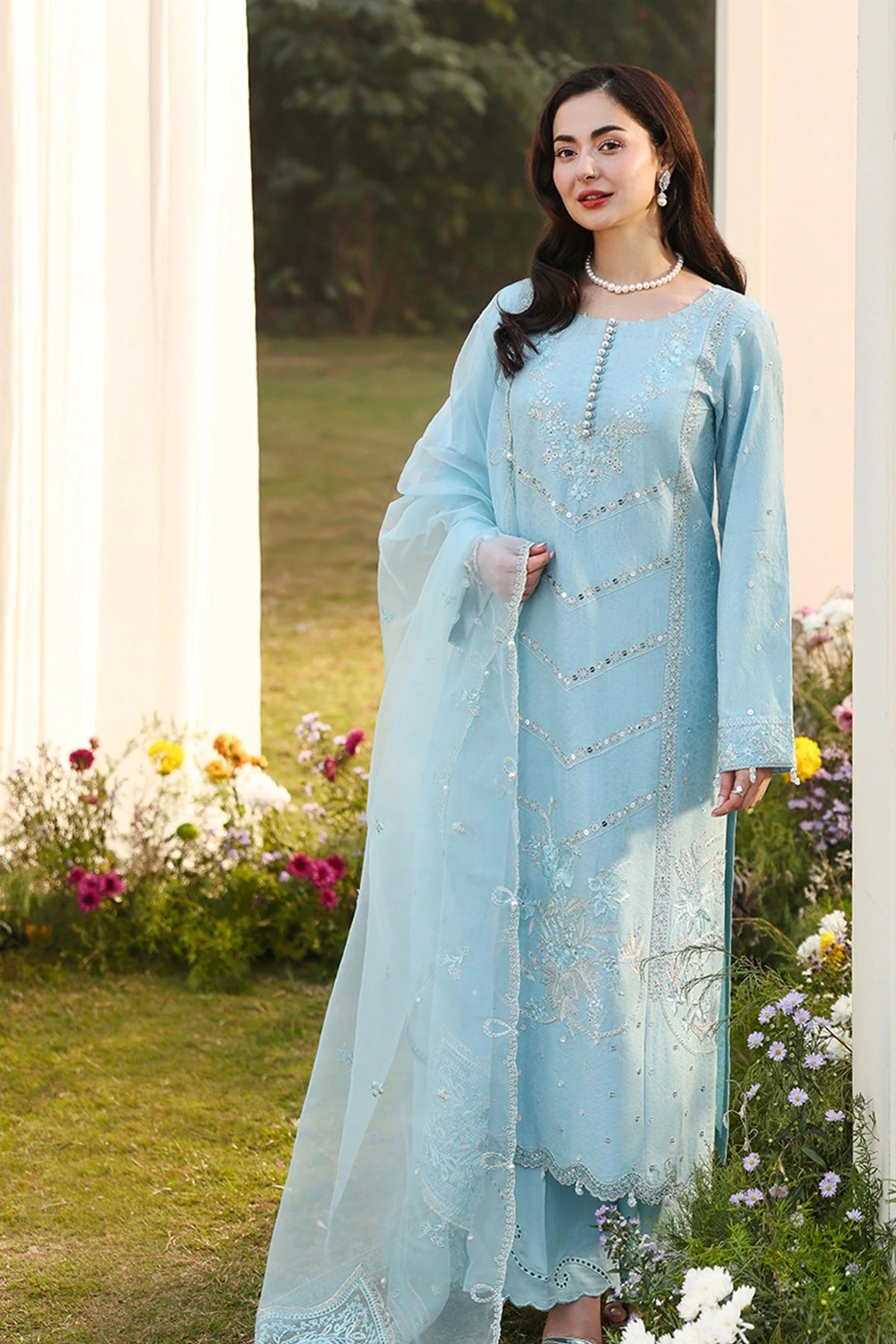 Hania Amir 2026 Eid edit collection features a straight shirt with luxury thread work embroidery throughout with button embellishments on the front, it comes with full length embroidered sleeves. Paired with straight leg lawn trousers and the look is finished with an organza dupatta. Perfect mother and daughter collection for this Eid.