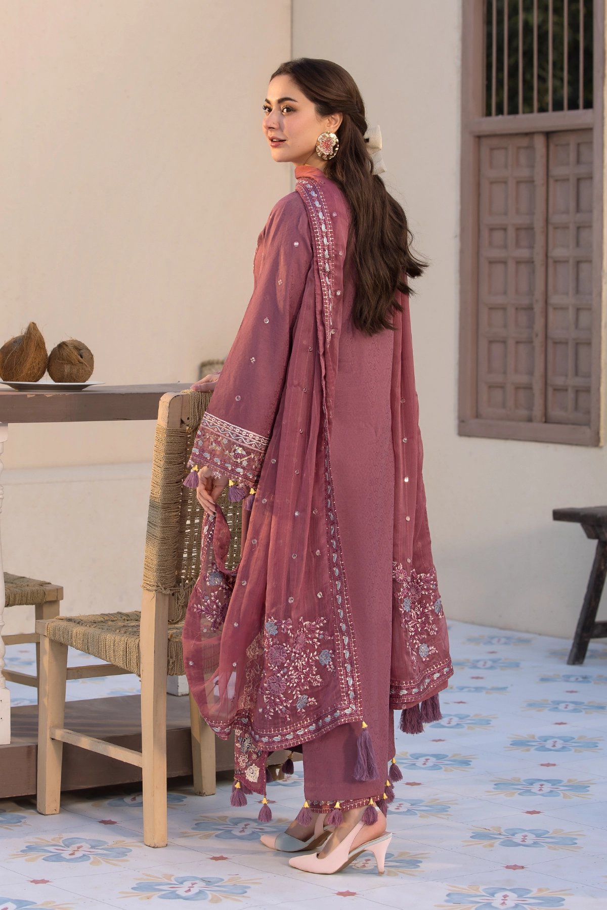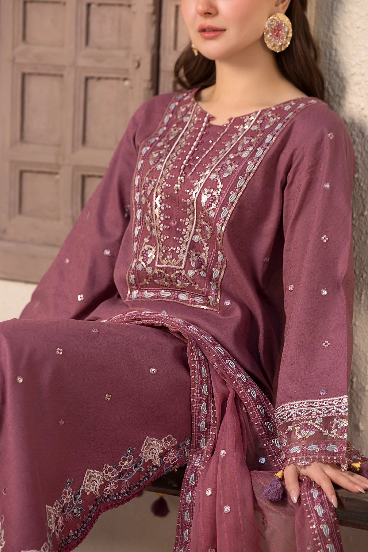 This beautiful 3 piece Eid collection suit features a stunning jacquard shirt, adorned with intricate sequin embroidery for an elegant touch. The delicate tassels on the sleeves and borders add a graceful charm to the outfit. Paired with a luxurious chiffon dupatta, meticulously crafted with shimmering sequin embroidery and finished with fine tassels. The look is completed with tailored jacquard trousers, featuring elegant sequin embroidery, making this ensemble perfect for Eid. Please note that the colour may vary slightly due to photography lighting, and the design may have slight variations.