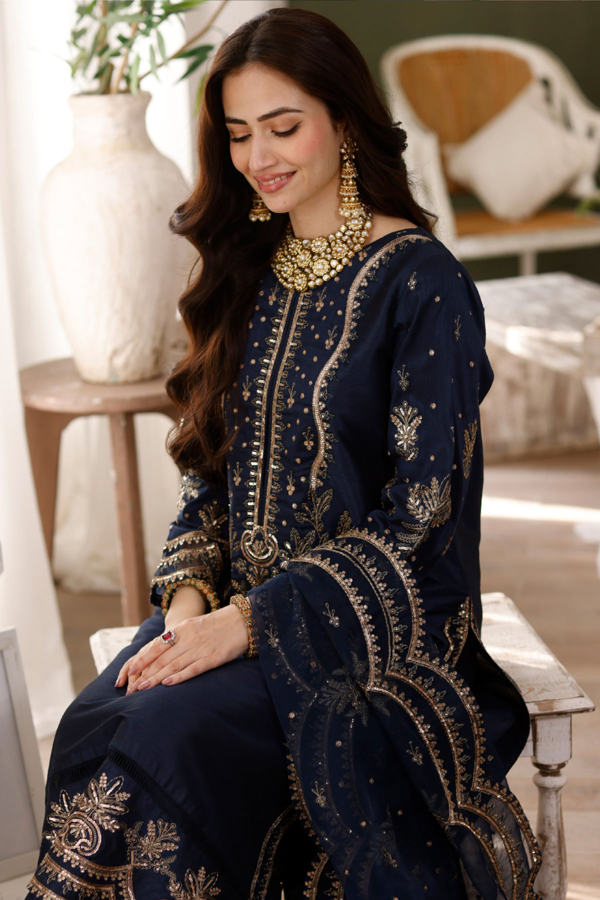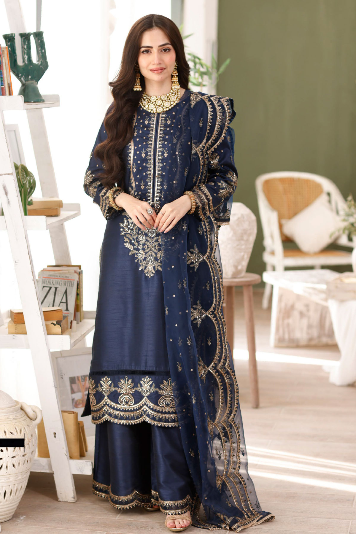 This beautiful Heer collection 3 piece suit features a straight shirt with luxury thread work embroidery throughout with full length embroidered sleeves. Paired with wide leg soft raw silk plazo trousers. The look is finished with a organza luxury embroidered heavy pallah dupatta with laces.