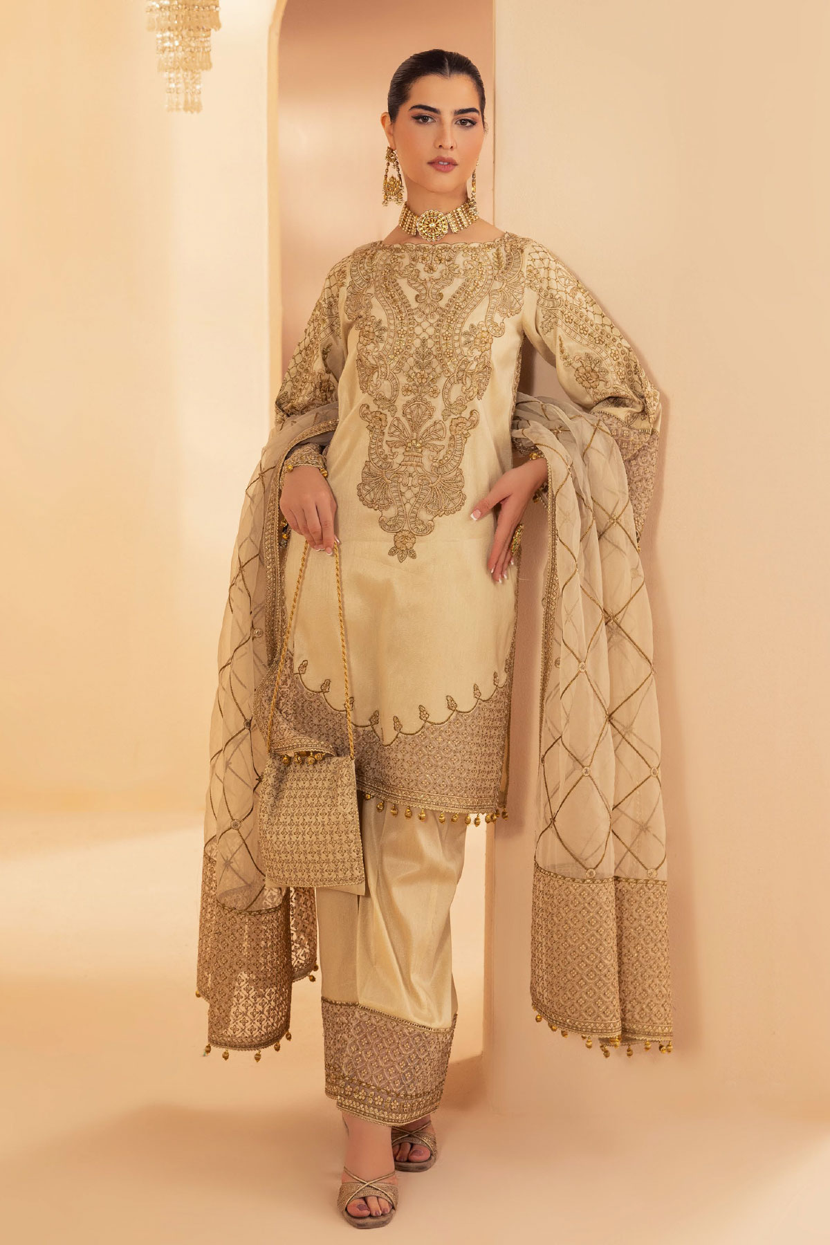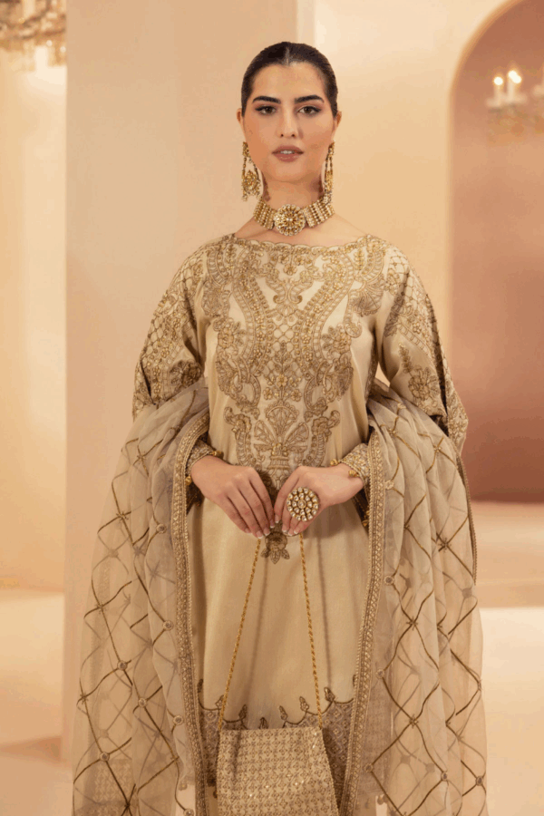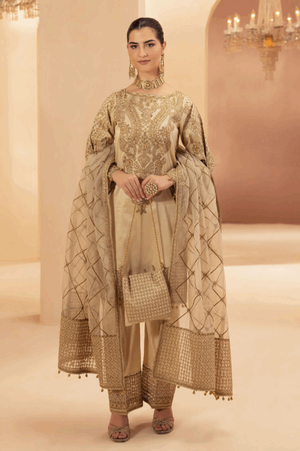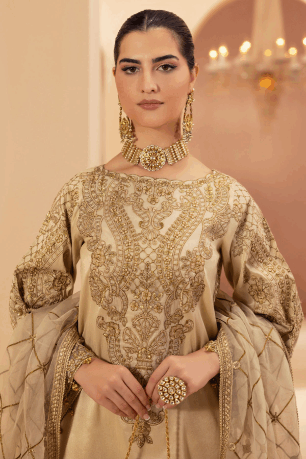 This beautiful Heer collection 3 piece suit features a straight shirt with luxury thread work embroidery throughout with full length embroidered sleeves. Paired with wide leg soft raw silk straight leg trousers. The look is finished with a organza luxury embroidered heavy pallah dupatta with laces.