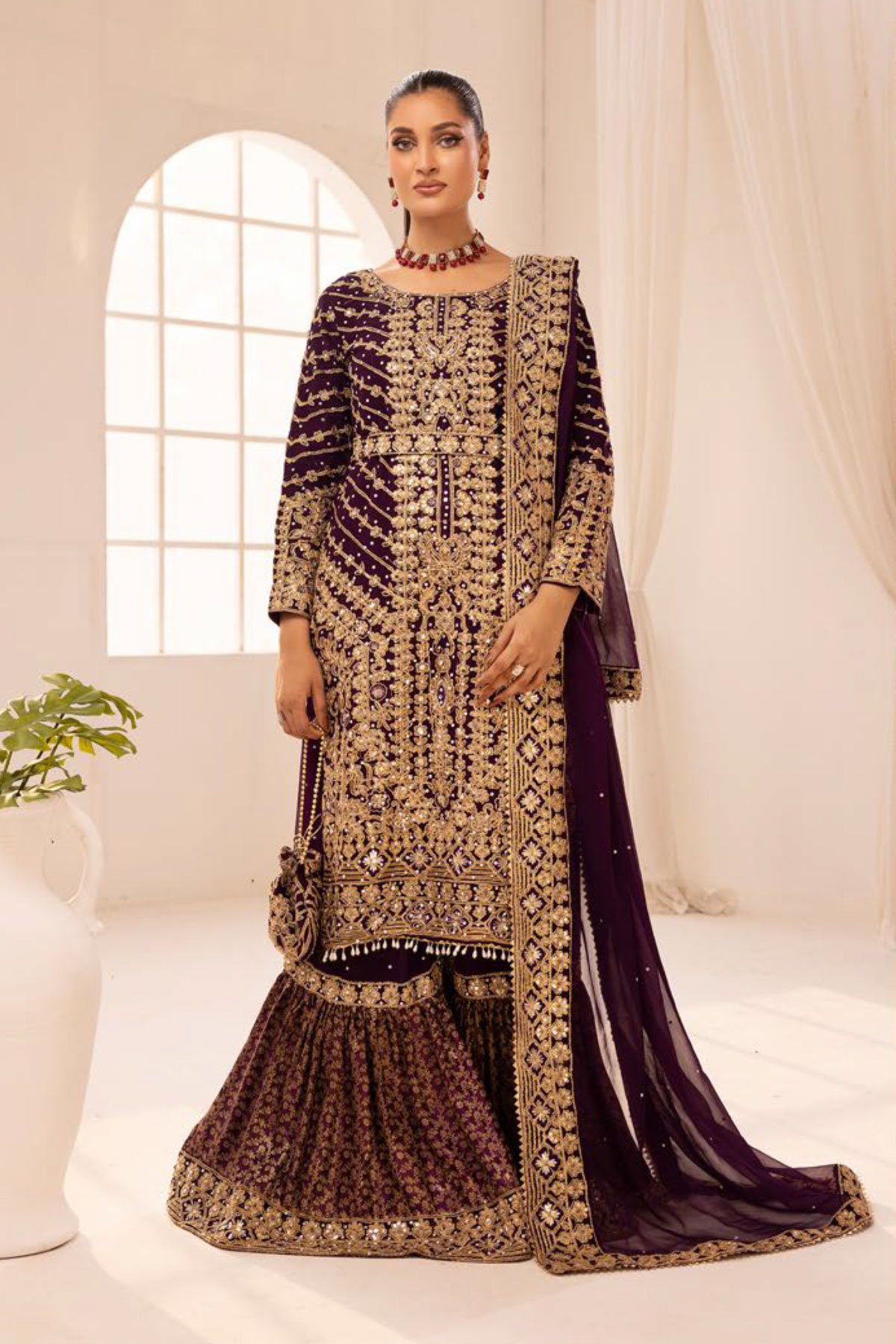 This beautiful 3 piece Hoor collection features a straight shirt with luxury thread work embroidery throughout the front with bead embellishments, finished with full length embroidered sleeves. It comes with an embroidered banarsi gharara and the look is finished with an embroidered dupatta. An embroidered belt is also included to enhance the waist and a potli bag.