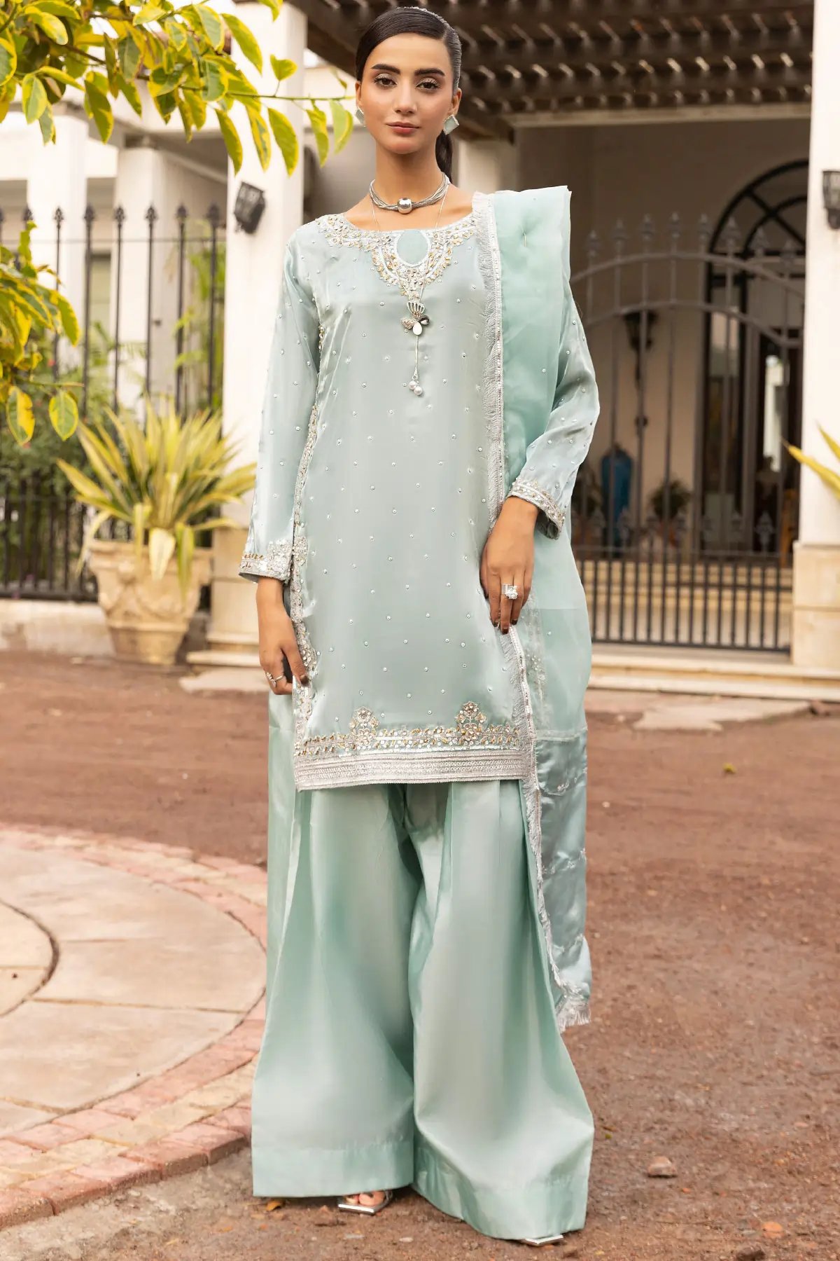 This beautiful 3 piece Hussain rehar collection features a straight shirt with luxury thread work embroidery with scattered diamantés, finished with full length embroidered sleeves. Paired with a raw silk farshi shalwar and the look is finished with an embroidered organza dupatta. Perfect festive collection for this Eid.