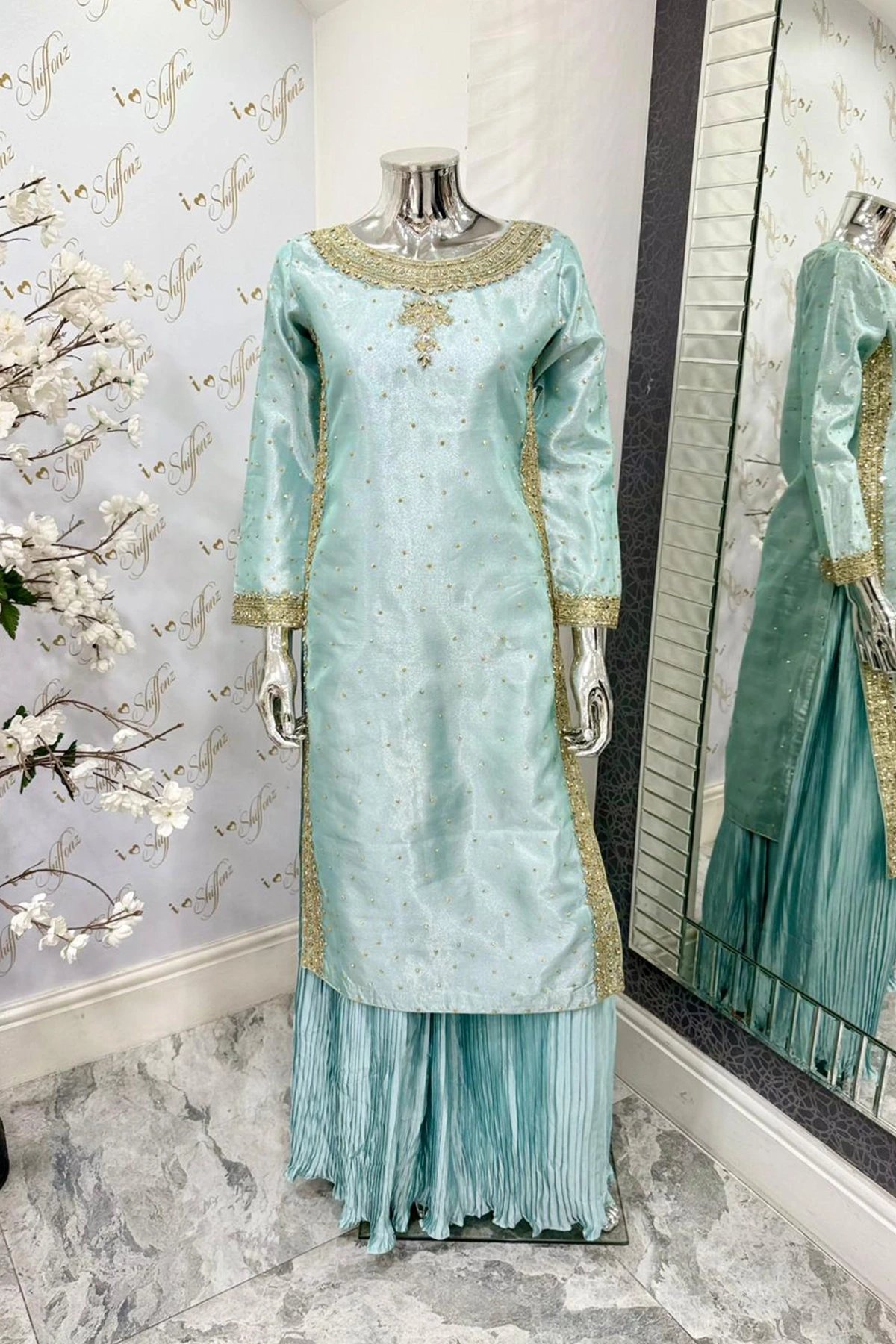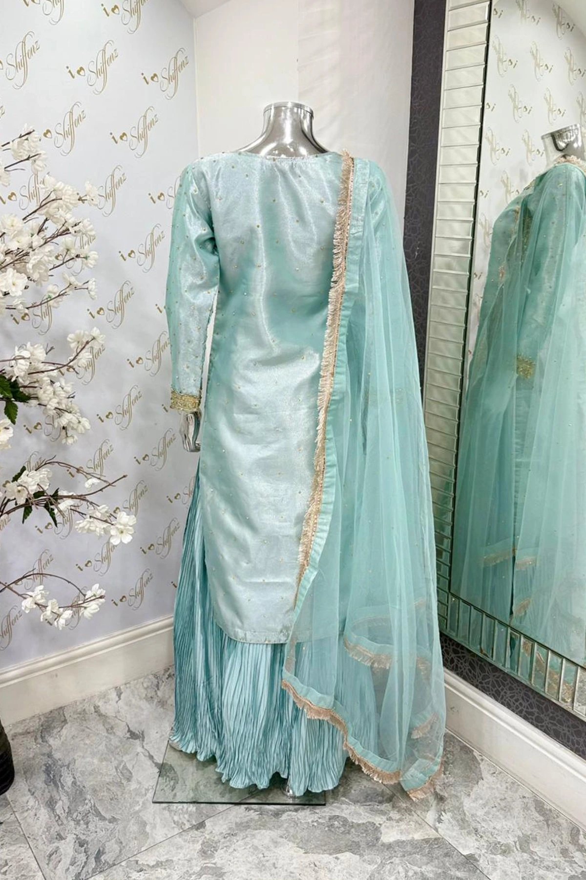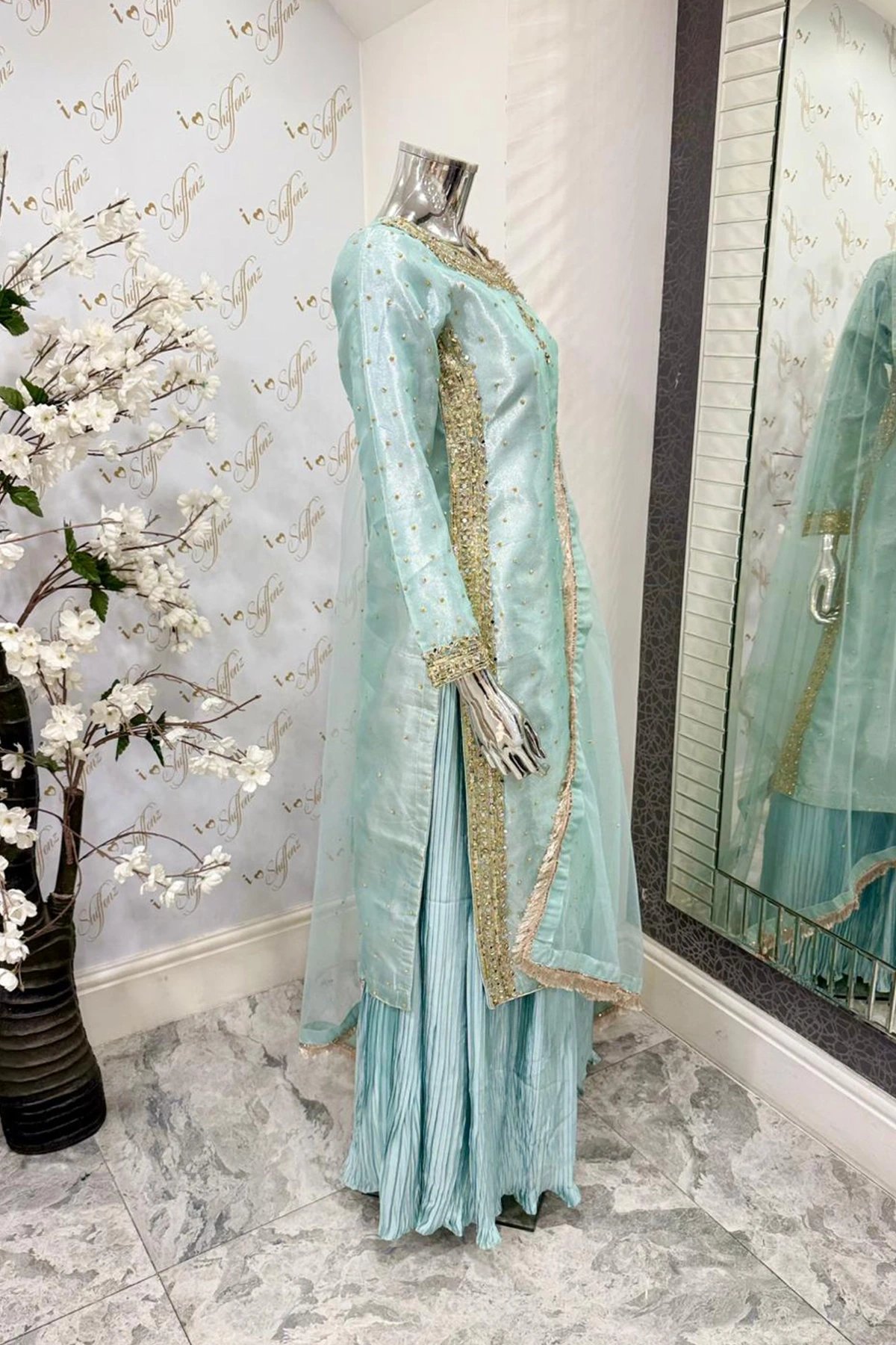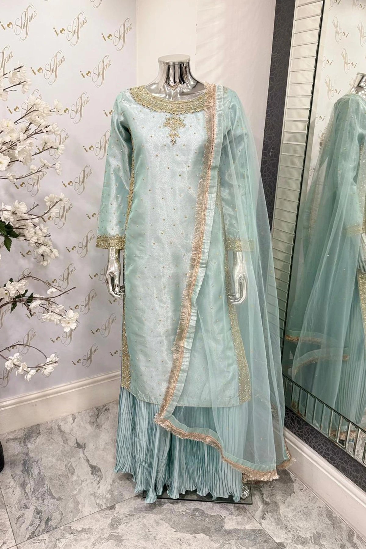 This beautiful 3 piece Hussain rehar inspired suit features a raw silk straight shirt with luxury dori work embroidery through out the front with scattered gold diamantés, finished with full length embroidered sleeves. Paired with a crinkled  lengha. The look is finished with an organza embroidered dupatta.
