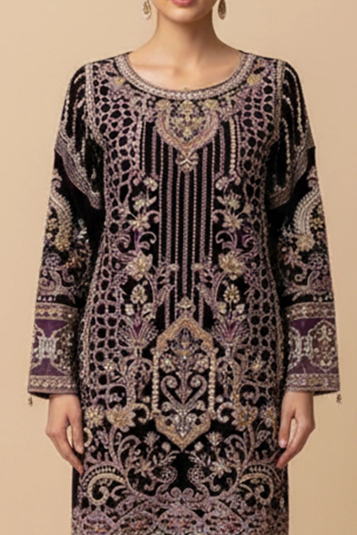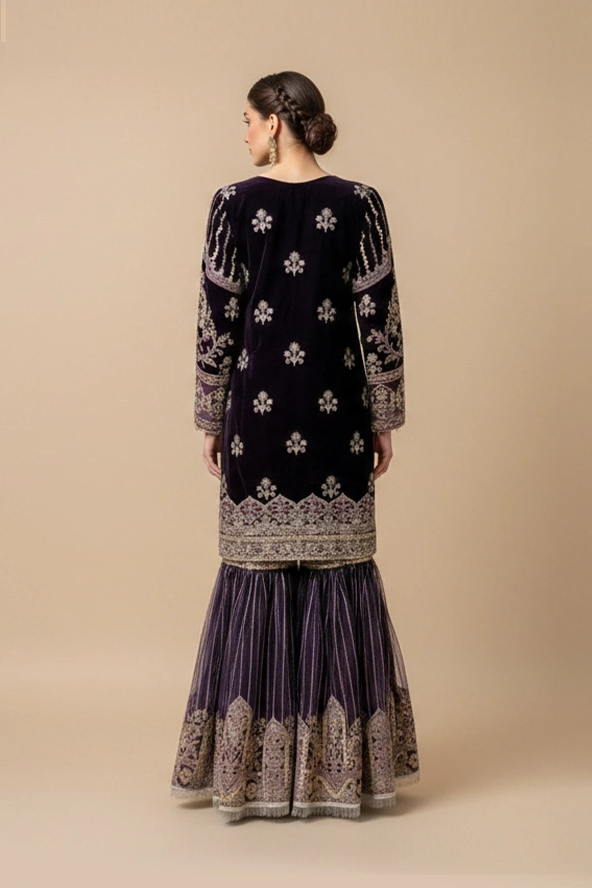 This beautiful 3 piece suit features a straight shirt with intricate embroidery, blending floral and geometric motifs that shimmer beautifully against the rich velvet base. Its structured silhouette pairs with a matching gharara, designed with elegant vertical pleats and a delicately embroidered hem for graceful movement. The look is finished with an embroidered heavy net dupatta.