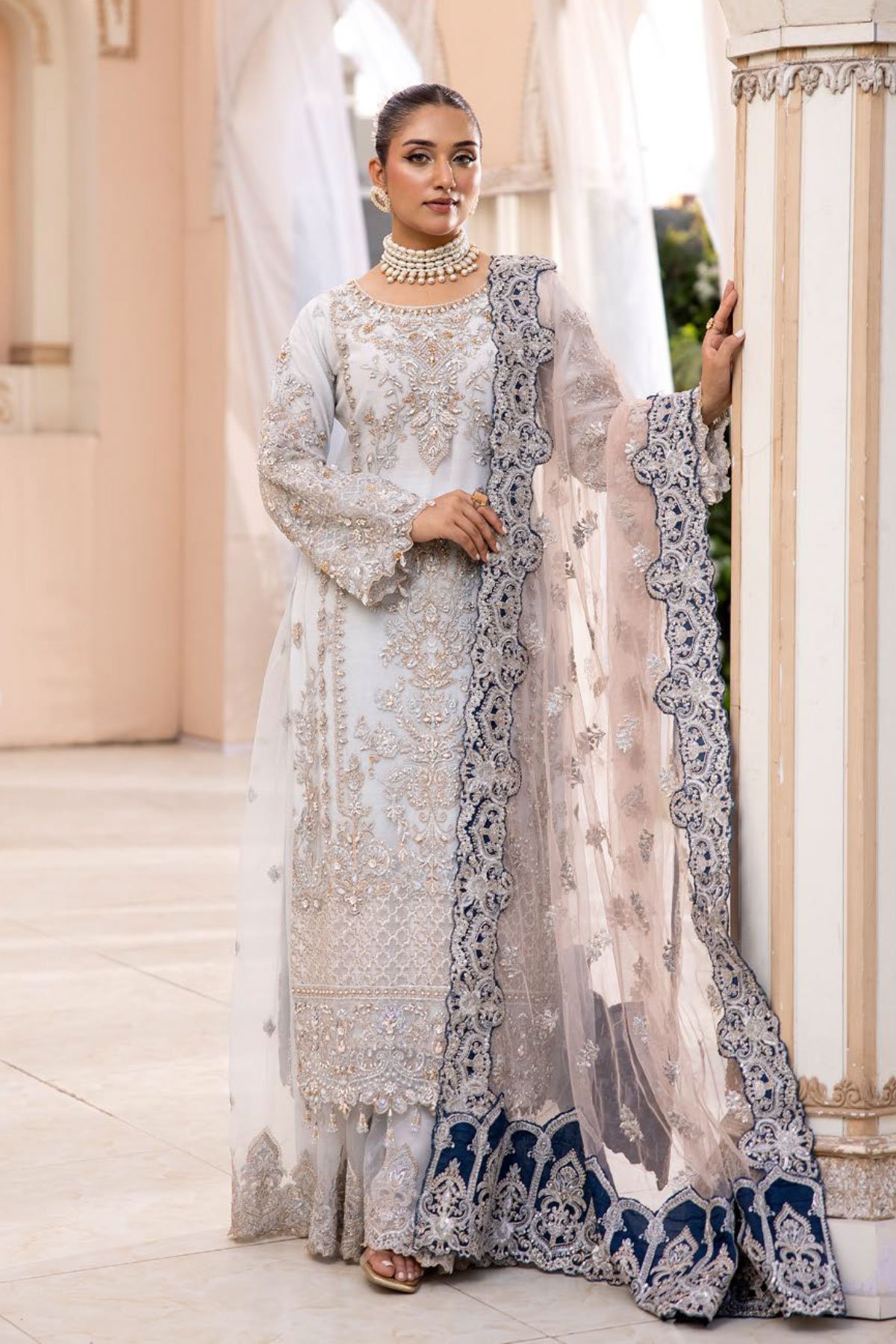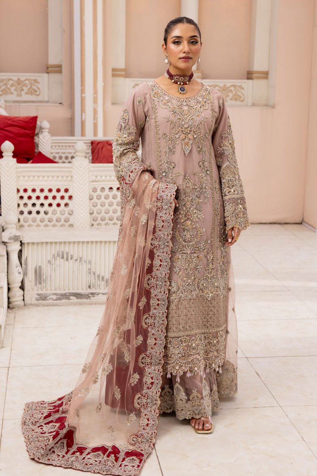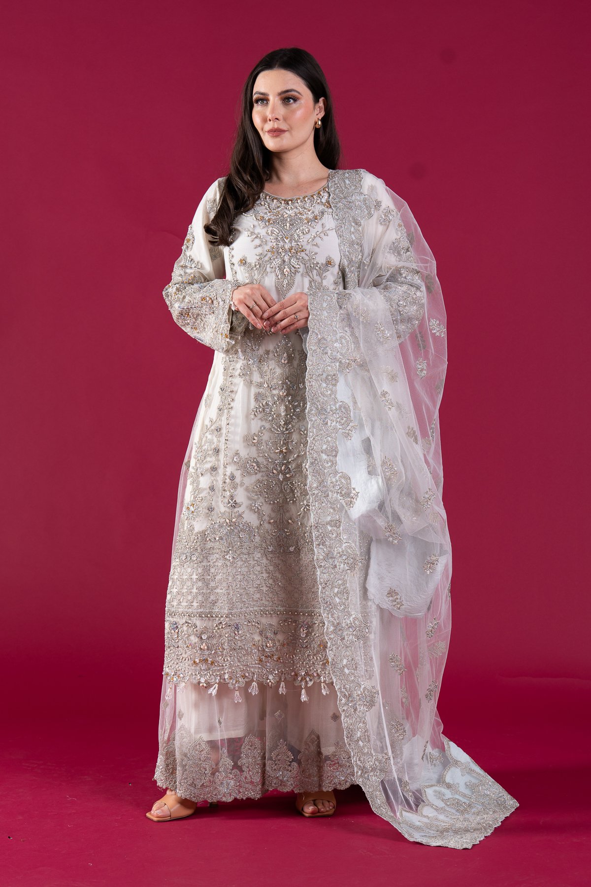 This beautiful 3 piece imrozia suit features a straight shirt with luxury beaded and thread work embroidered front, finished with dangling beads from the border and full length embroidered sleeves. It comes with a net embroidered sharara and the look is finished with a net embroidered dupatta.