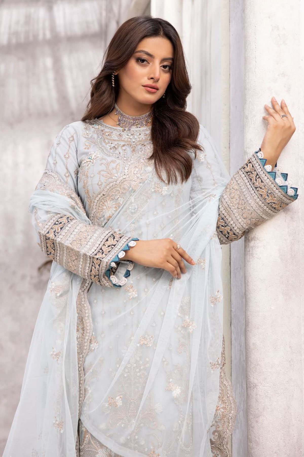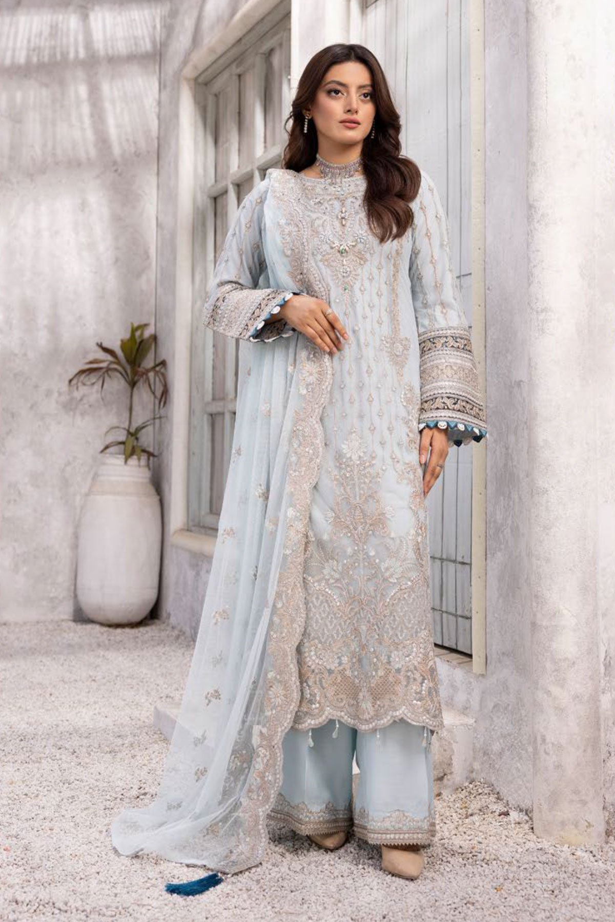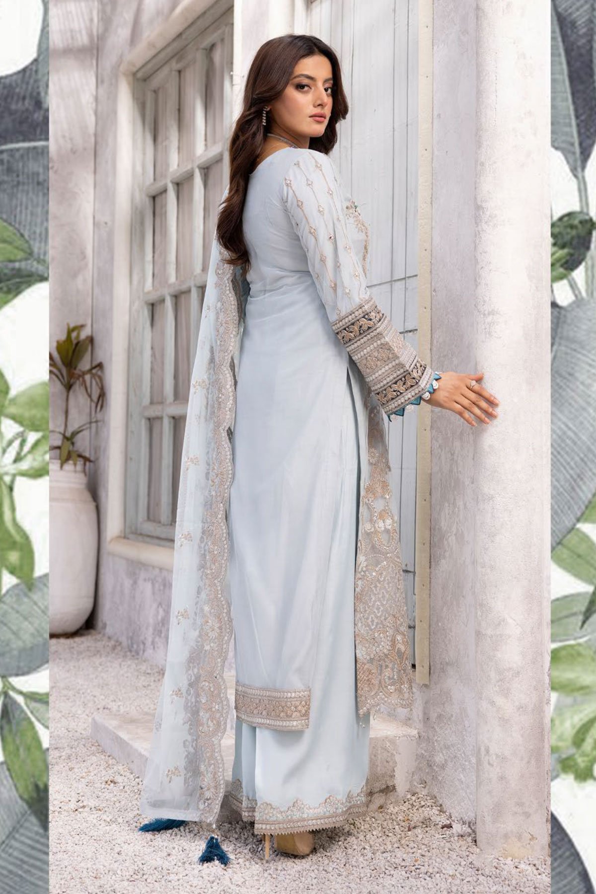 This beautiful 3 piece Imrozia collection features a straight shirt with luxury thread work embroidery throughout with bead embellishments, finished with full length embroidered sleeves. It comes with wide leg trousers and the look is finished with a chiffon embroidered dupatta.