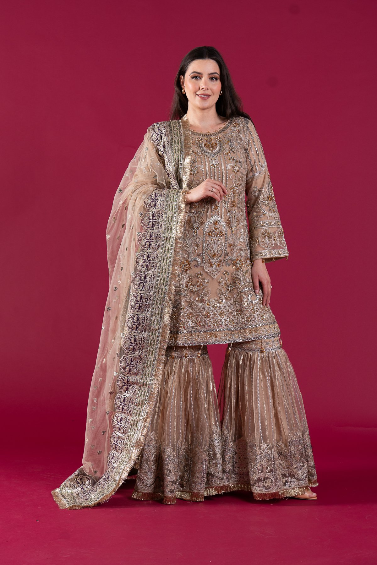 This beautiful 3 piece Imrozia collection suit features a straight shirt with luxury thread and bead work embroidered front, finished with dangling beads on the border. It comes with full length embroidered sleeves and an embroidered gharara. The look is finished with a net embroidered dupatta with a contrasted border.