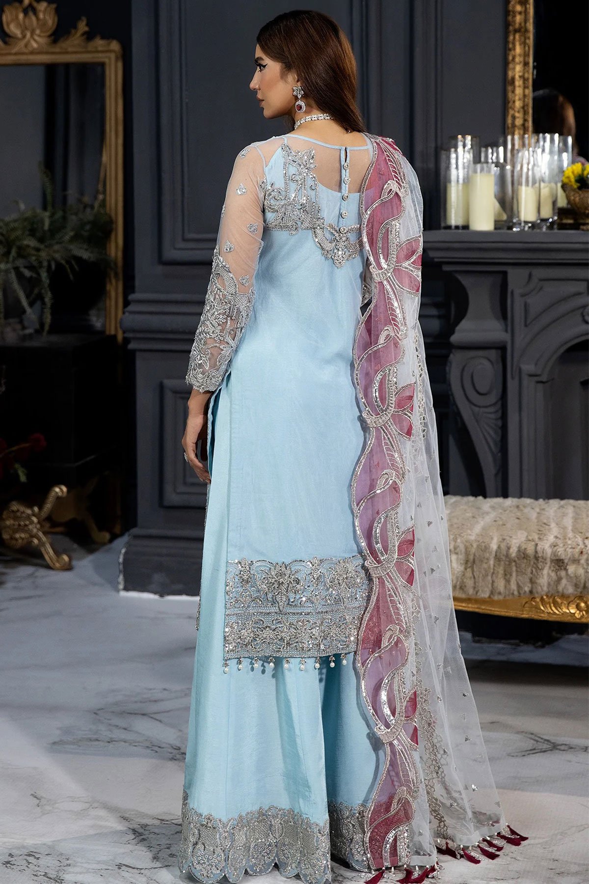 This beautiful 3 piece Imrozia collection suit features a straight shirt with luxury thread work embroidery along with sequence embellishment throughout the front along with full length sleeves. It comes with plazo trousers with an embroidered border and the look is finished with a net embroidered dupatta with a contrasted border.