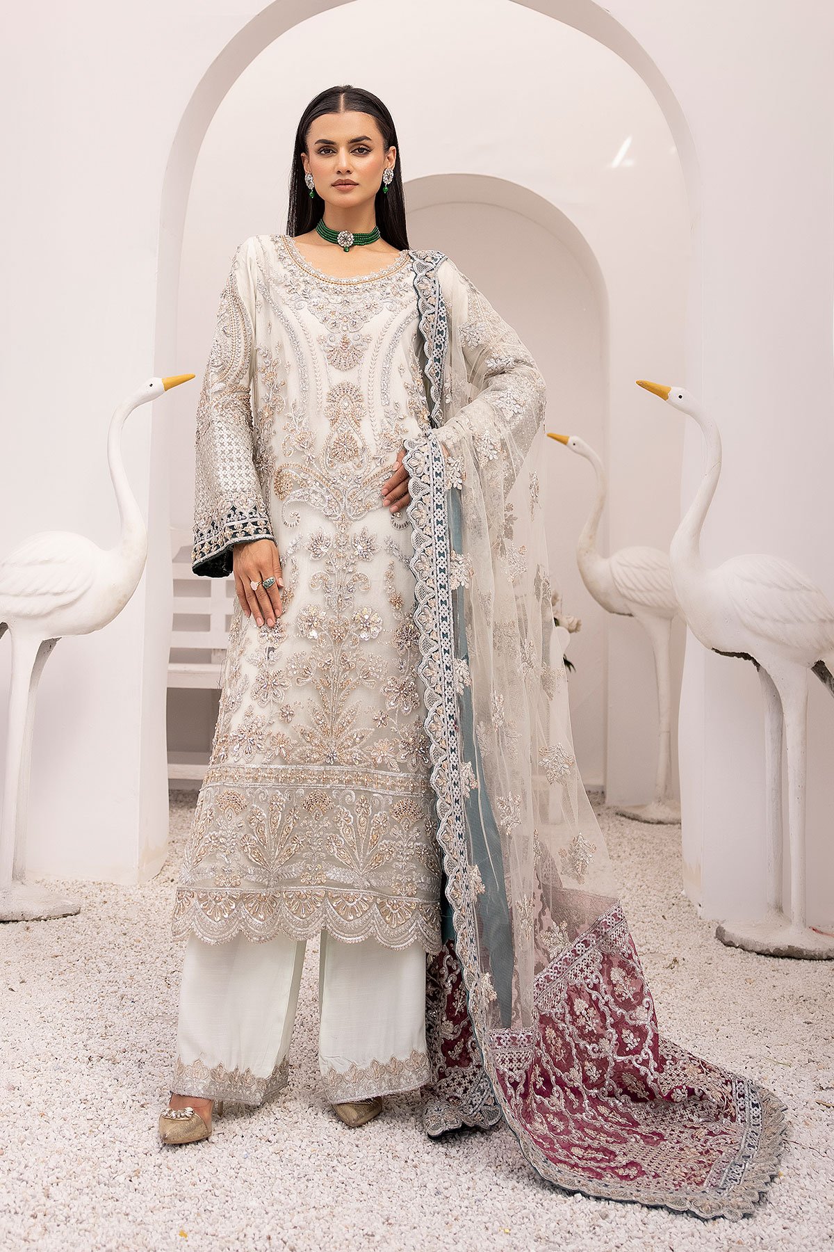 This beautiful 3 piece Imrozia suit features a straight shirt with luxury thread work embroidery along with bead embellishments, finished with full length embroidered sleeves. It comes with crepe plazo trousers and the look is finished with a net embroidered dupatta.