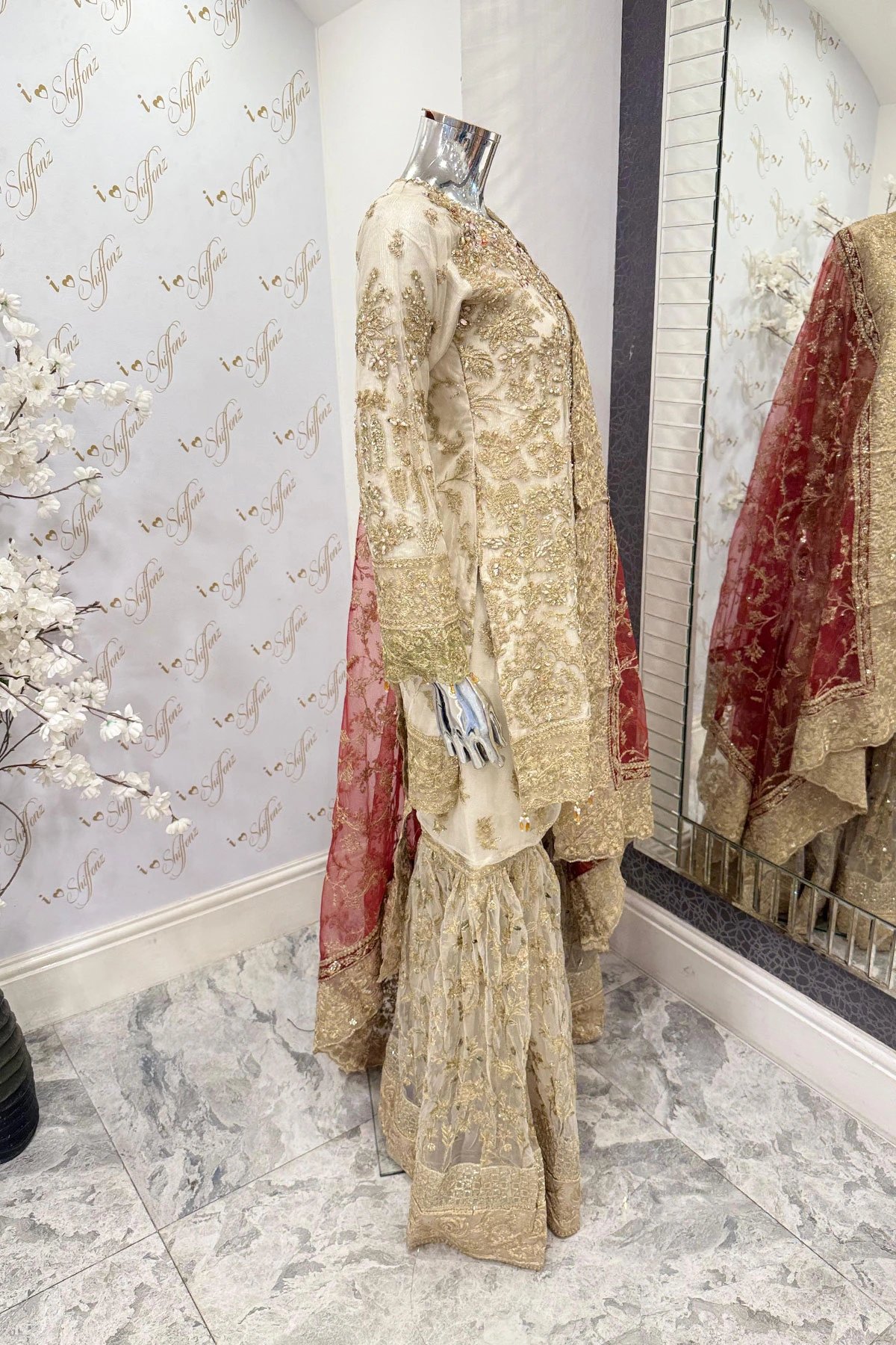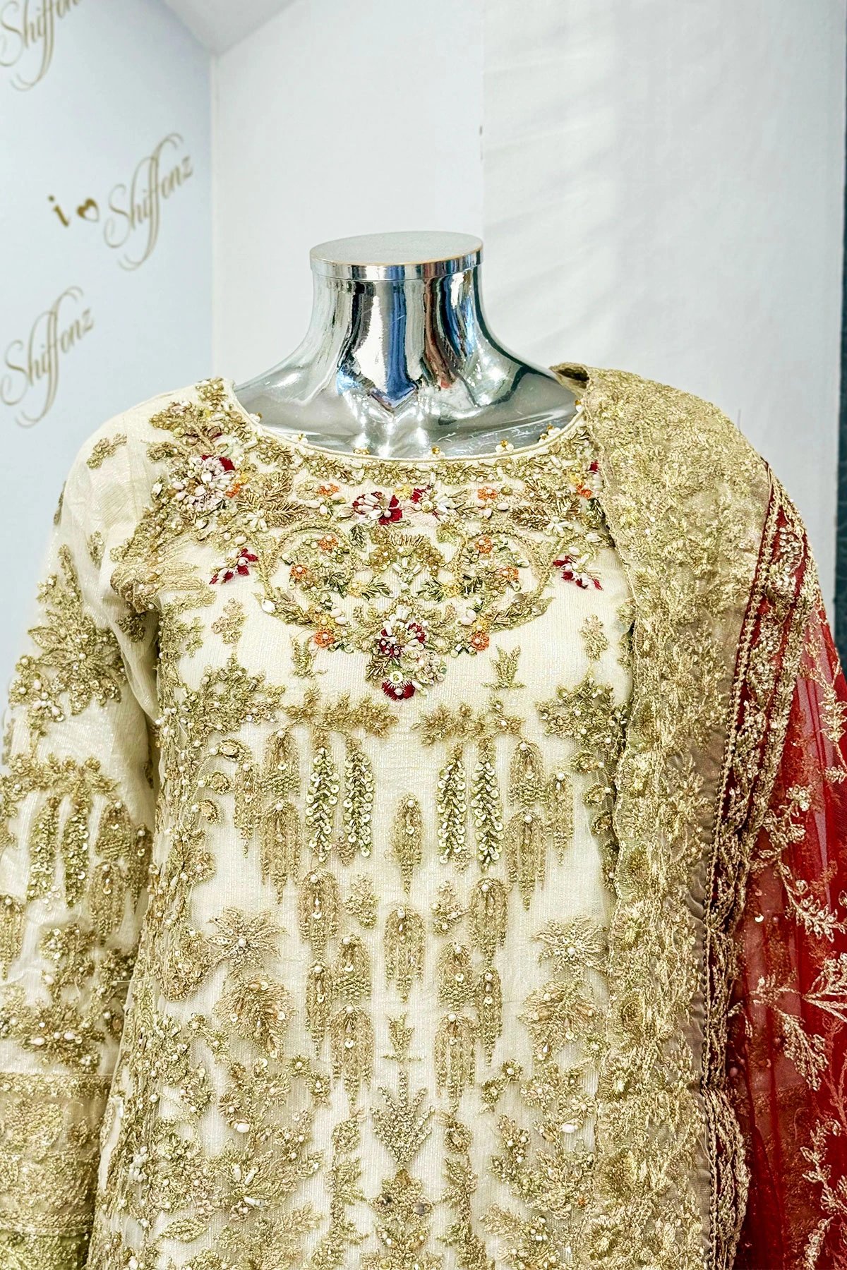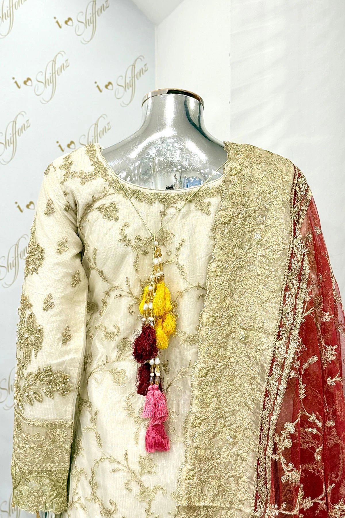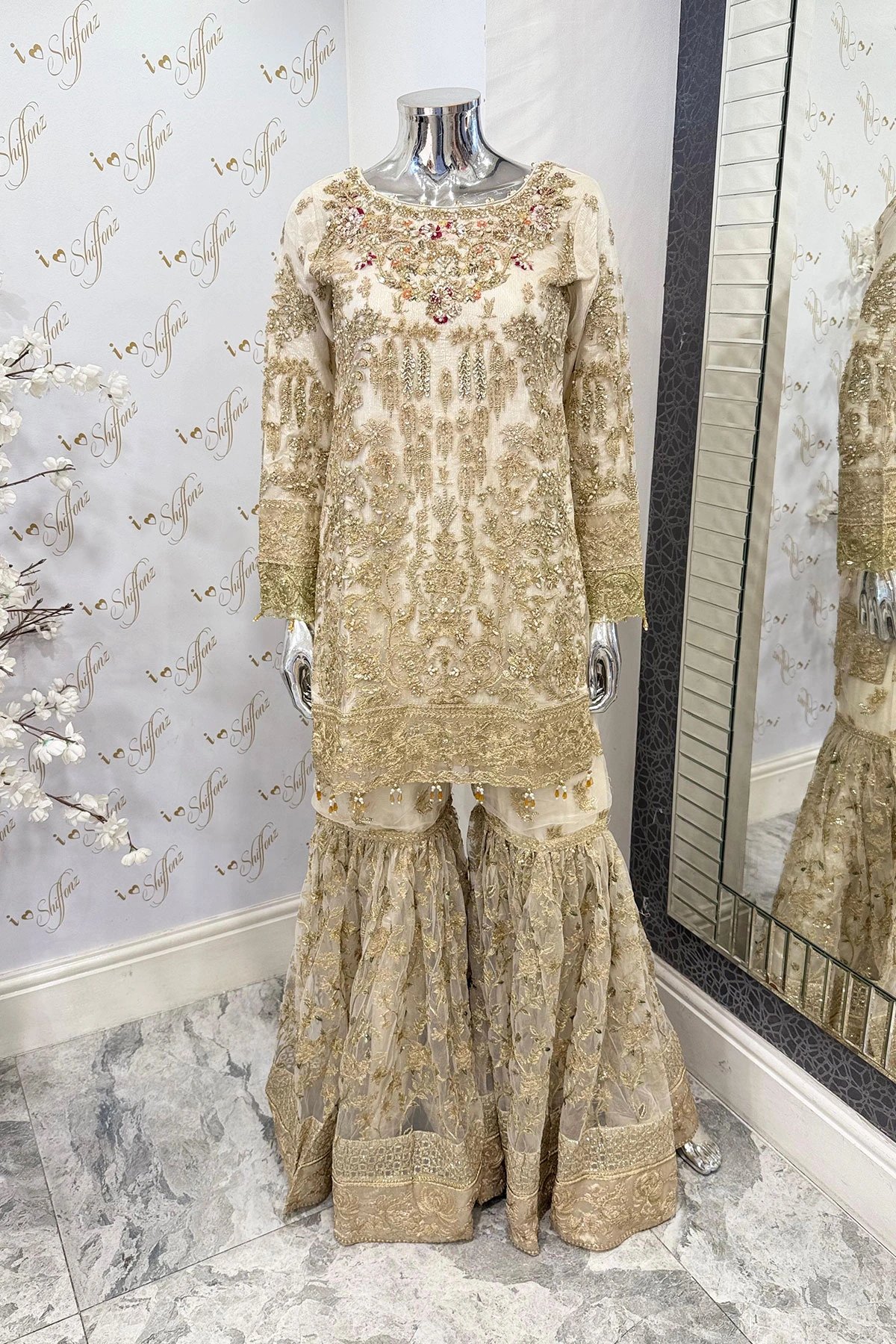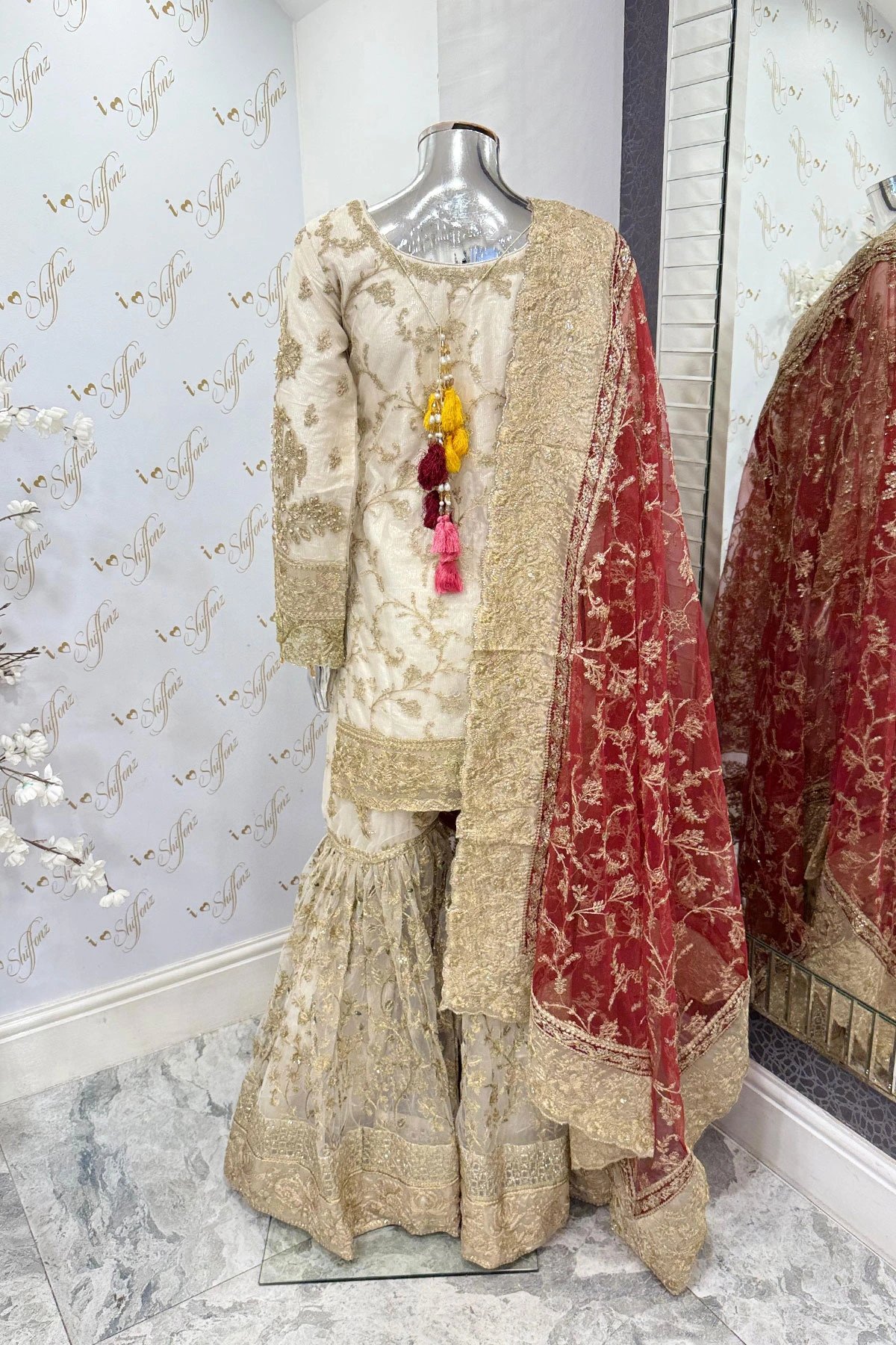 This beautiful 3 piece Imrozia suit features a straight net shirt with luxury thread work embroidery with pear and motif embellishments along with full length embroidered sleeves. Paired with an embroidered gharara. The look is finished with a contrasted embroidered net dupatta.