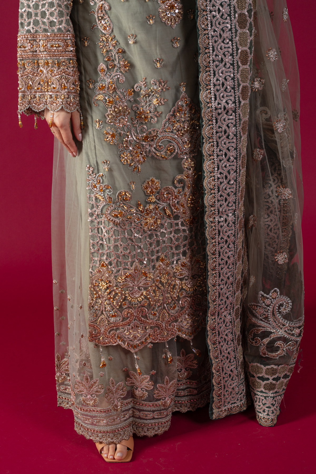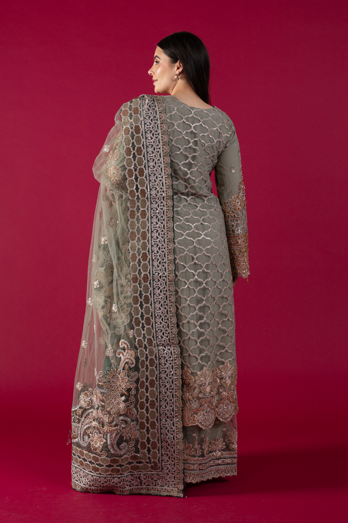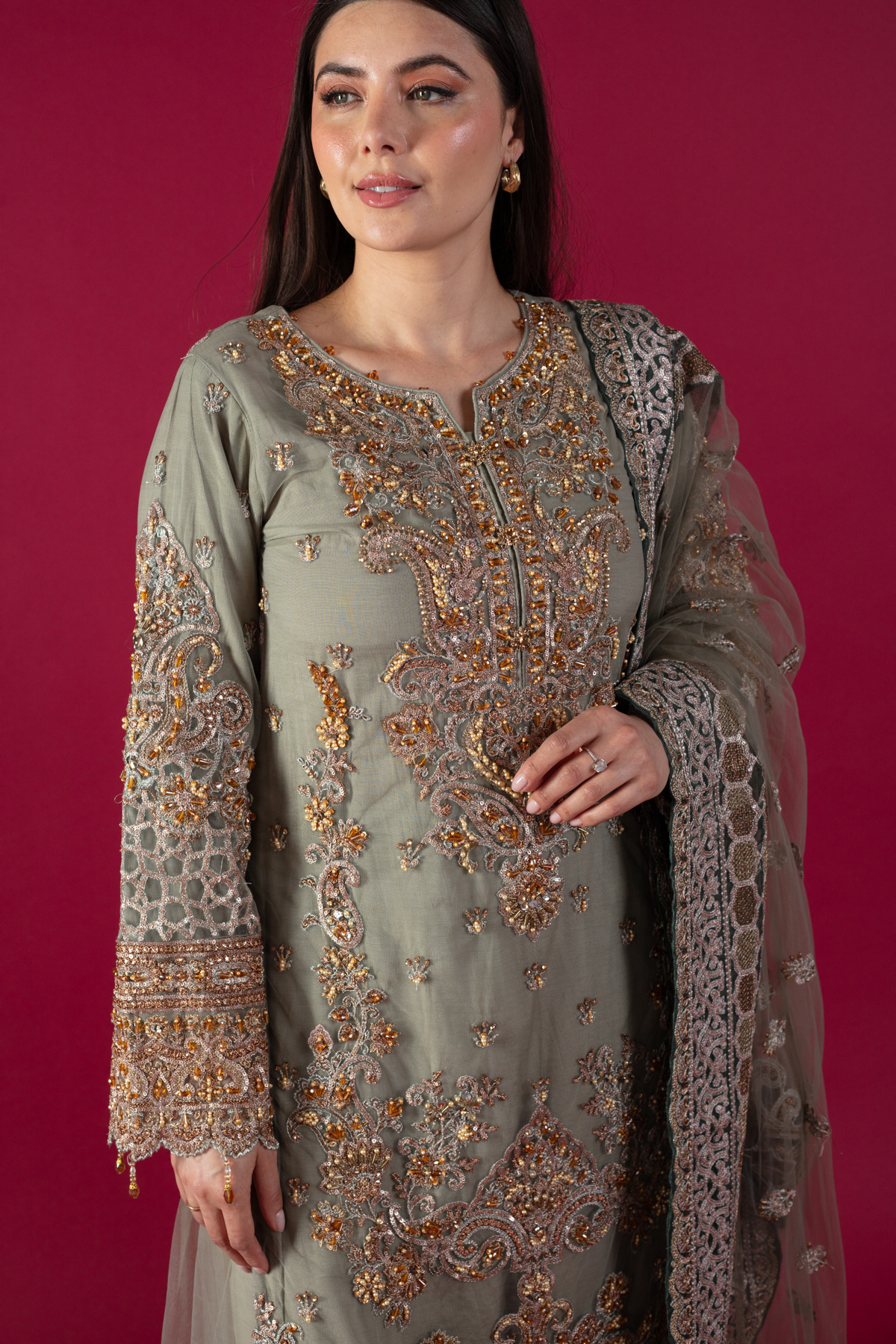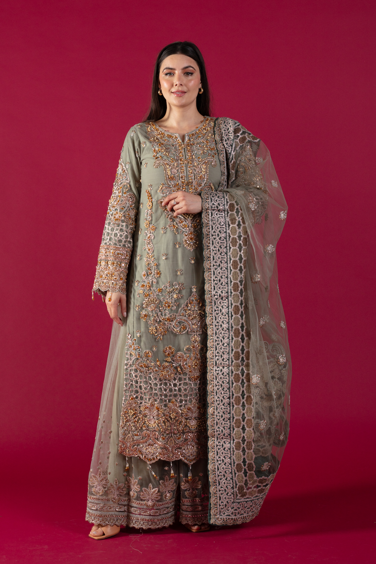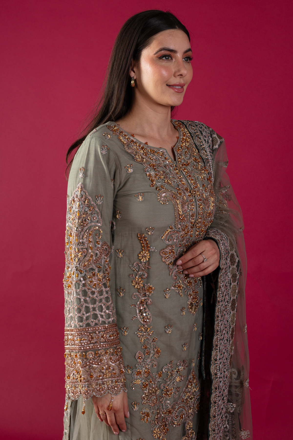 This beautiful 3-piece imrozia suit features a straight shirt with luxury thread work embroidery with bead work embellishments throughout, finished with full length embroidered sleeves. Paired with an embroidered net sharara and the look is finished with a net embroidered dupatta.