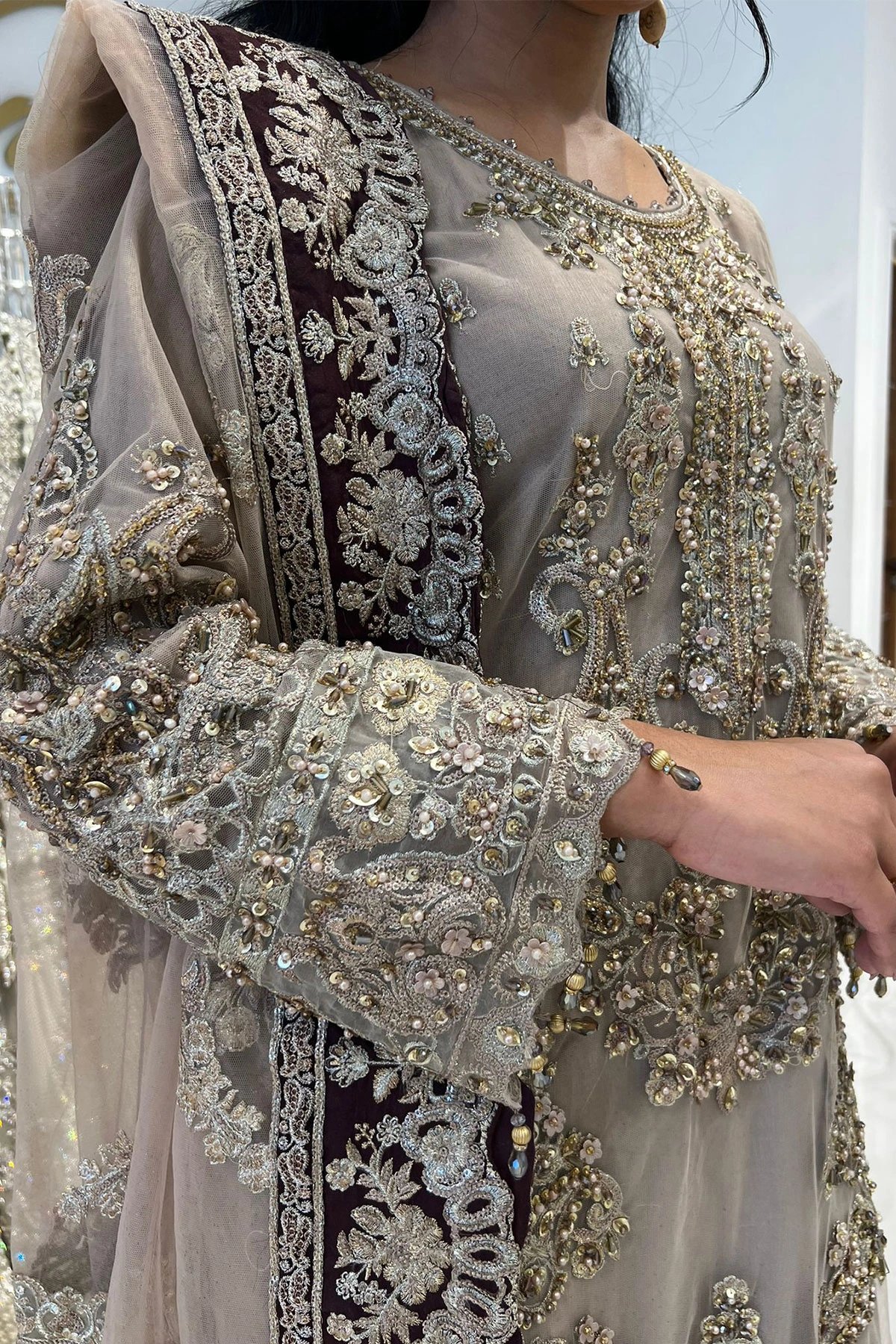 This beautiful 3 piece suit features a net shirt adorned with intricate all-over beadwork, creating a refined and graceful look. The crepe plazo trouser is designed with delicate threadwork embroidered patch on the border, adding a touch of sophistication. Completing the ensemble is a net dupatta, finished with a heavy border and exquisite threadwork for an elegant appeal.