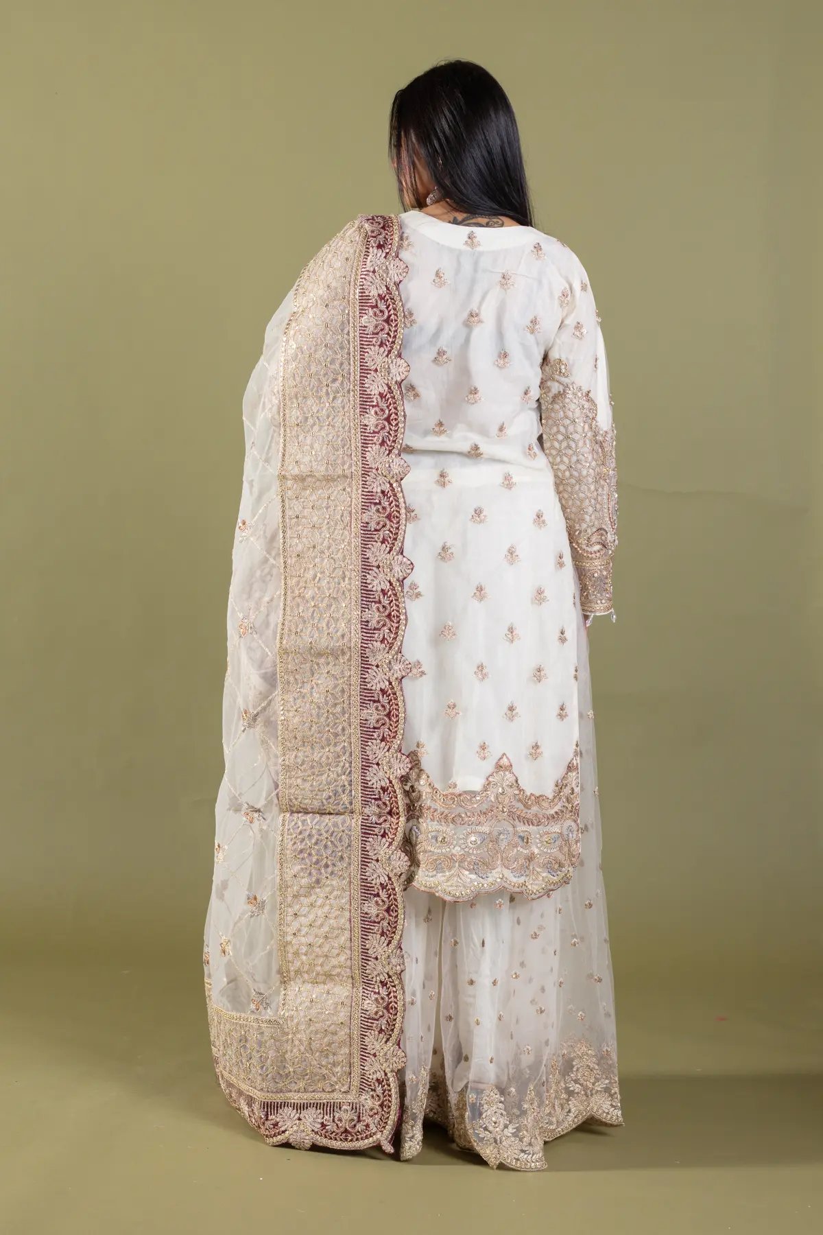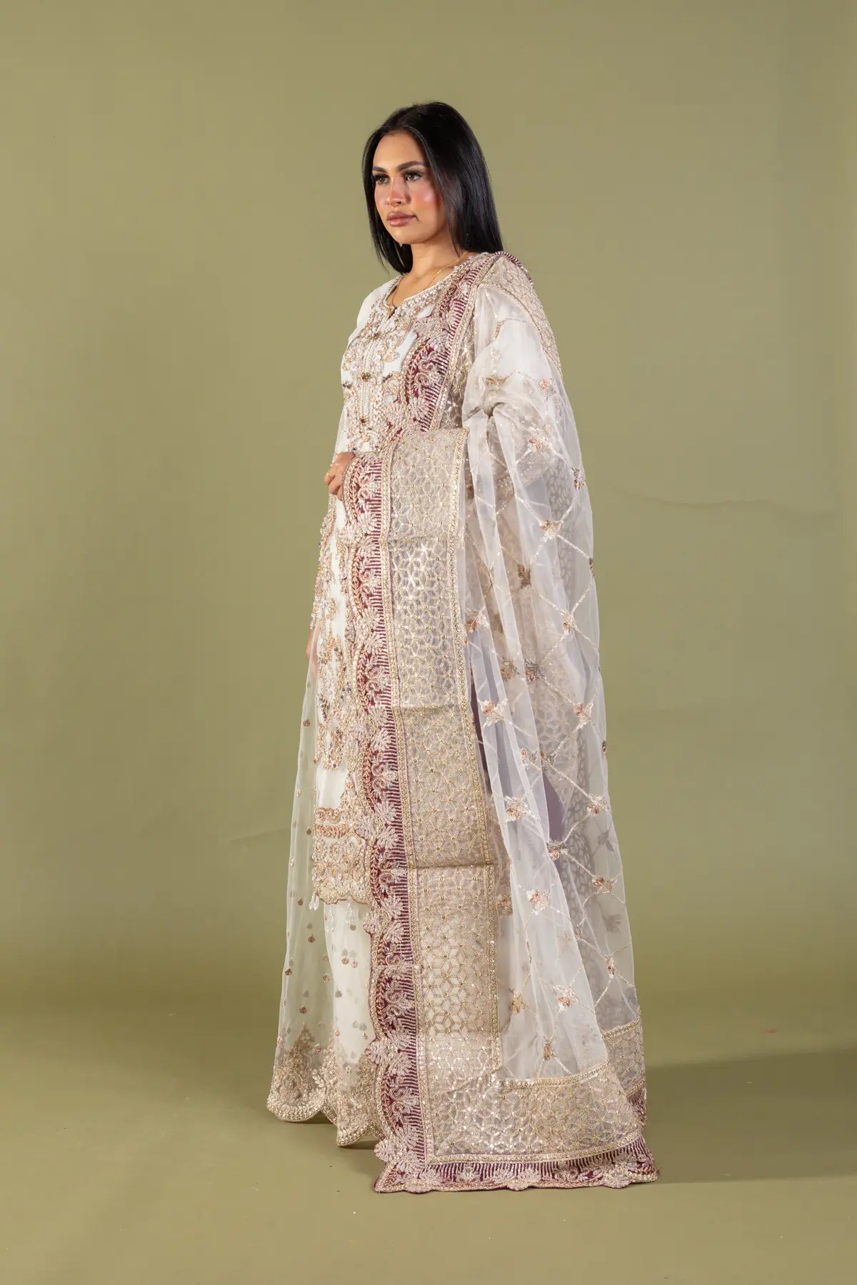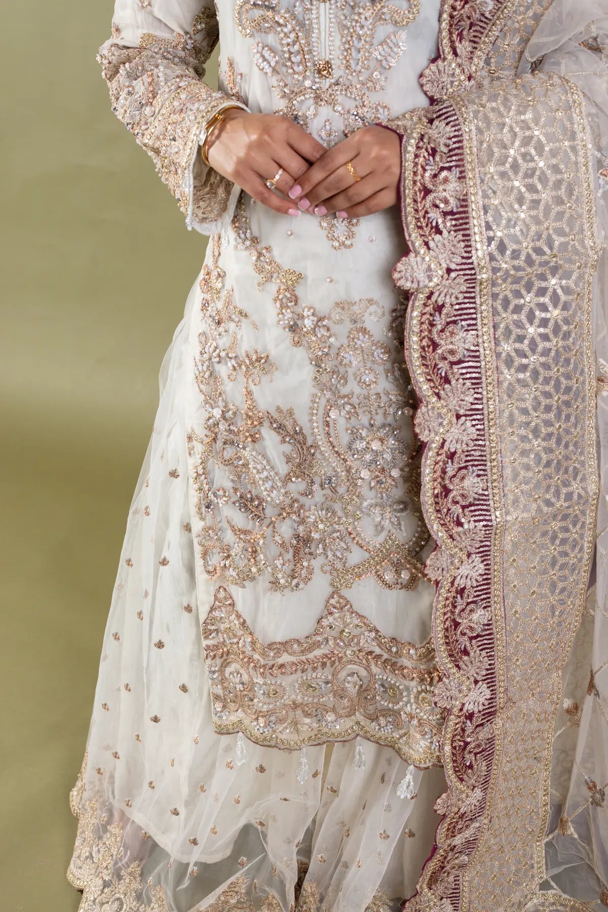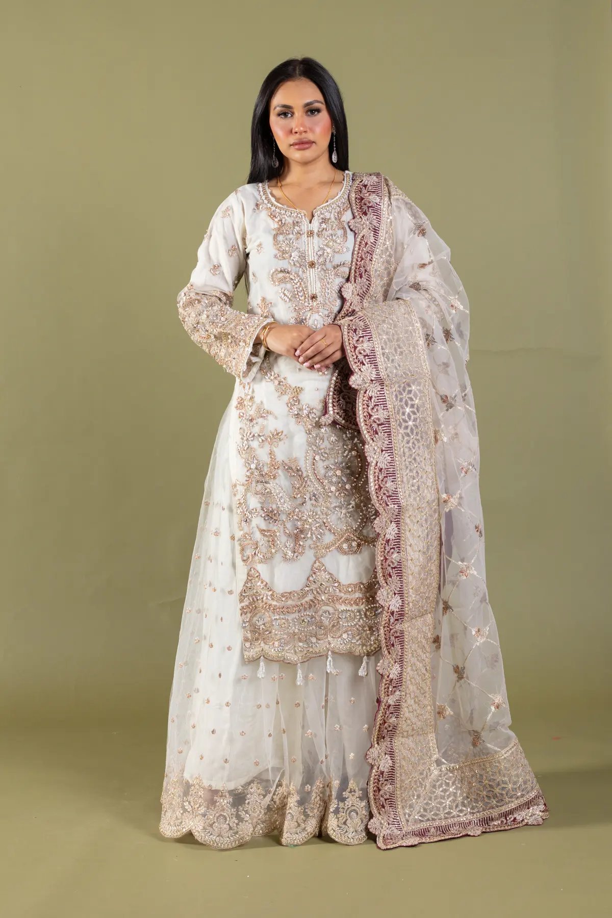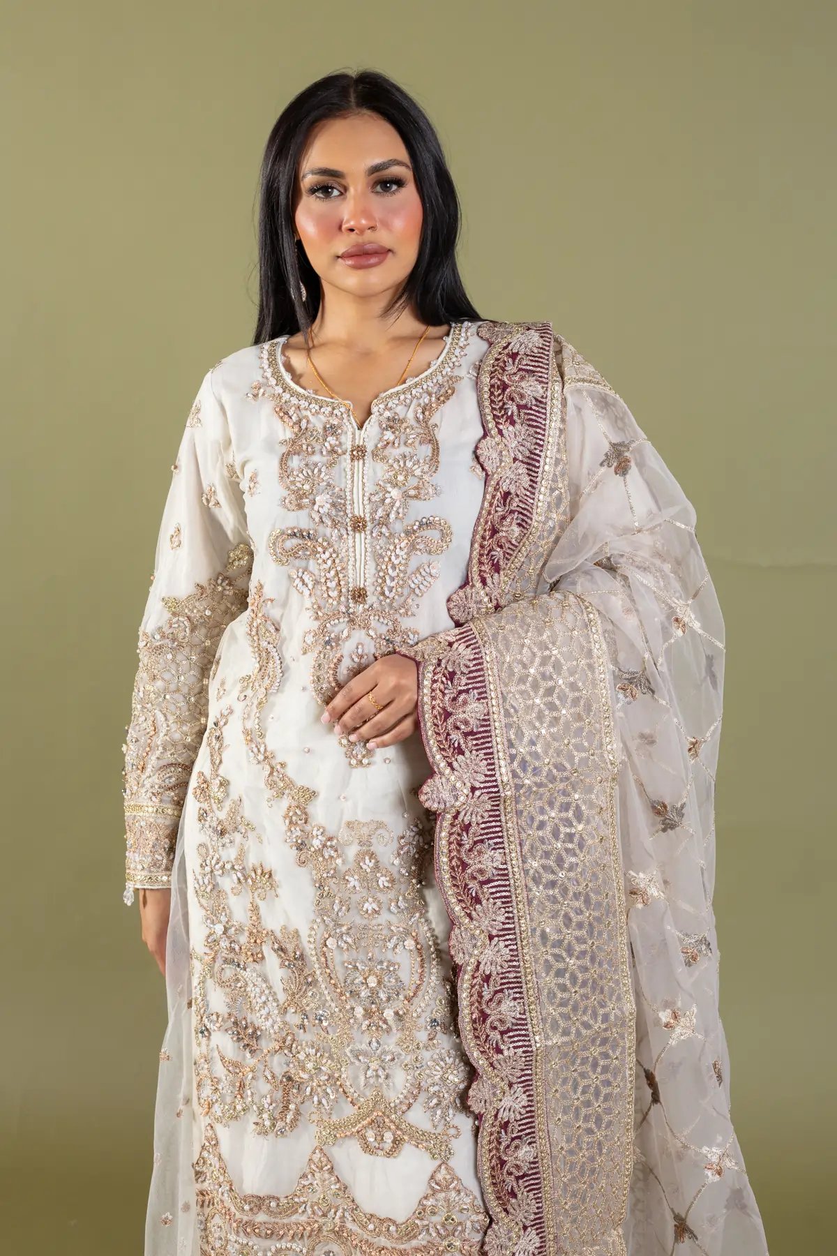 This beautiful 3-piece imrozia suit features a net shirt adorned with intricate all-over beadwork, creating a refined and graceful look along with detailed button embellishments along the middle. The net sharara is designed with delicate threadwork on the top, adding a touch of sophistication. Completing the ensemble is a net dupatta, finished with a heavy border and exquisite thread work for an elegant appeal.