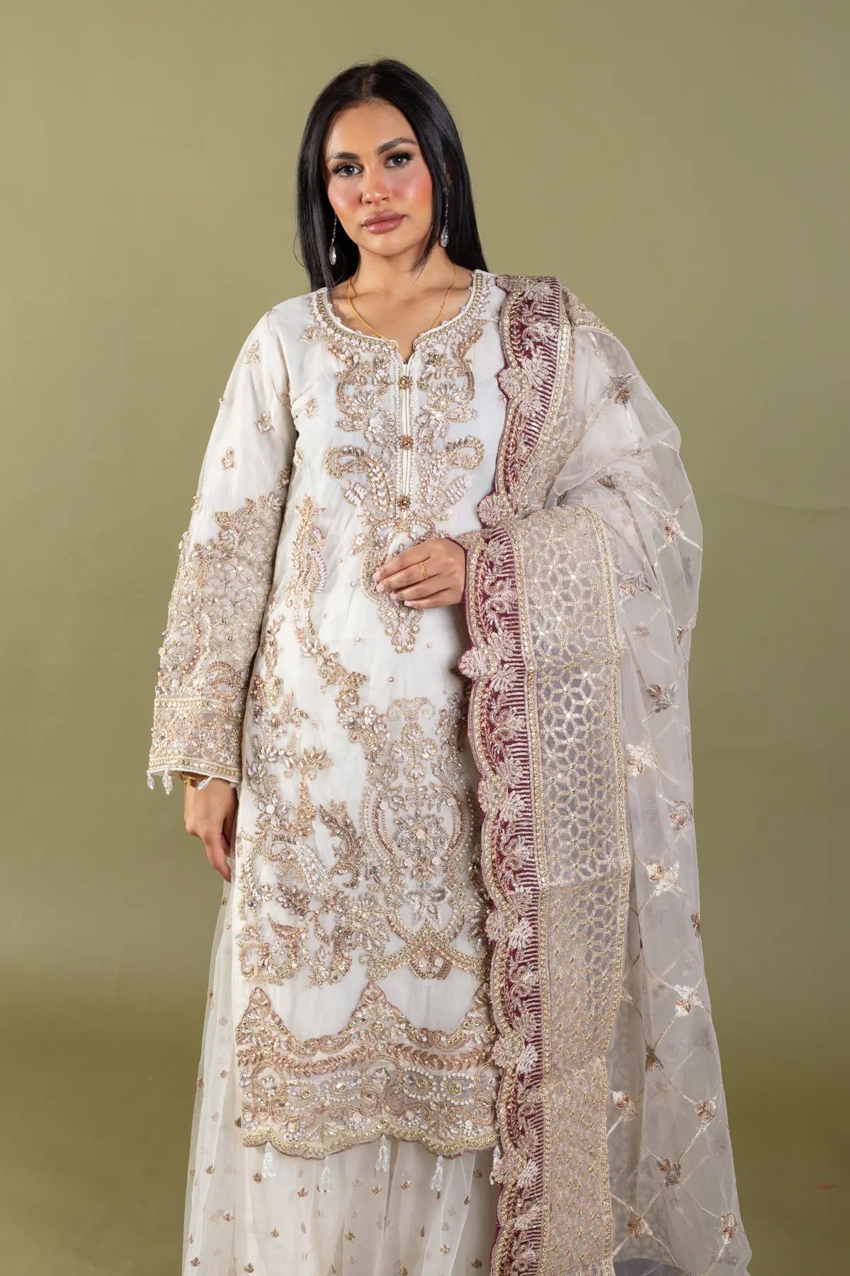 This beautiful 3-piece imrozia suit features a net shirt adorned with intricate all-over beadwork, creating a refined and graceful look along with detailed button embellishments along the middle. The net sharara is designed with delicate threadwork on the top, adding a touch of sophistication. Completing the ensemble is a net dupatta, finished with a heavy border and exquisite thread work for an elegant appeal.