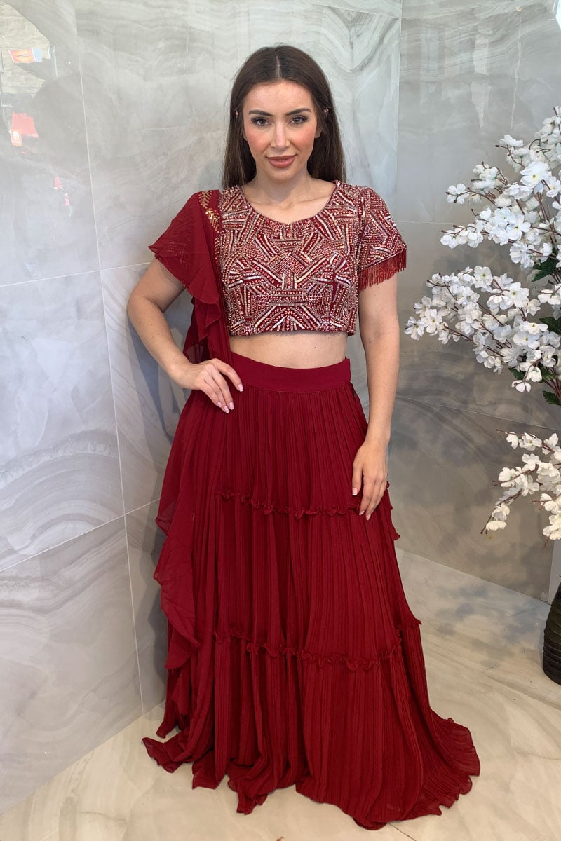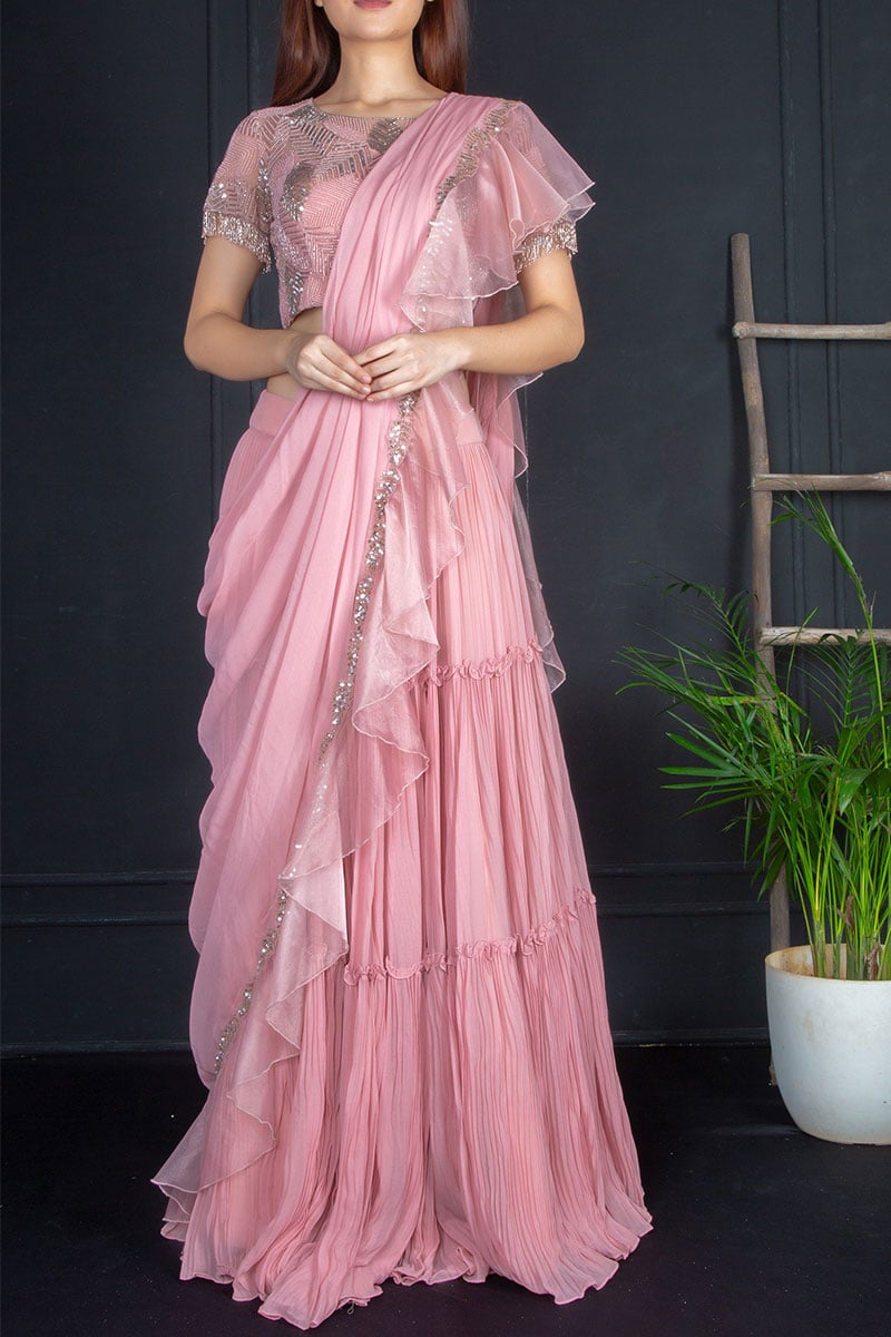 This beautiful indo western saree features a short blouse with lxuury beaded and sequin embroidery throughout the front, back and short length sleeves, finished with ruffled pallu and bottom saree.