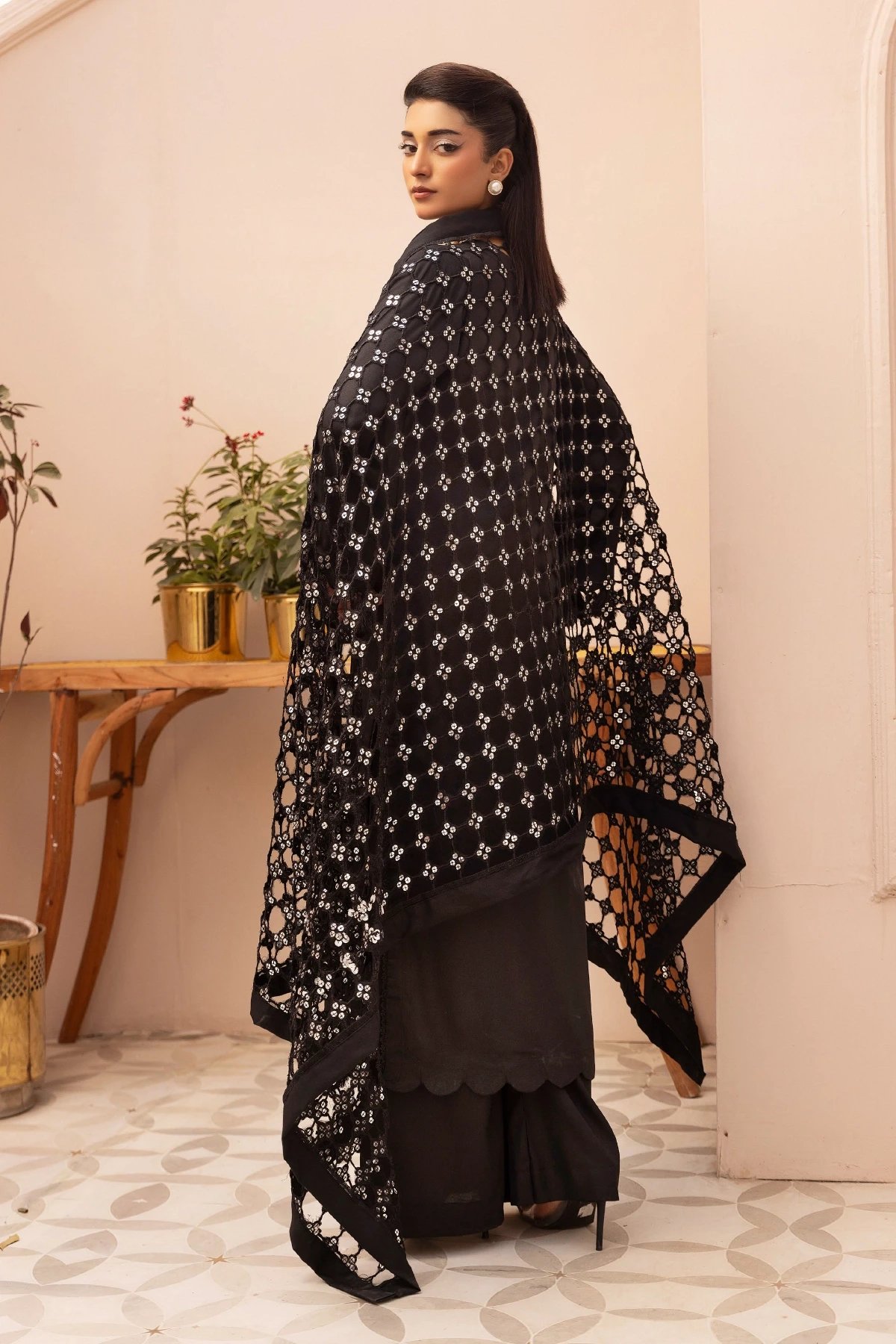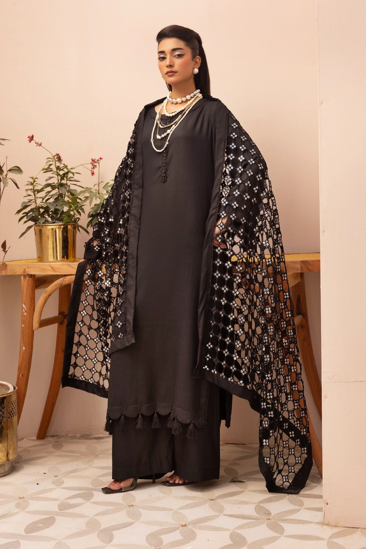 This beautiful 3 piece winter collection suit features a straight shirt with bead embellishments on the front, finished with tassel embellishment on the border and cuffs of full length sleeves. Paired with straight leg trousers. The look is finished with a cut work embroidered dupatta.