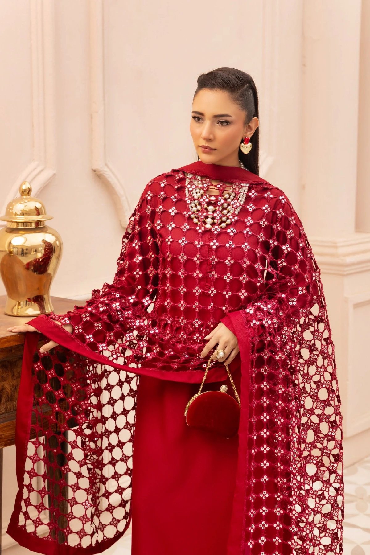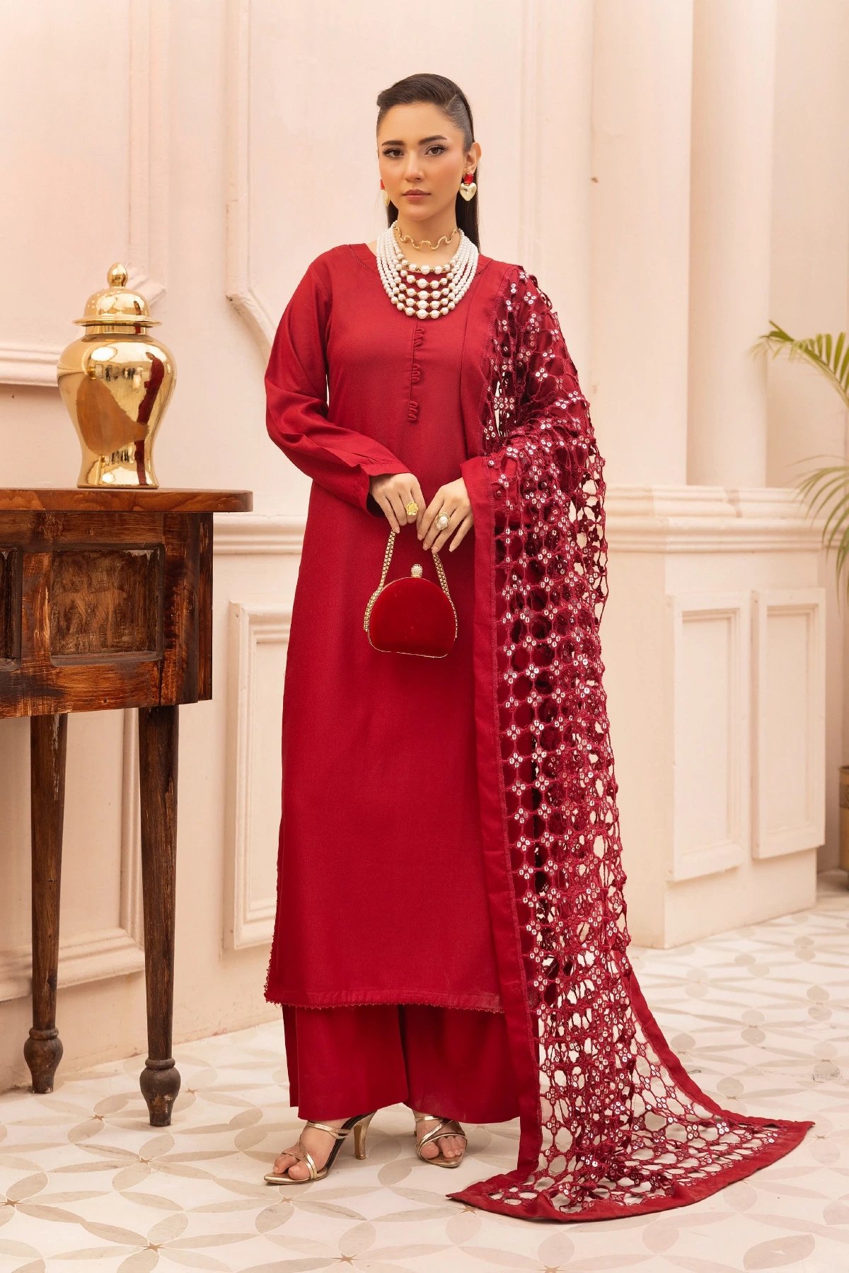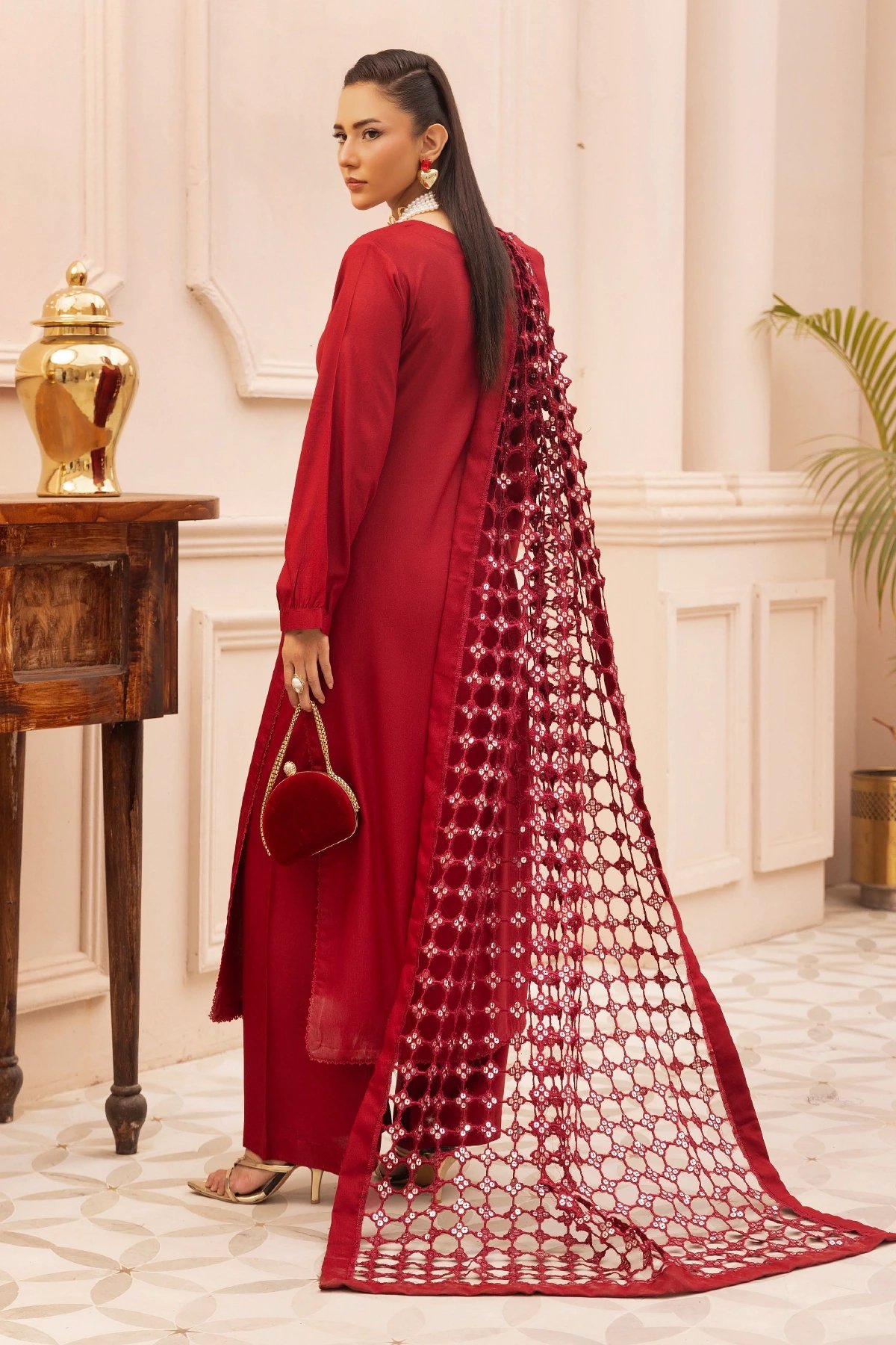 This beautiful 3 piece winter collection suit features a straight shirt with bead embellishments on the front, finished with tassel embellishment on the border and cuffs of full length sleeves. Paired with straight leg trousers. The look is finished with a cut work embroidered dupatta.