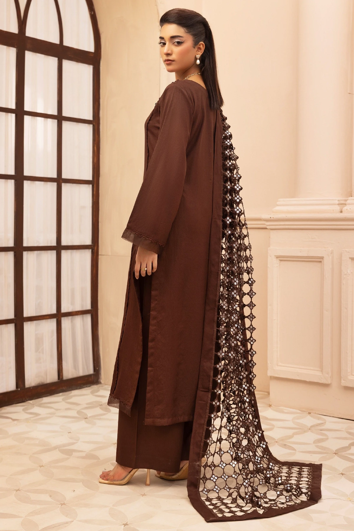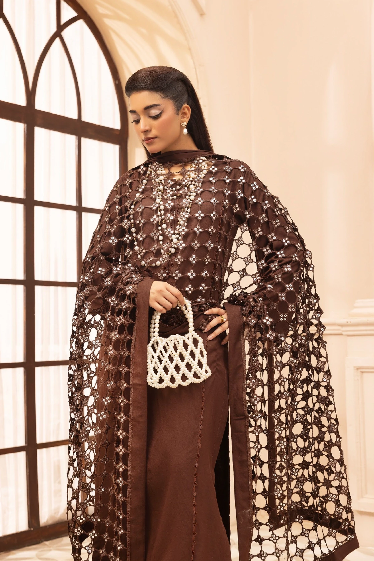 This beautiful 3 piece winter collection suit features a straight shirt with bead embellishments on the front, finished with tassel embellishment on the border and cuffs of full length sleeves. Paired with straight leg trousers. The look is finished with a cut work embroidered dupatta.