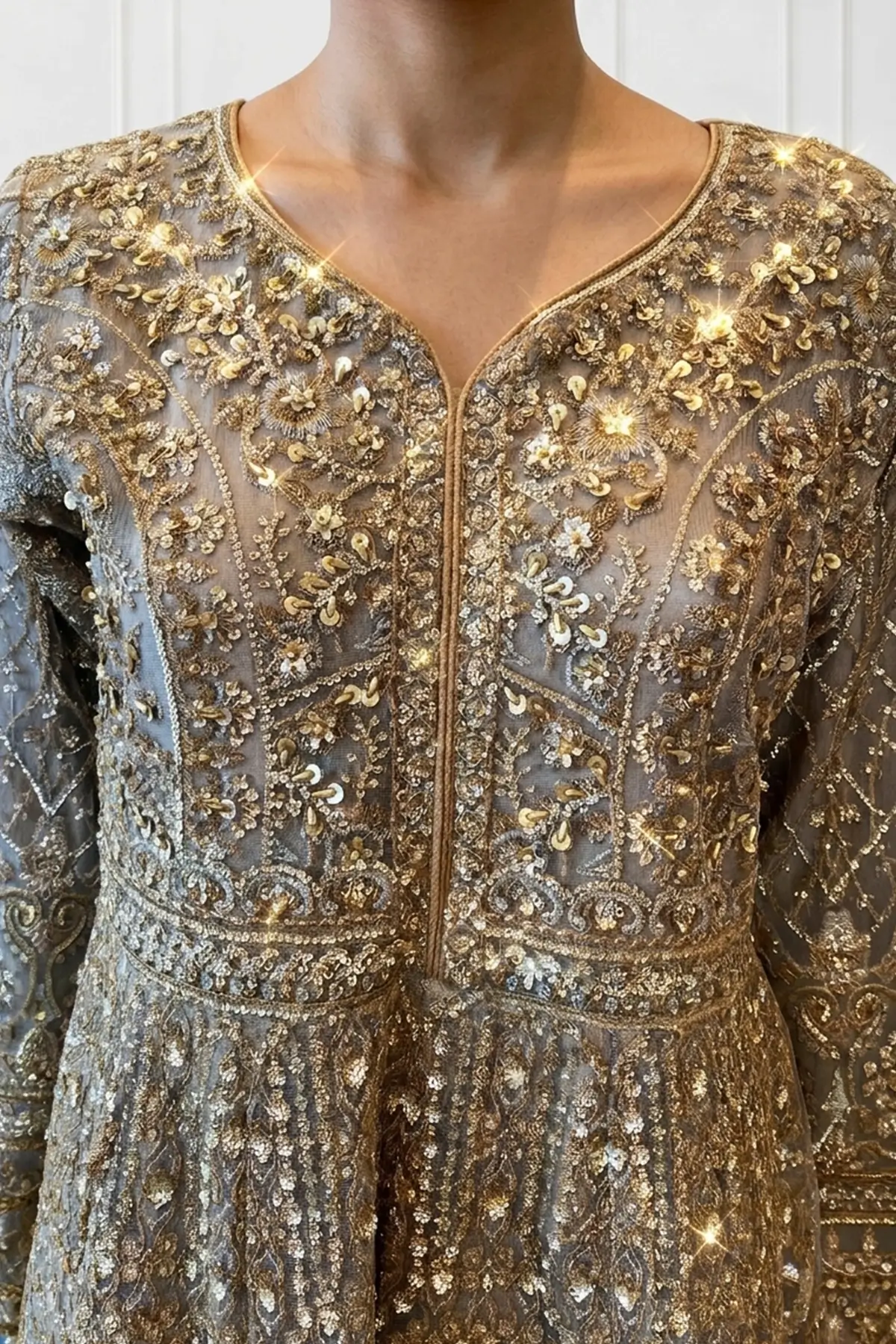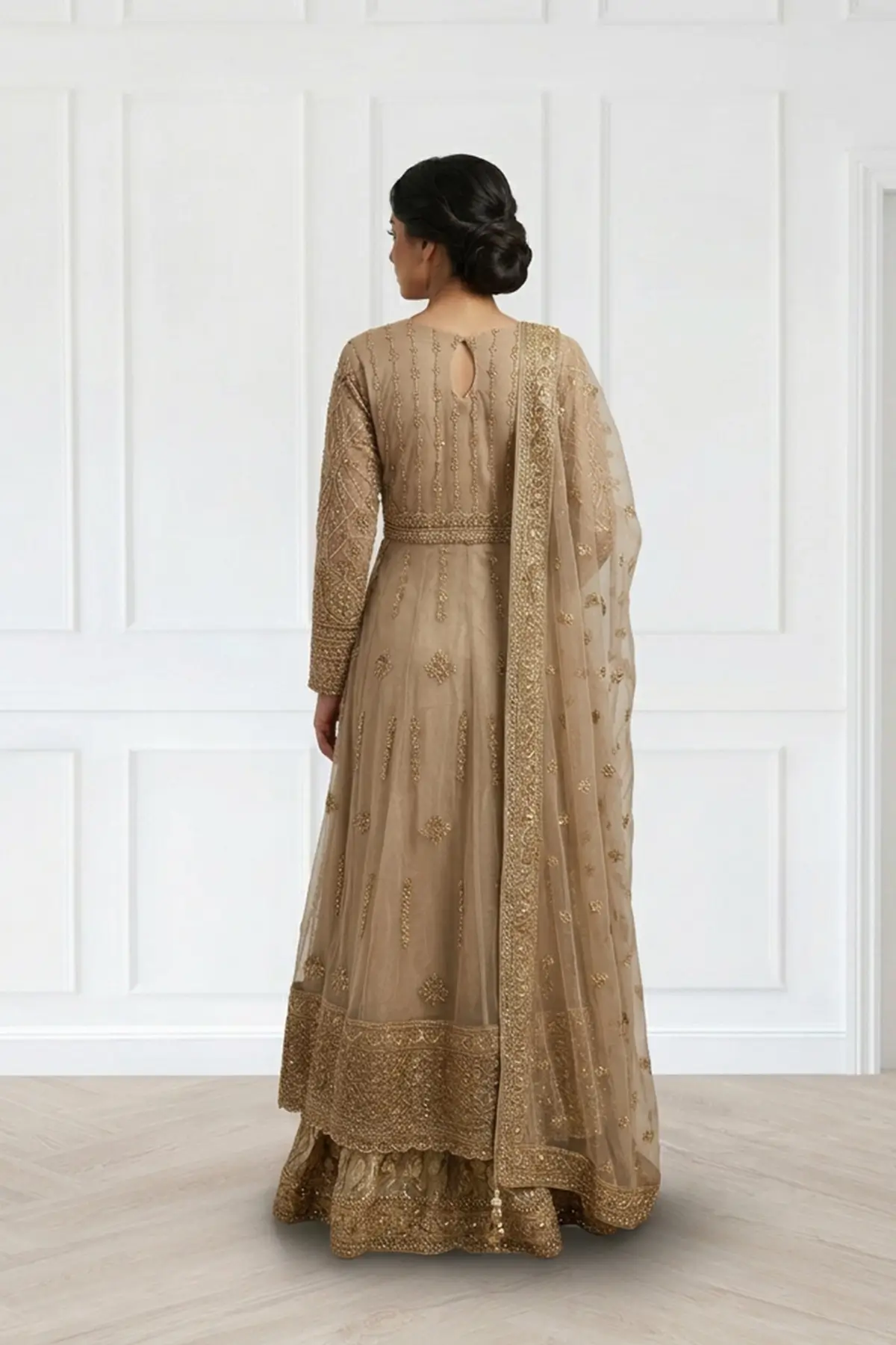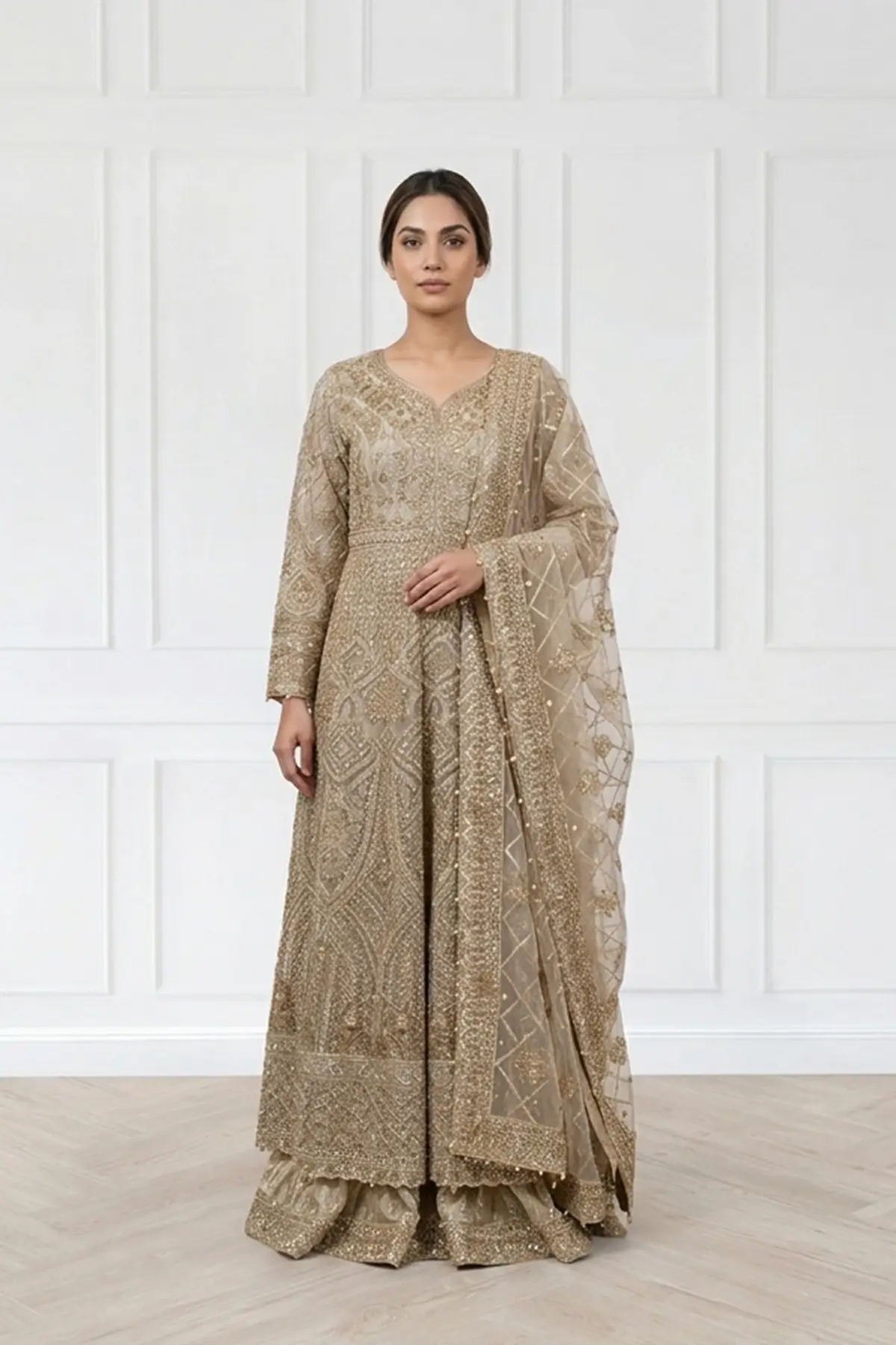 This beautiful net peplum gown is crafted with intricate embroidery that highlights delicate motifs across the bodice, full embroidered sleeves, and hem, giving the silhouette a rich, refined finish. The peplum slit front cut adds graceful structure, creating a flattering shape that flows beautifully. Paired with tissue foil printed flared plazo trousers with an embroidered border. The look is finished with an embroidered net dupatta, detailed with ornate borders and subtle motifs that enhance the outfit’s overall sophistication.