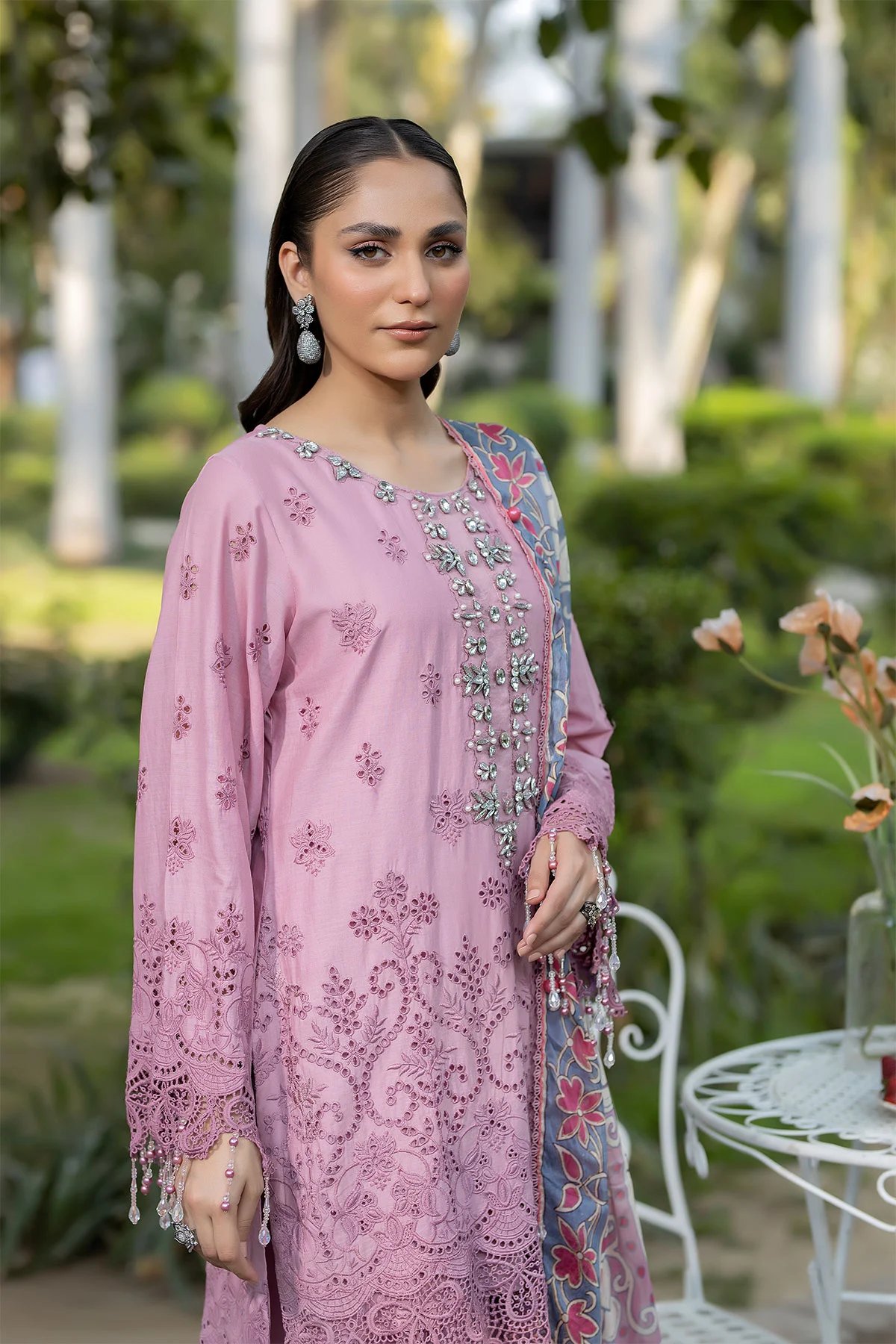 This beautiful 3 piece Ivana luxe collection features a straight Chikan Kari embroidered shirt with luxury stone work embellishments along the front, finished with dangling tassels on the border. It comes with full length embroidered sleeves. Paired with a farshi shalwar and the look is finished with a chiffon digital printed dupatta. Perfect attire for this Eid.