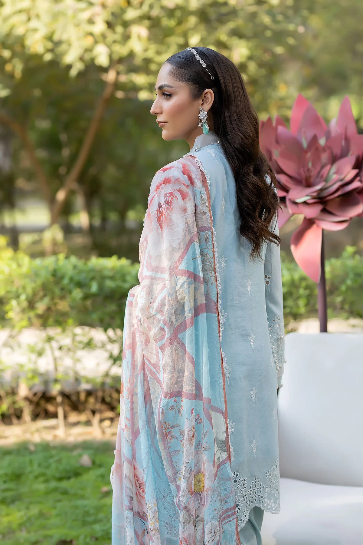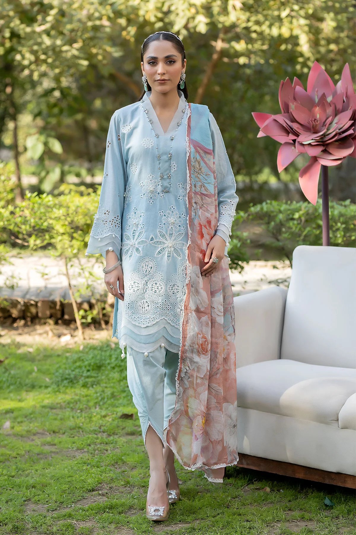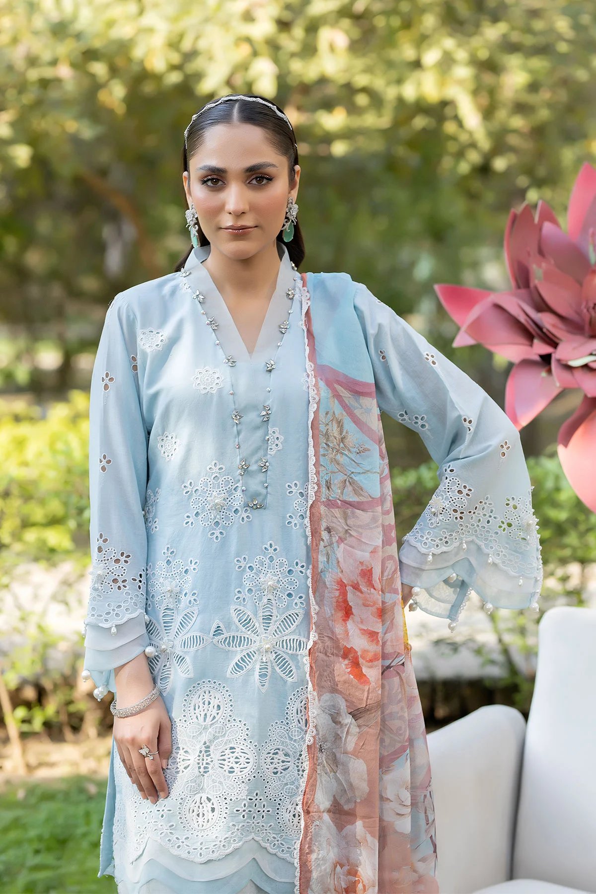 This beautiful 3 piece Ivana luxe collection features a straight Chikan Kari embroidered shirt with luxury stone work embellishments along the mandarin neckline, finished with dangling beads on the border. It comes with full length embroidered sleeves. Paired with a tulip shalwar and the look is finished with a contrasted chiffon digital printed dupatta. Perfect attire for this Eid.