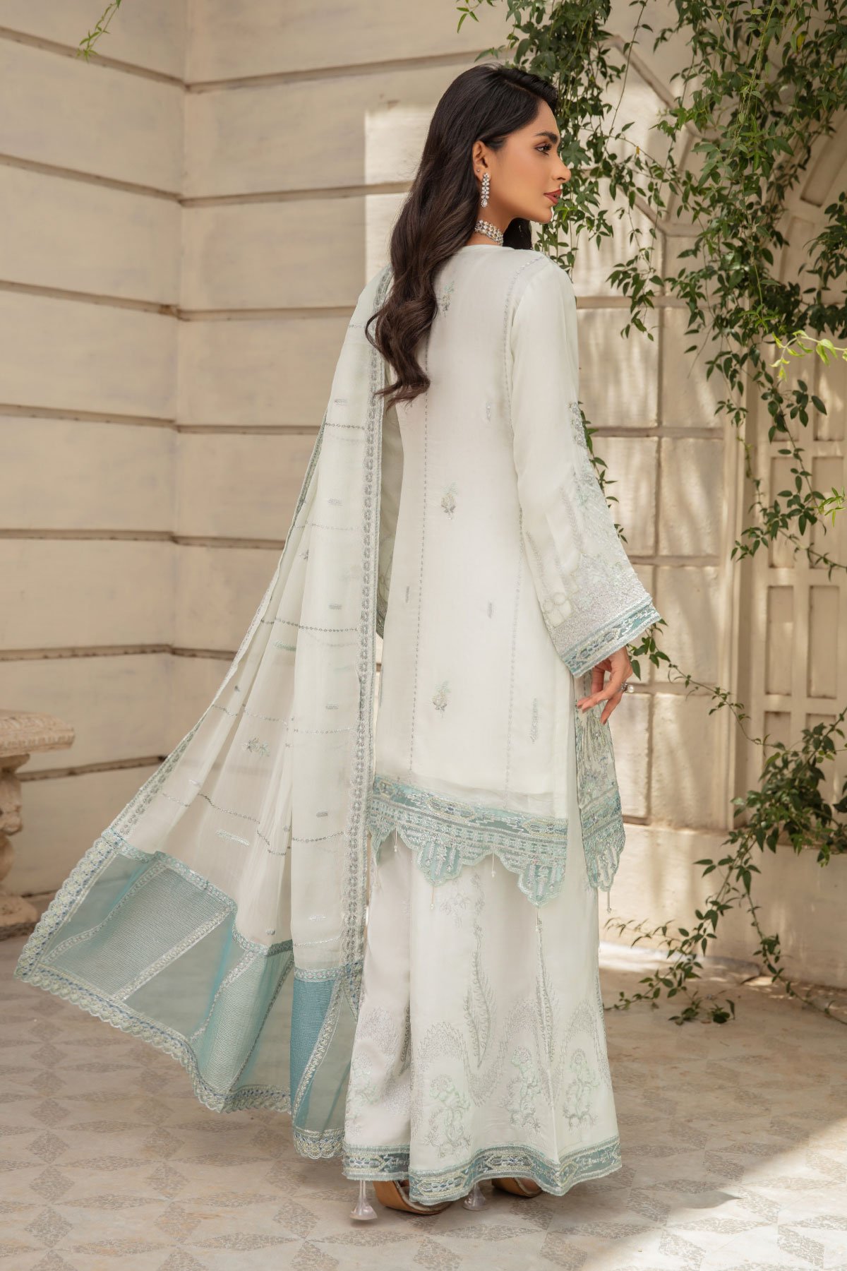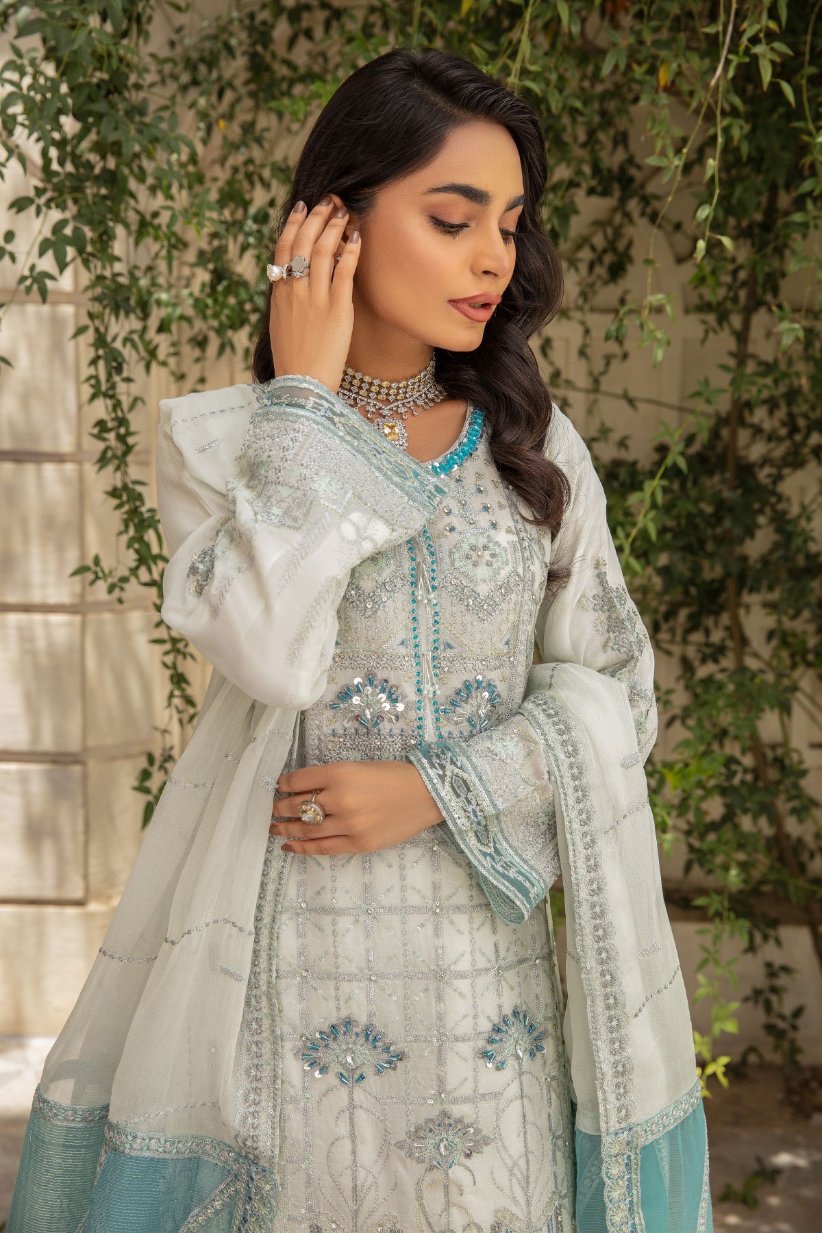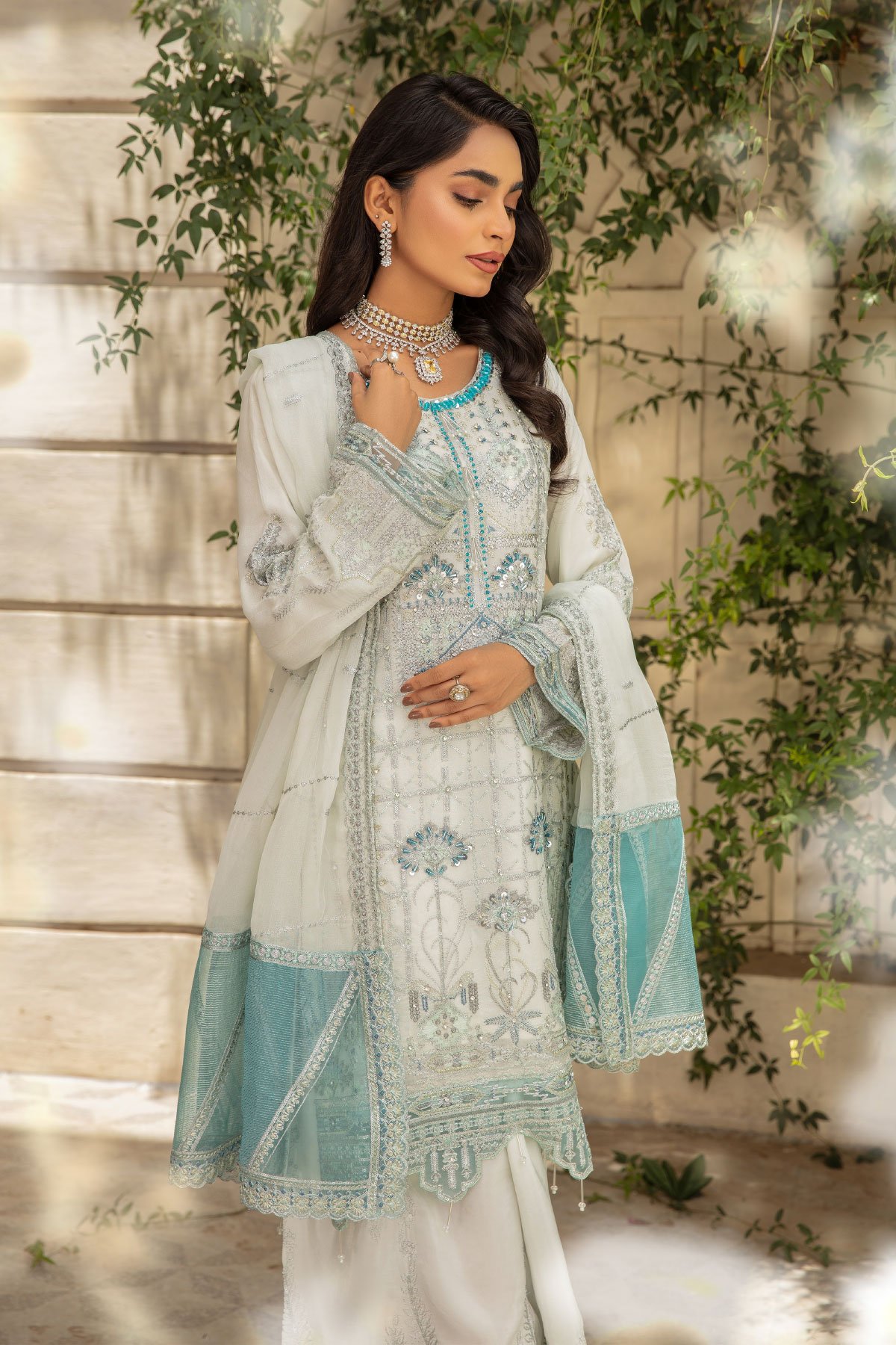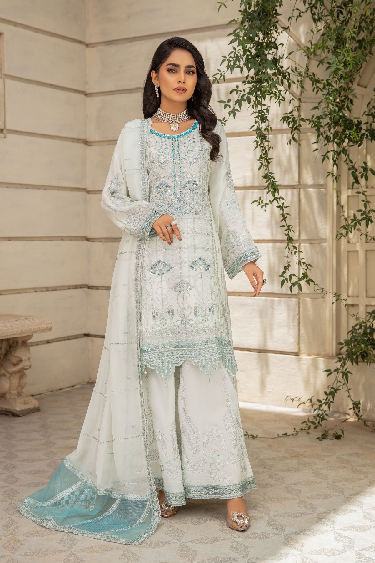 This beautiful 3 piece Ivana chiffon collection features a straight shirt with luxury thread work along with bead embellishments on the front, finished with an embroidered lace border and full length embroidered sleeves. It comes with wide leg embroidered plazo trousers and the look is finished with an organza embroidered dupatta.