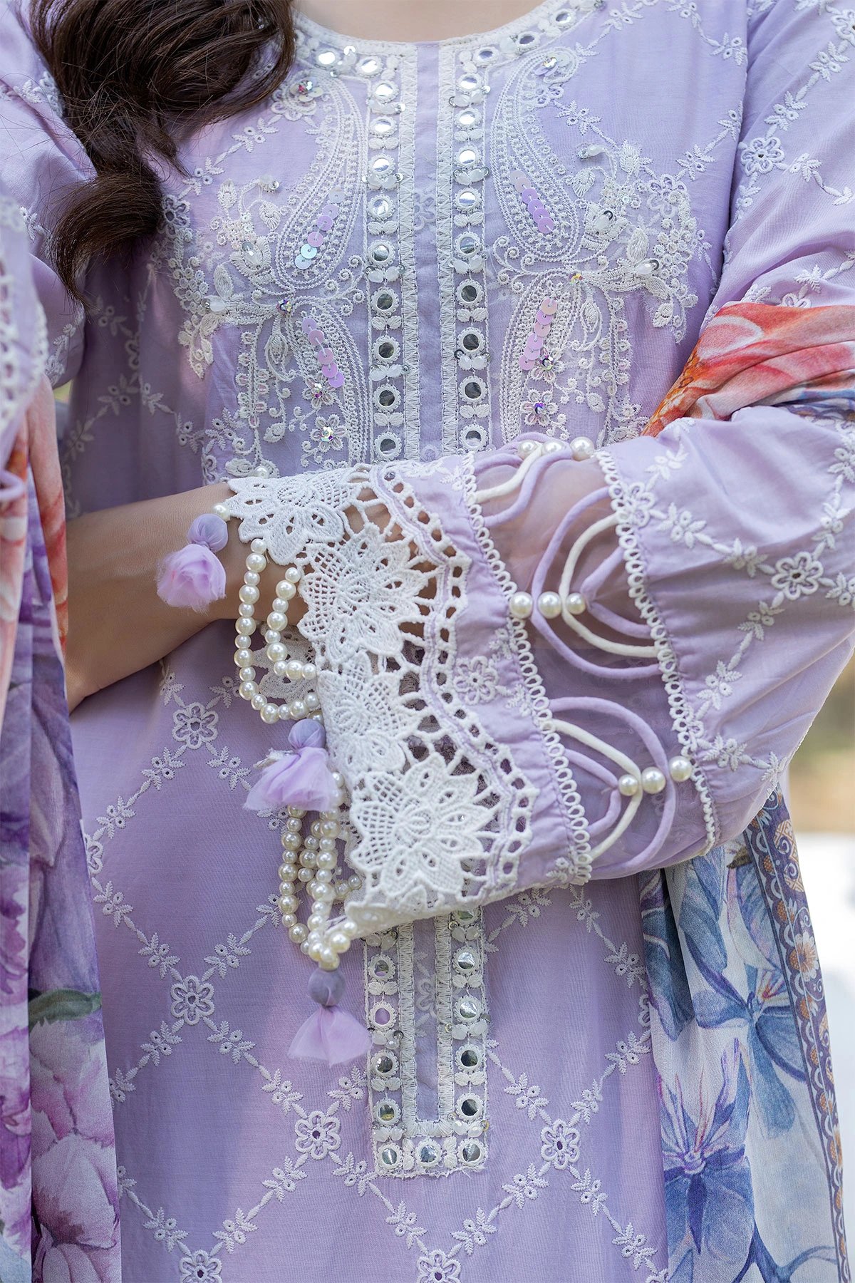 This beautiful 3 piece Ivana luxe collection features a straight Chikan Kari embroidered shirt with sequence and foil work embellishments along the front, finished with dangling beads and bauble embellishment on the border. It comes with full length embroidered sleeves. Paired with straight leg trousers and the look is finished with a chiffon digital printed dupatta. Perfect attire for this Eid.
