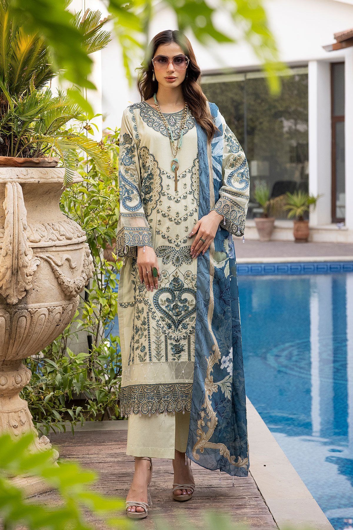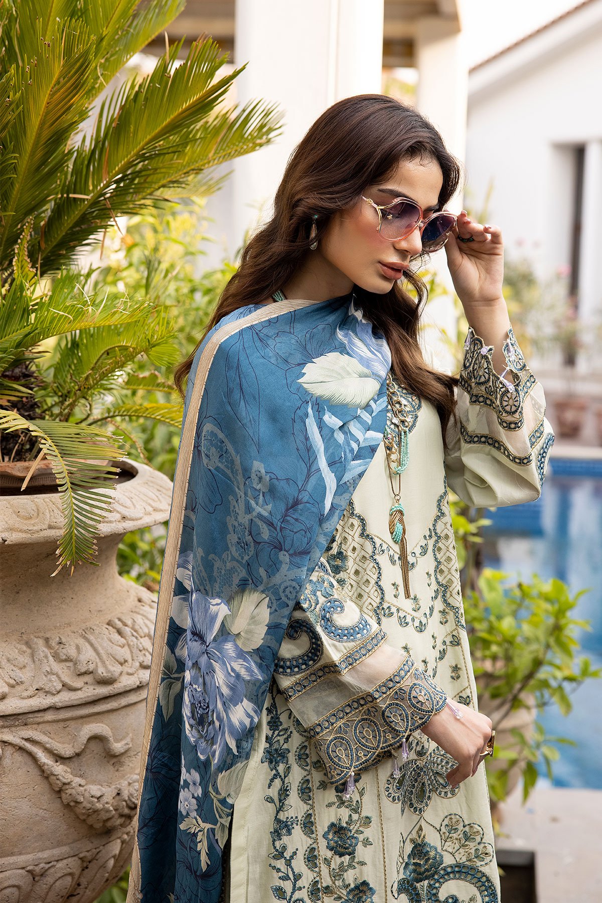 This beautiful 3 piece Ivana chikankari collection features a straight shirt with luxury thread work embroidery throughout finished with dangling beads on the border with lace embellishment. It comes with full length embroidered sleeves and straight leg trousers. The look is finished with a printed dupatta.