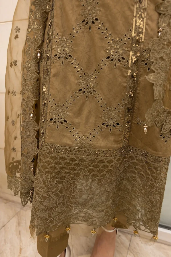 This beautiful 3 piece Ivana collection features a straight chikan kari embroidered shirt with pearl embellishments along the middle front finished with sequence embellishments throughout and a lace embroidered border. It comes with full length embroidered sleeves and straight leg plain trousers. The look is finished with an embroidered organza dupatta. Perfect casual collection for this Eid.