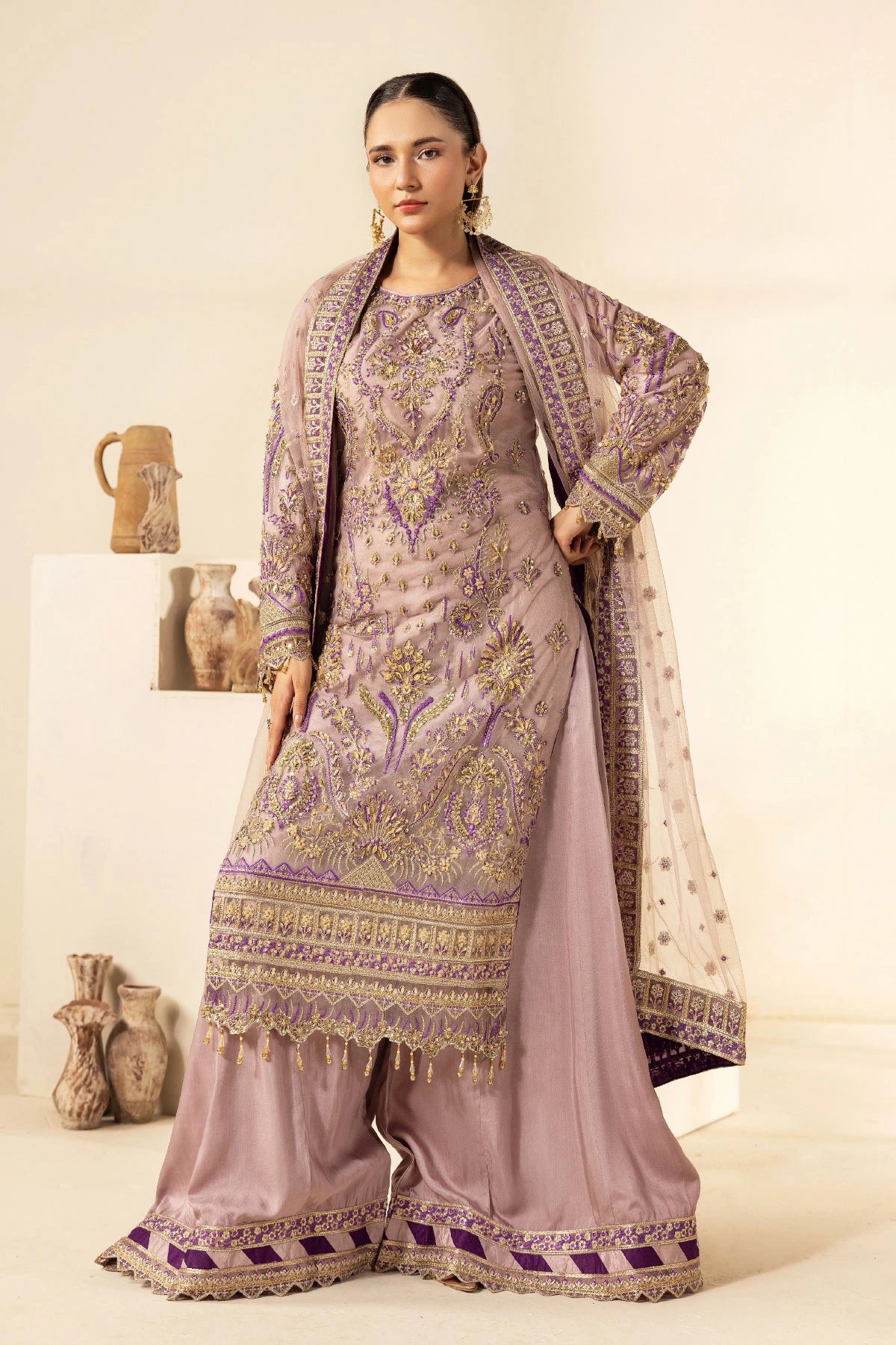 This beautiful 3 piece Ivana collection suit features a straight shirt with luxury thread work embroidery throughout with motifs embellishments finished with full length embroidered sleeves. Paired with a crepe plazo with embroidered border and the look is finished with an embroidered net dupatta. Perfect wedding collection for this season.