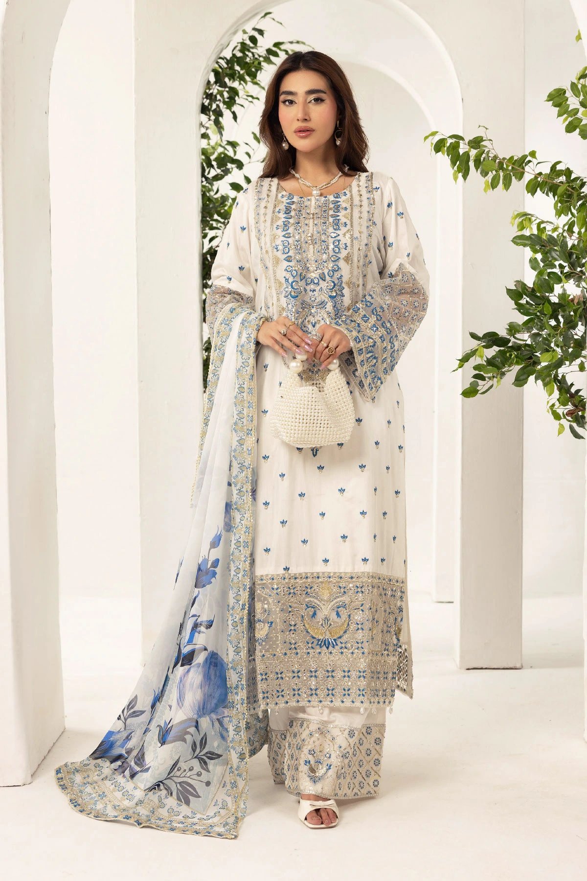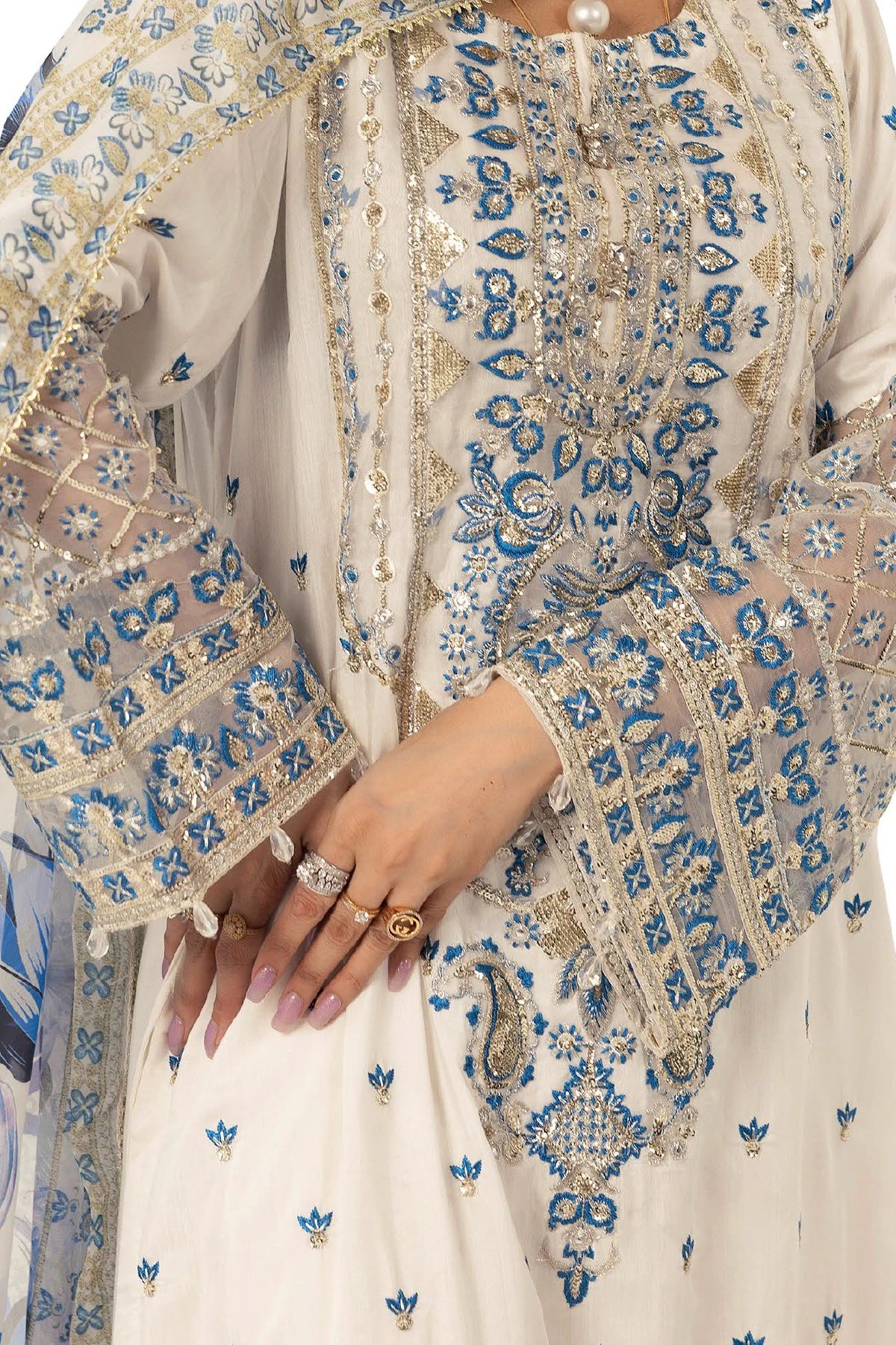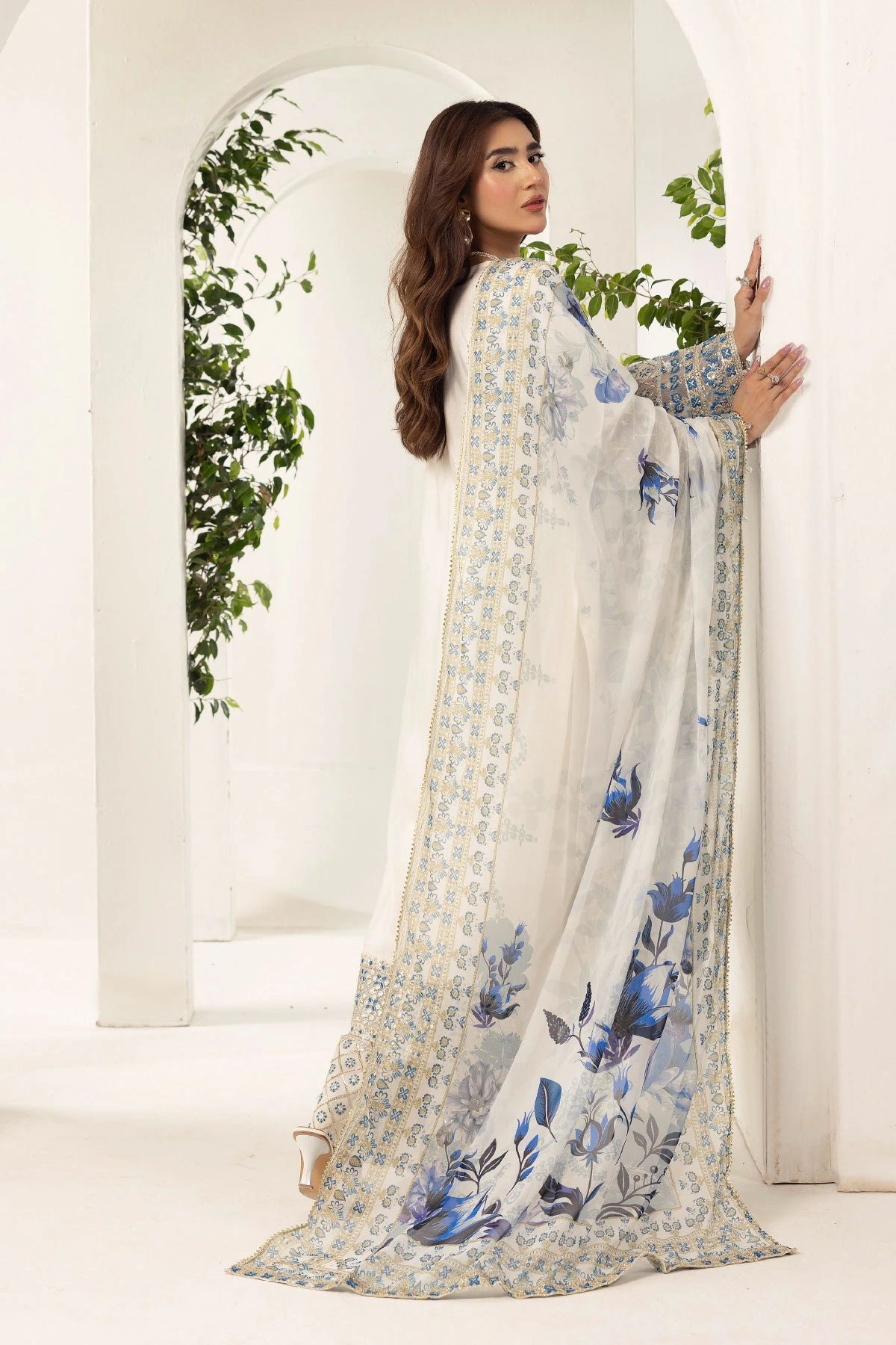This beautiful 3 piece Ivana suit features a straight shirt with luxury thread and motif work embroidery throughout finished with full length embroidered sleeves. Paired with wide leg trousers and the look is finished with a chiffon digital printed dupatta.