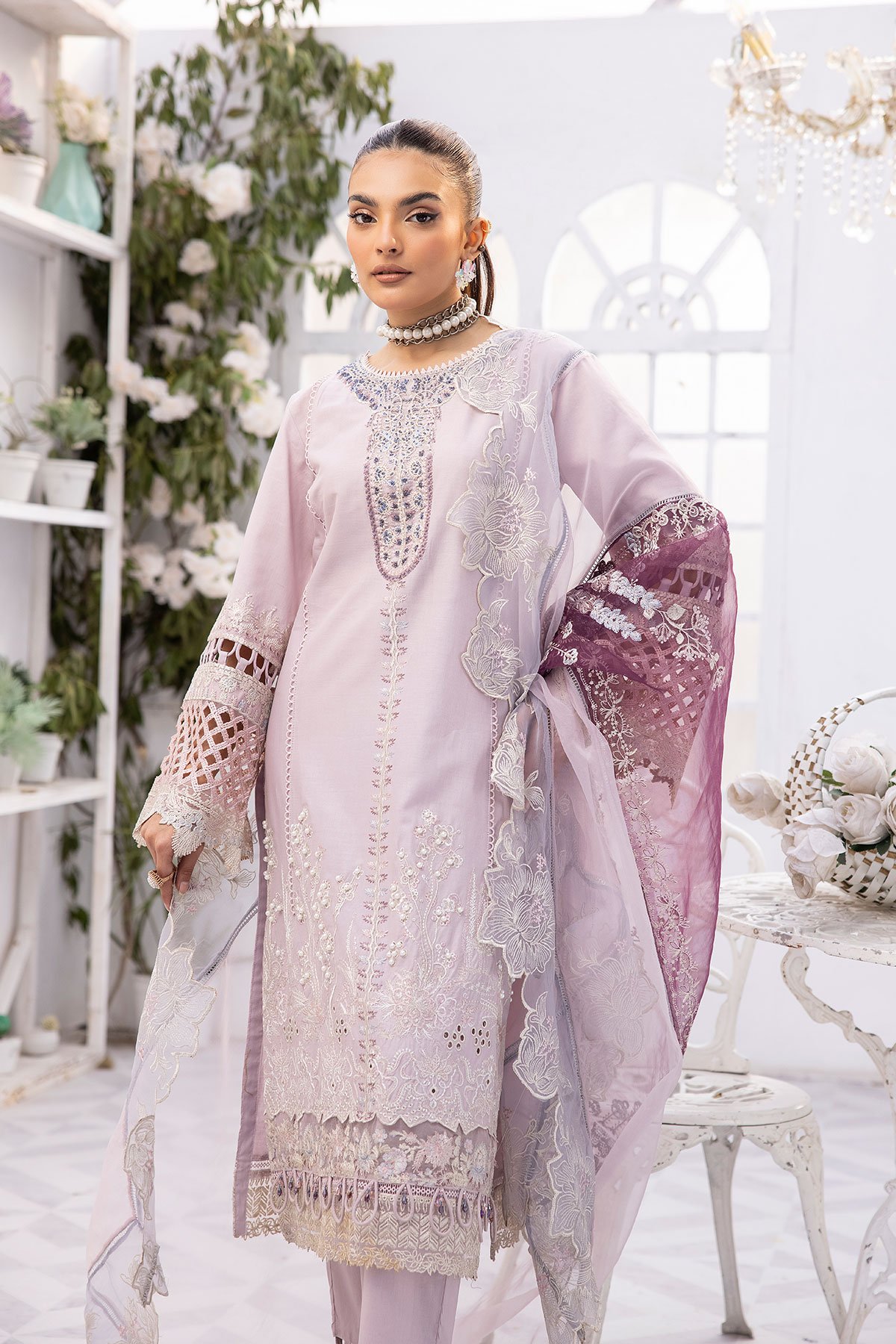 This beautiful 3 piece Ivana luxury chikankari collection features  a straight shirt with luxury thread work embroidery with bead embellishment along the front, finished with a lace embroidered border as well as full length embroidered sleeves. It comes with straight leg trousers with a cut designed border and the look is finished with a printed organza dupatta.