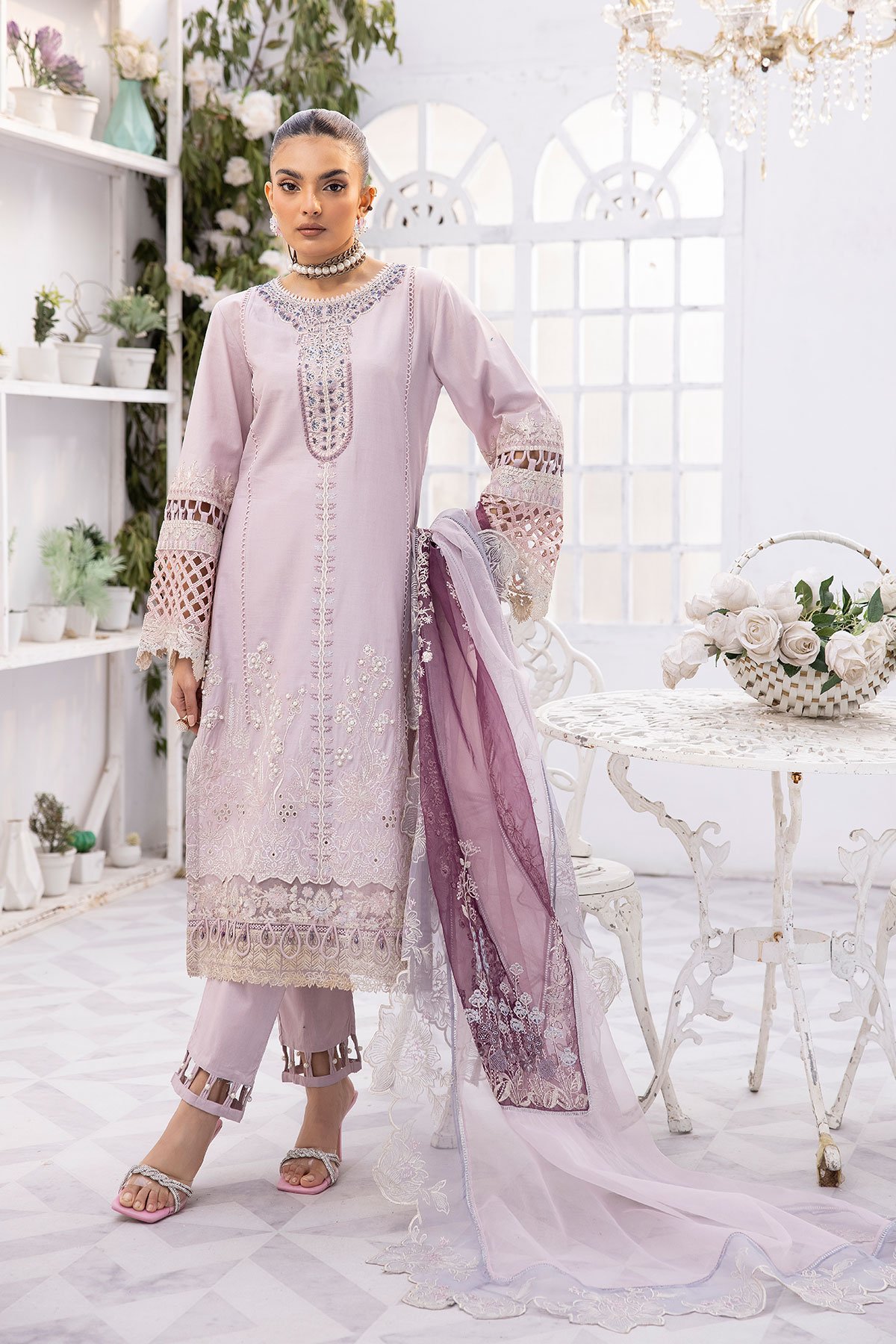 This beautiful 3 piece Ivana luxury chikankari collection features  a straight shirt with luxury thread work embroidery with bead embellishment along the front, finished with a lace embroidered border as well as full length embroidered sleeves. It comes with straight leg trousers with a cut designed border and the look is finished with a printed organza dupatta.