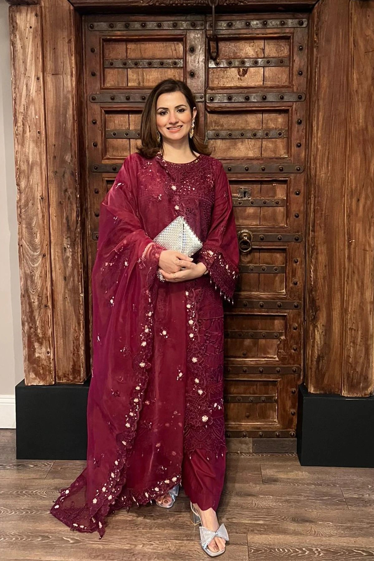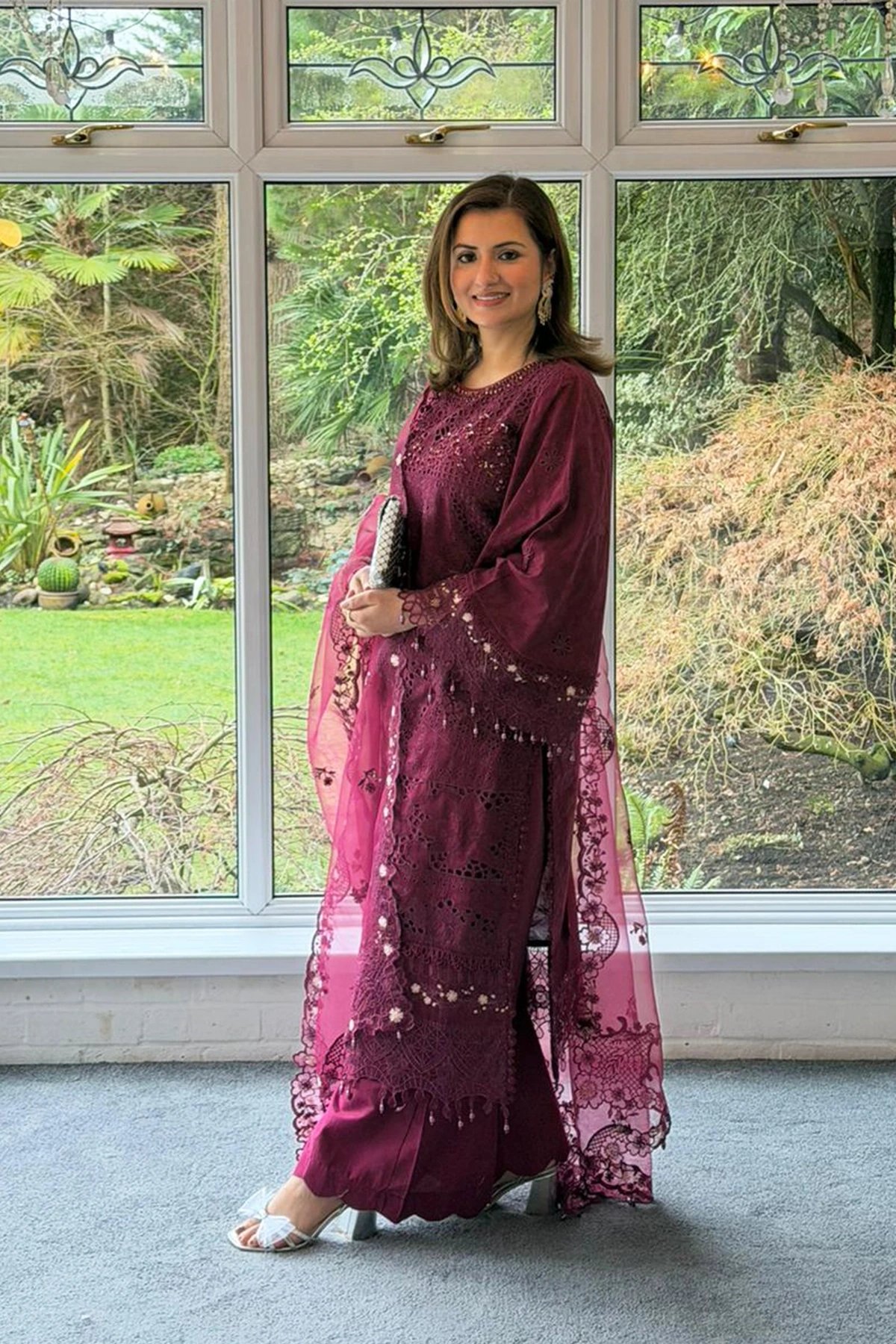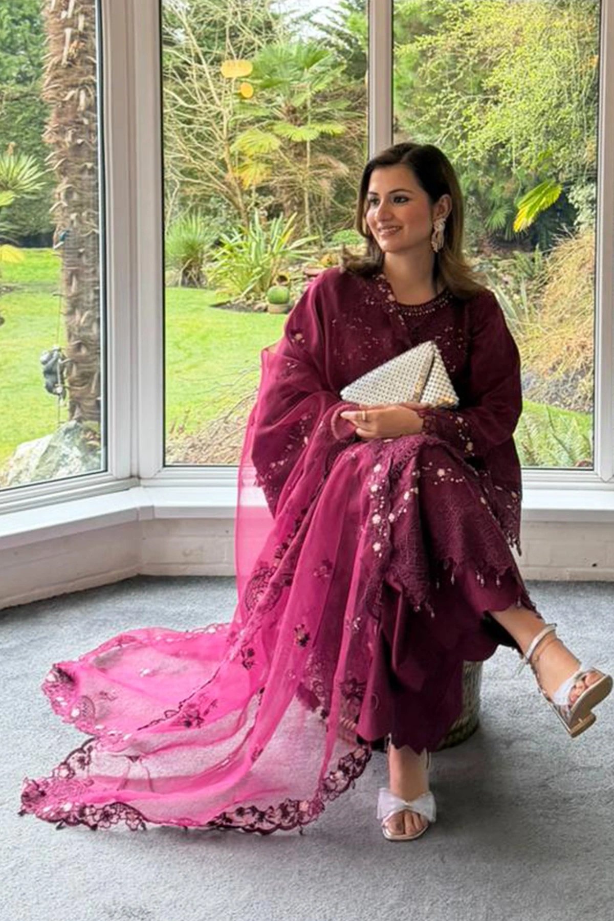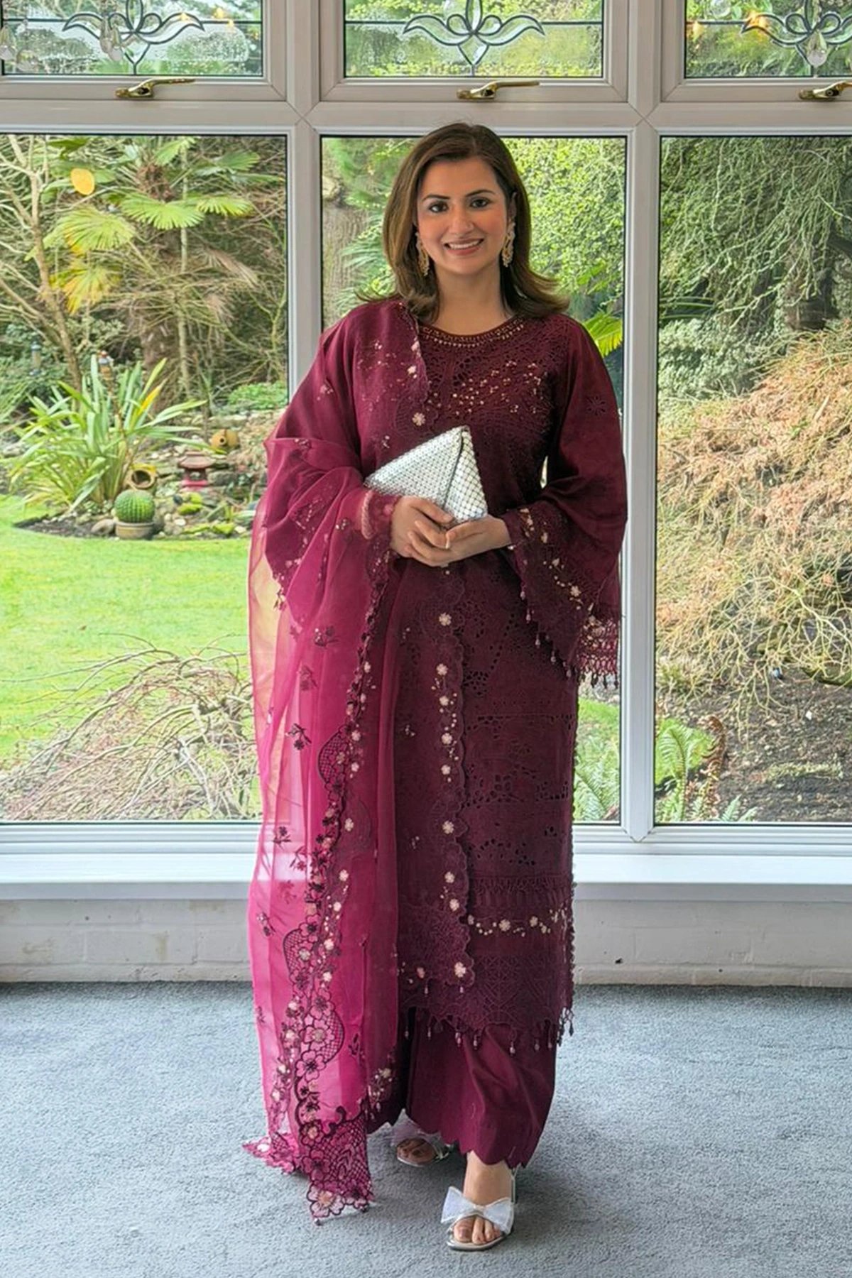 Ivana edit collection features a straight shirt with luxury thread work embroidery throughout with dangling beads on the border. It comes with full length embroidered sleeves with flared cuffs. Paired with wide leg lawn trousers and the look is finished with an organza embroidered dupatta. Perfect mother and daughter collection for this Eid.