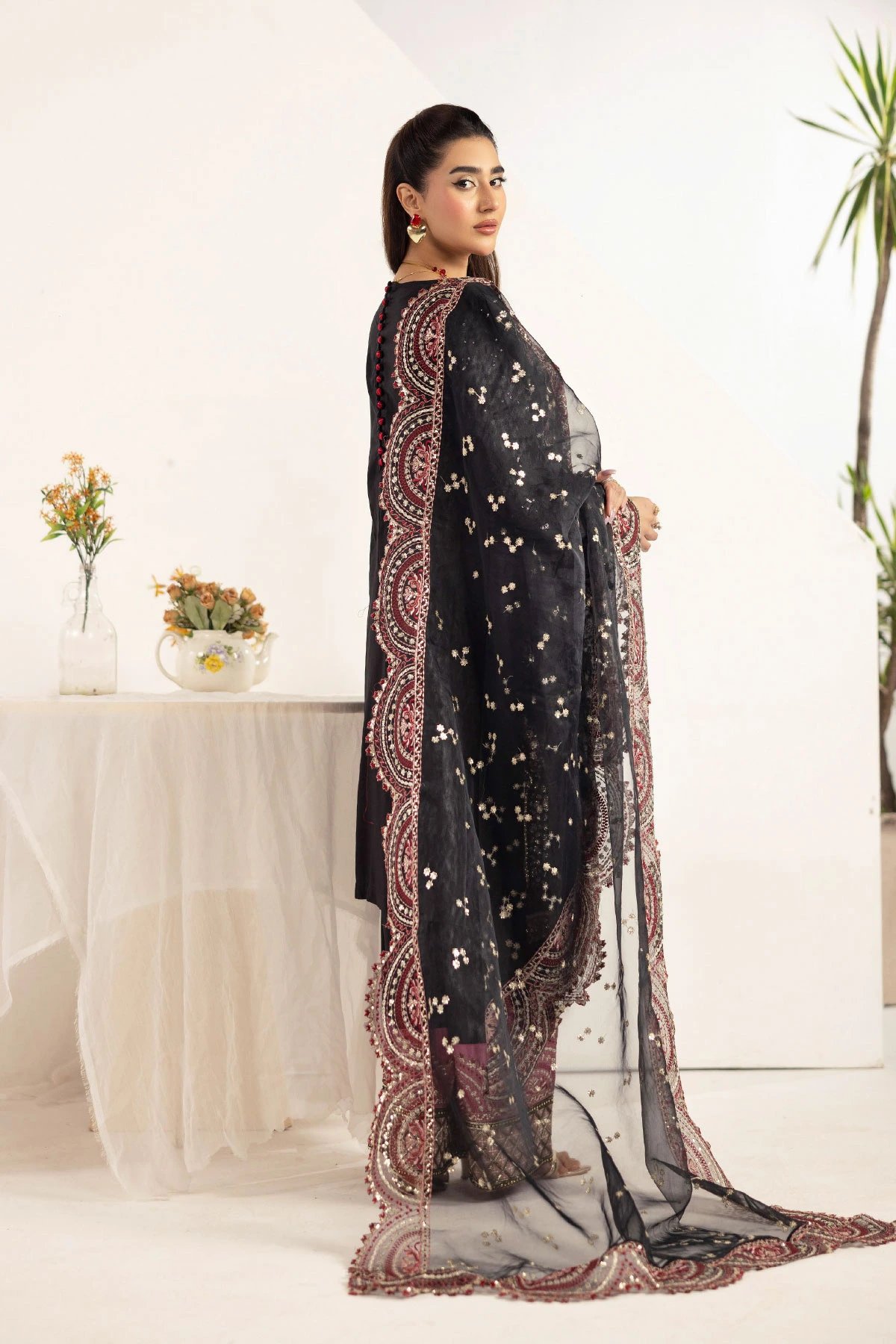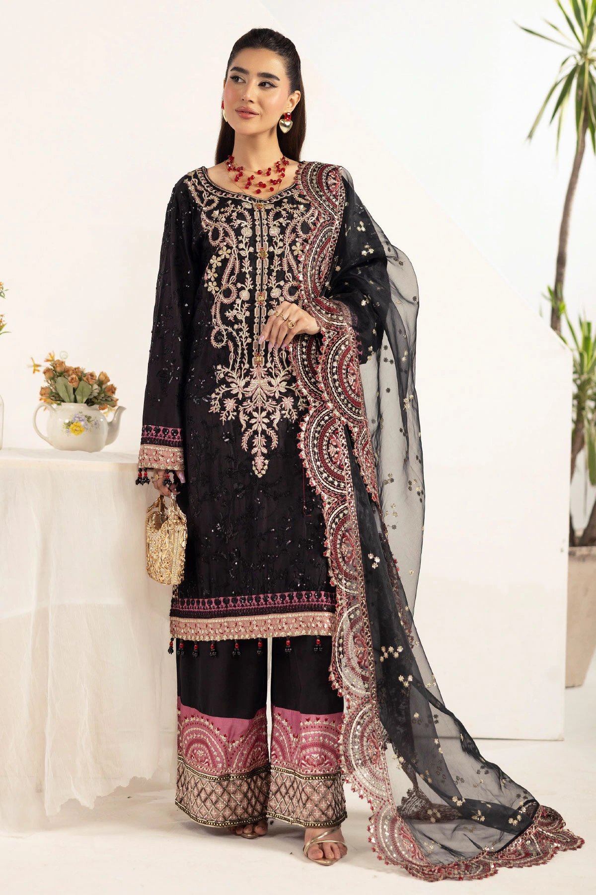 This beautiful 3 piece Ivana suit features a straight shirt with luxury thread and motif work embroidery throughout finished with full length embroidered sleeves. Paired with wide leg trousers and the look is finished with an organza embroidered dupatta.