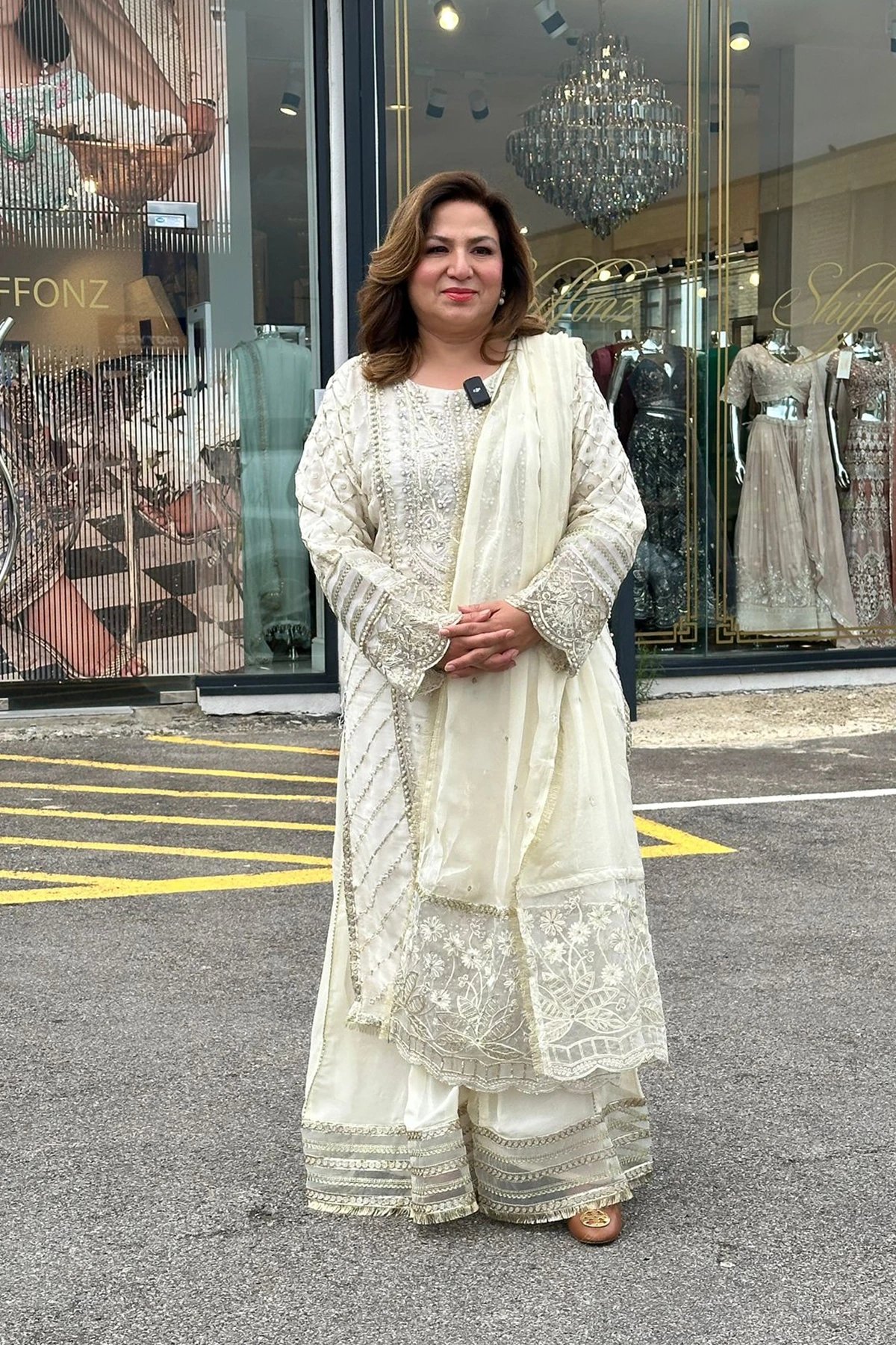 This beautiful 3 piece Ivana collection features a straight long shirt with luxury thread work embroidery throughout with pearl embellishments, finished with full length embroidered sleeves. Paired with an embroidered plazo and the look is finished with a chiffon dupatta.
