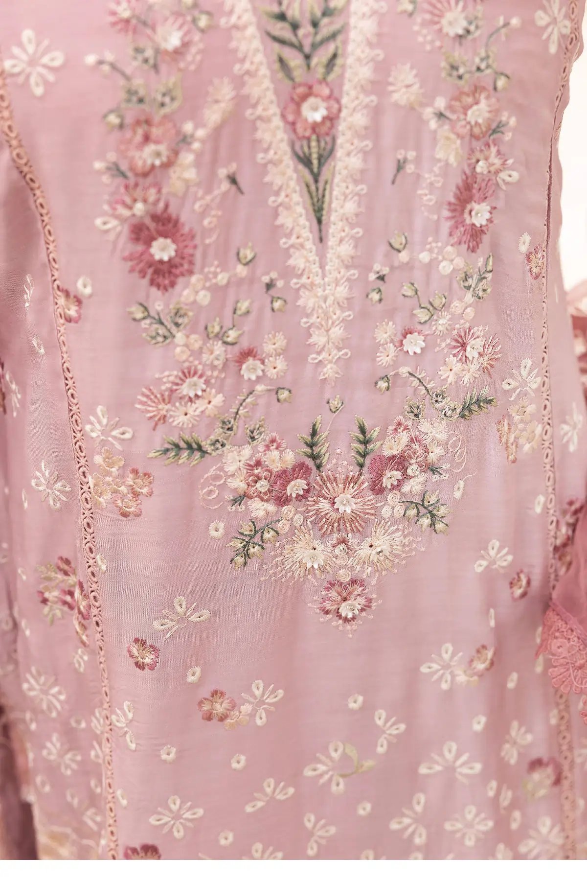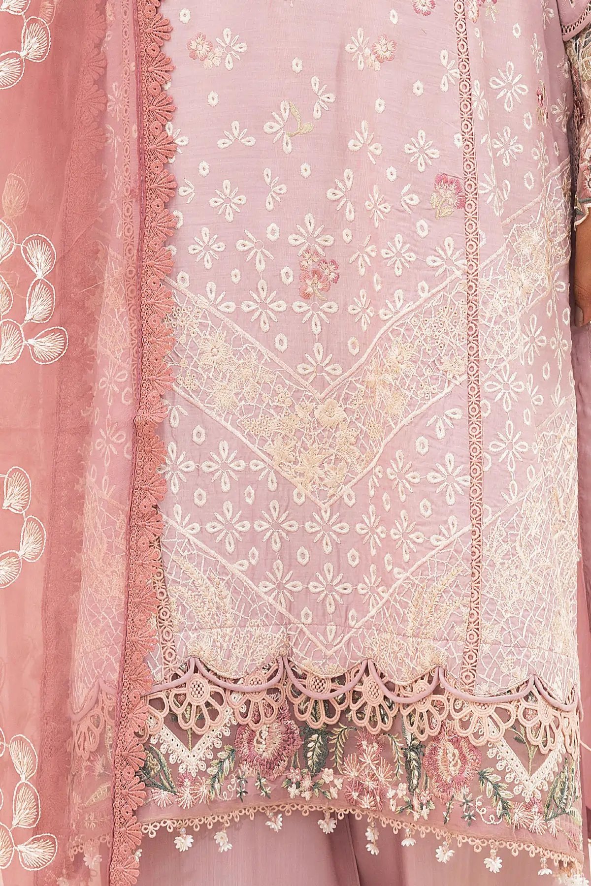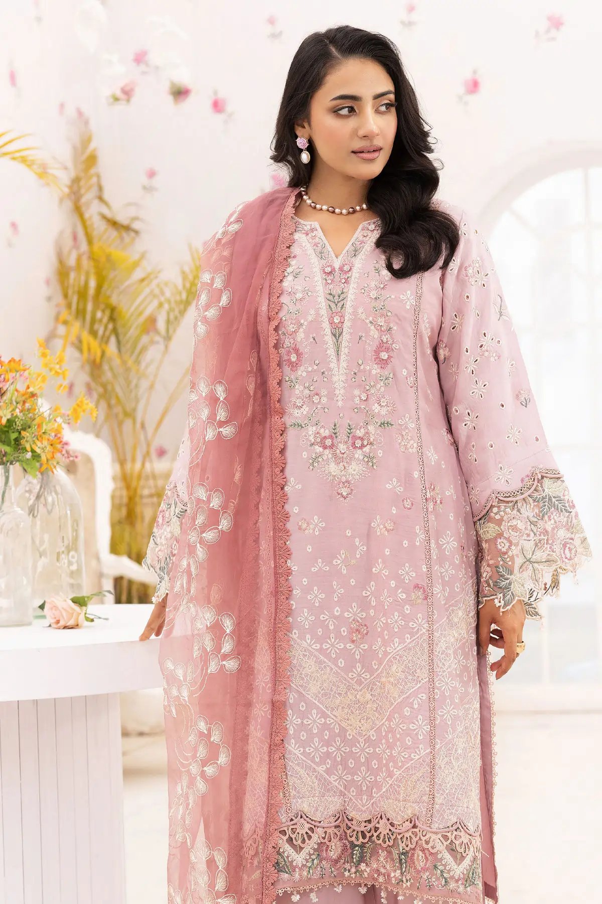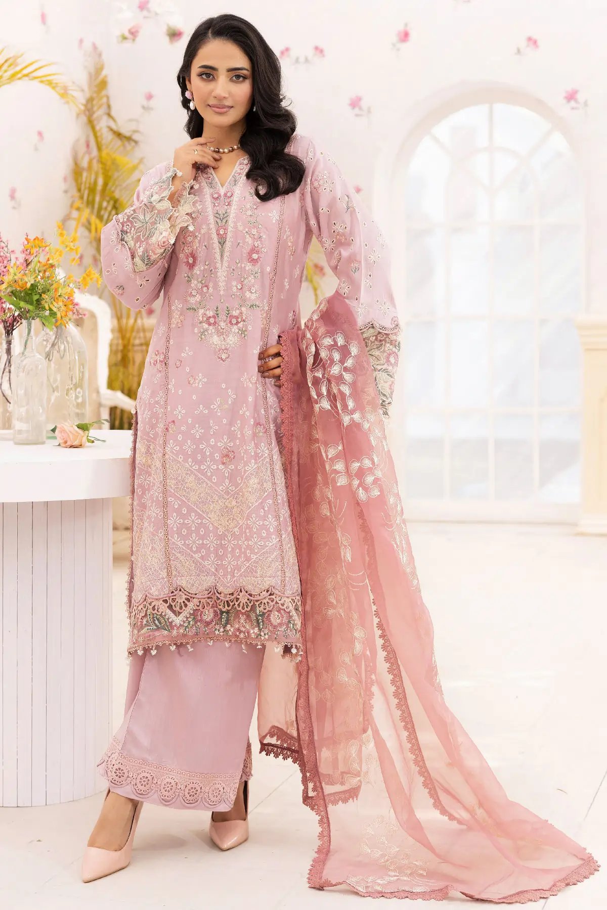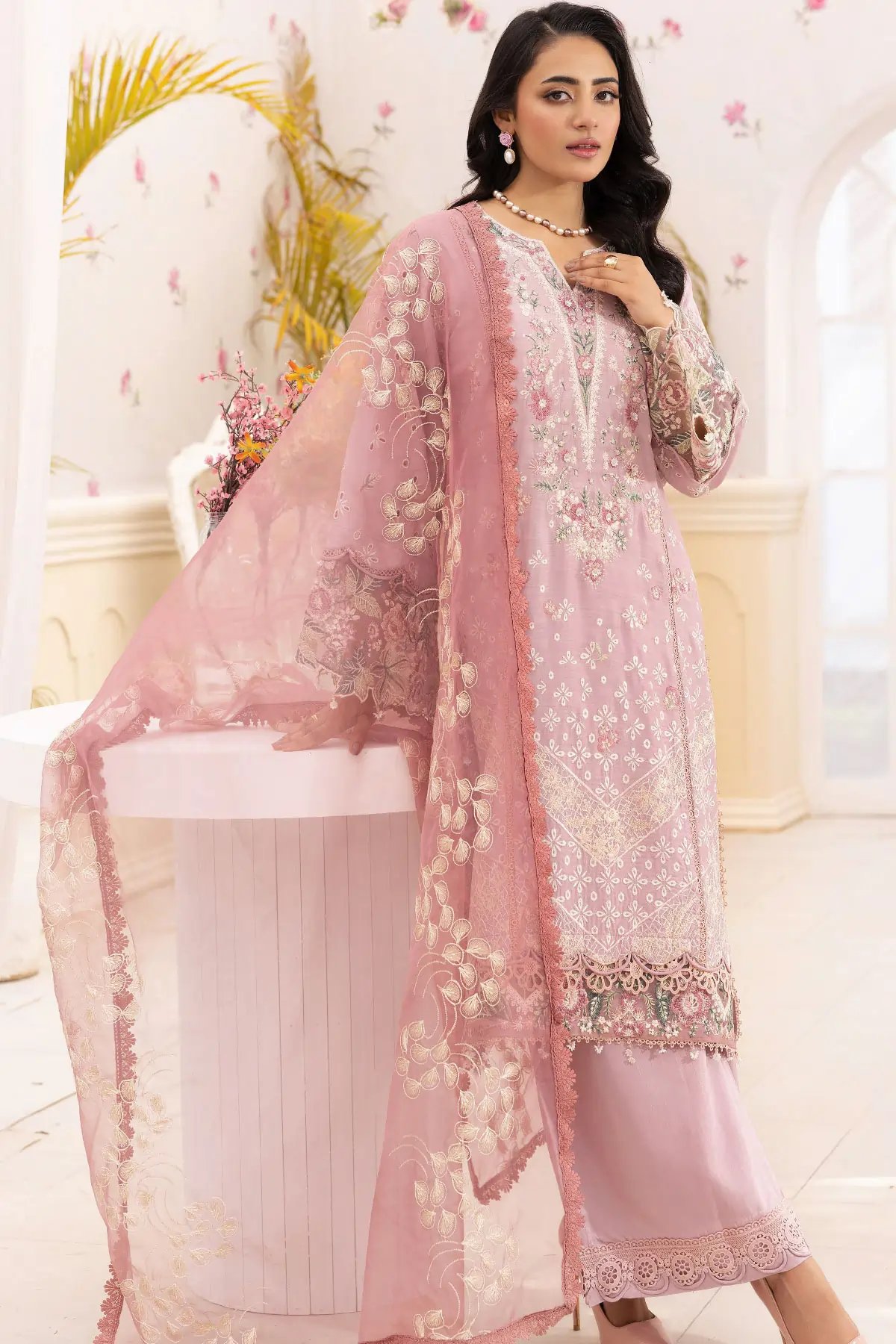 This beautiful 3 piece Ivana collection features a straight shirt with luxury thread work embroidery throughout finished with a lace embroidered border with dangling beads. It comes with full length embroidered sleeves, Paired with plazo trousers with an embroidered border and the look is finished with an organza dupatta. Perfect casual festive collection for this Eid.