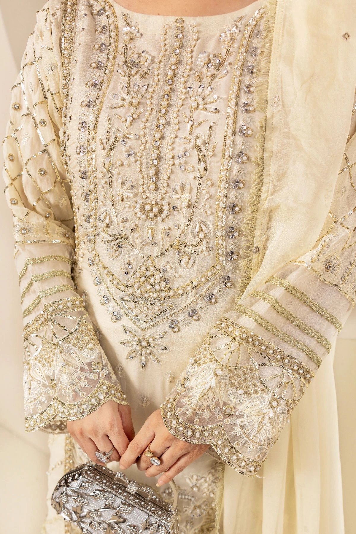 This beautiful 3 piece Ivana collection features a straight shirt with luxury thread work embroidery throughout with pearl embellishments, finished with full length embroidered sleeves. Paired with a gharara  with an embroidered border and the look is finished with a chiffon dupatta.
