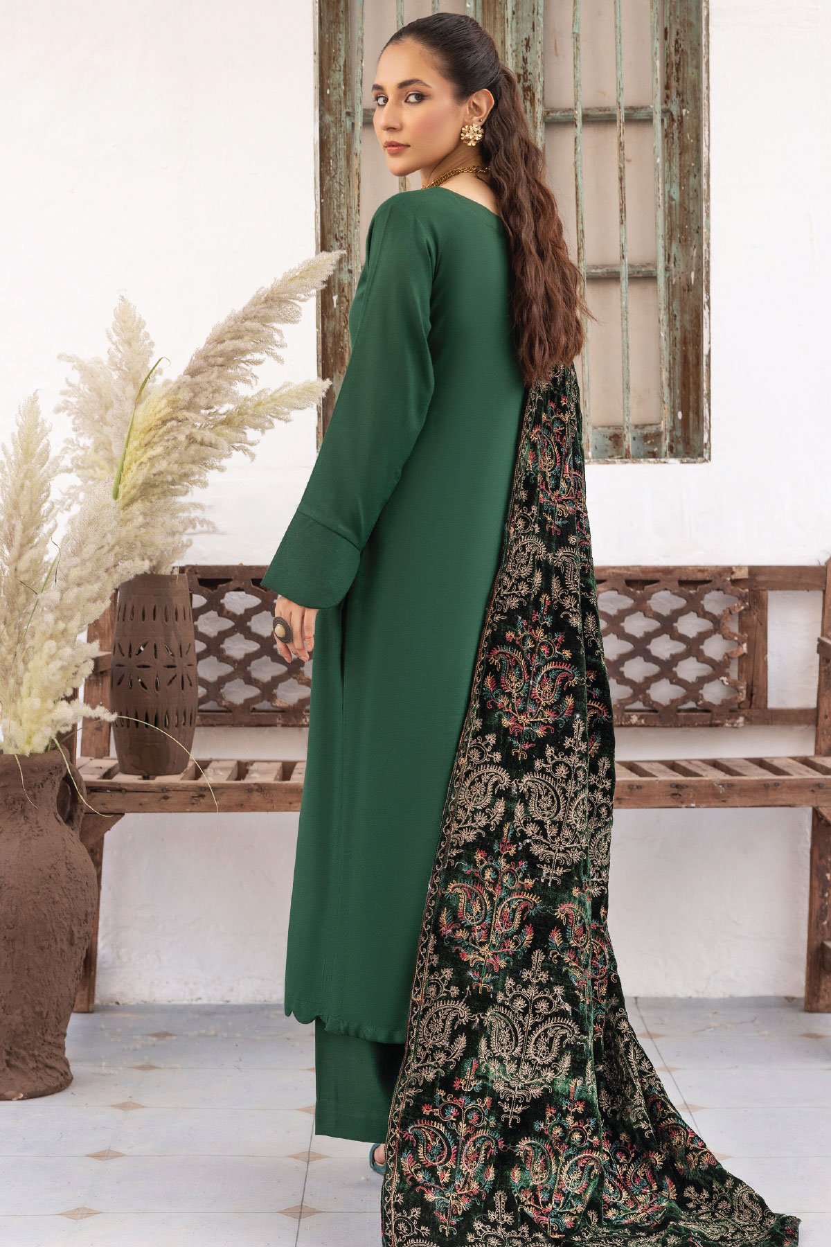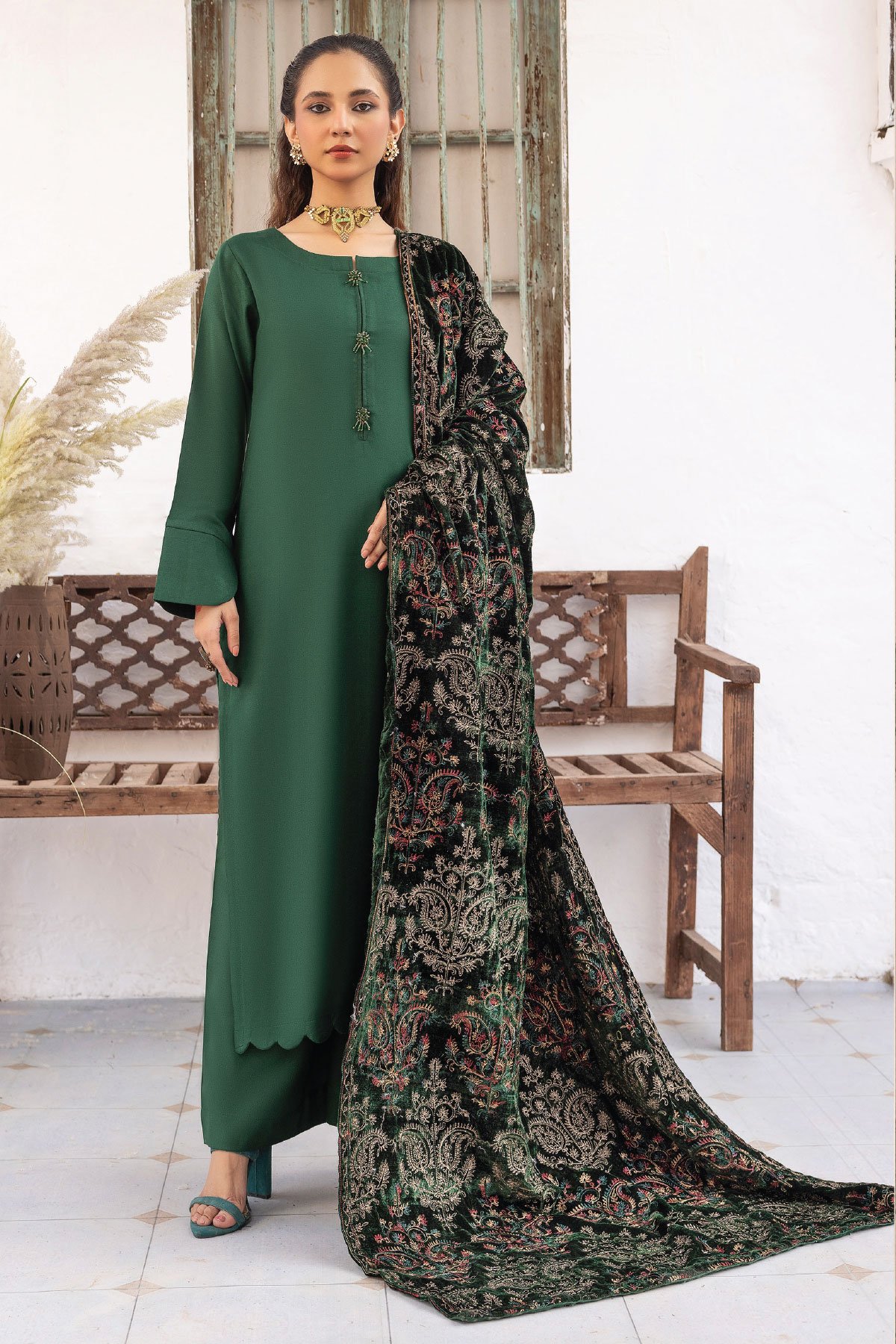 Jaan-b embroidered 3 piece suit with velvet shawl