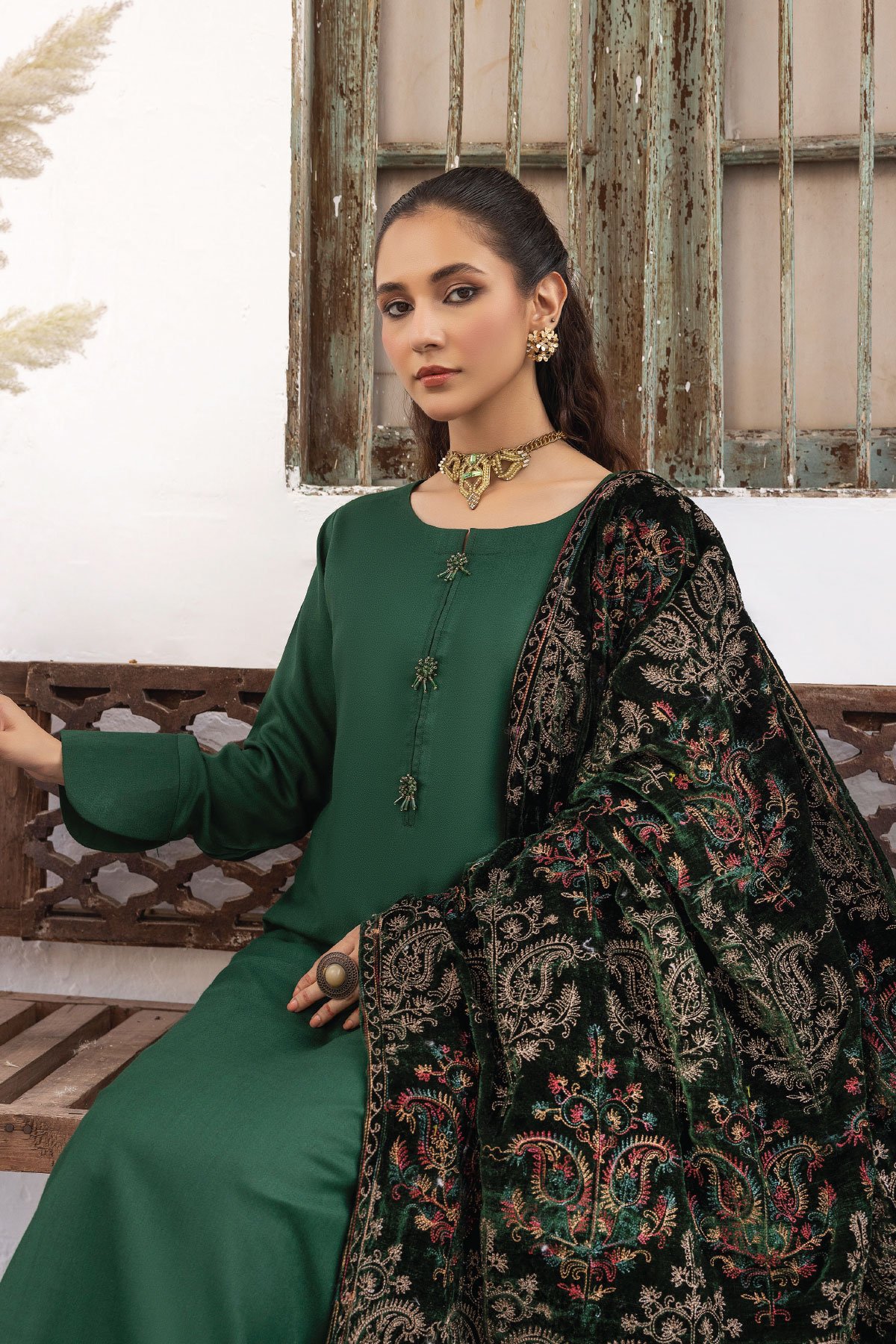 This beautiful Jaan b collection features a straight shirt with bead embellishment on the front, finished with full length sleeves. Paired with plain trousers and the look is finished with an embroidered velvet shawls.