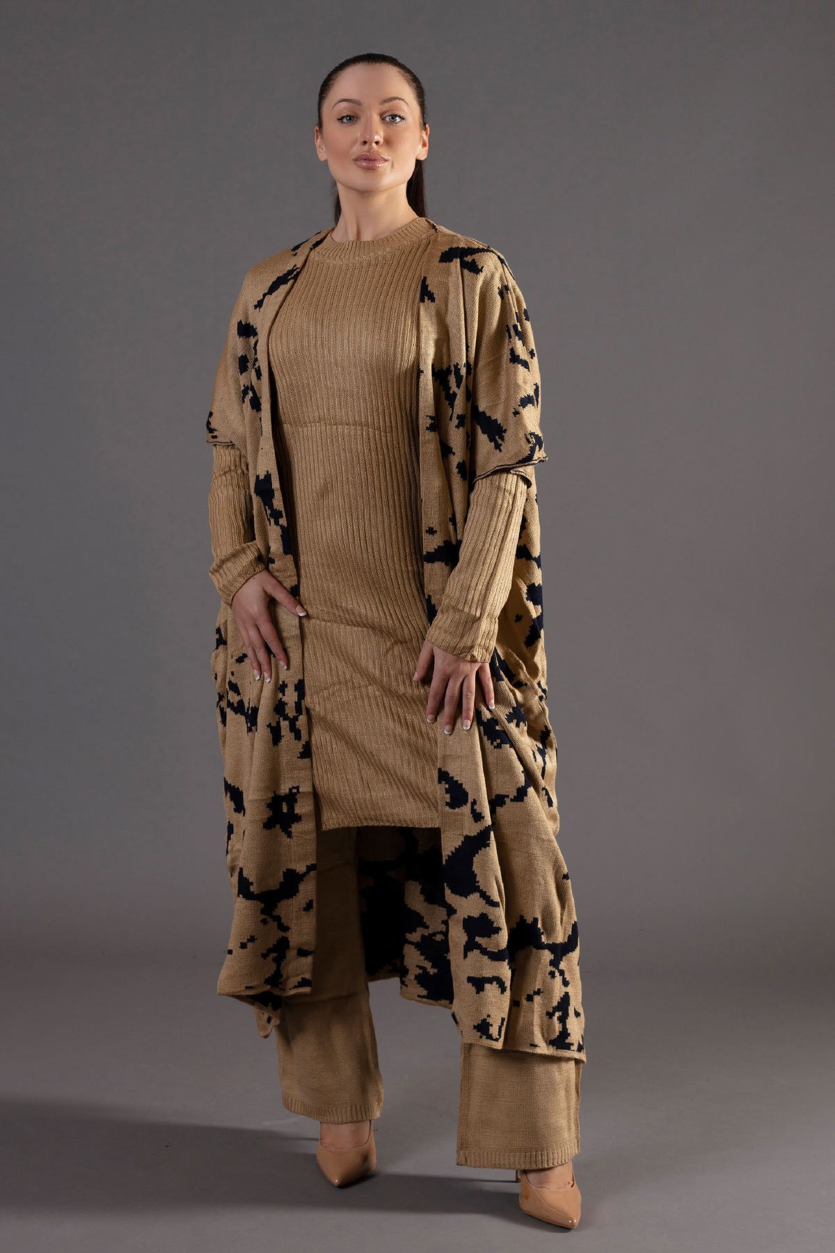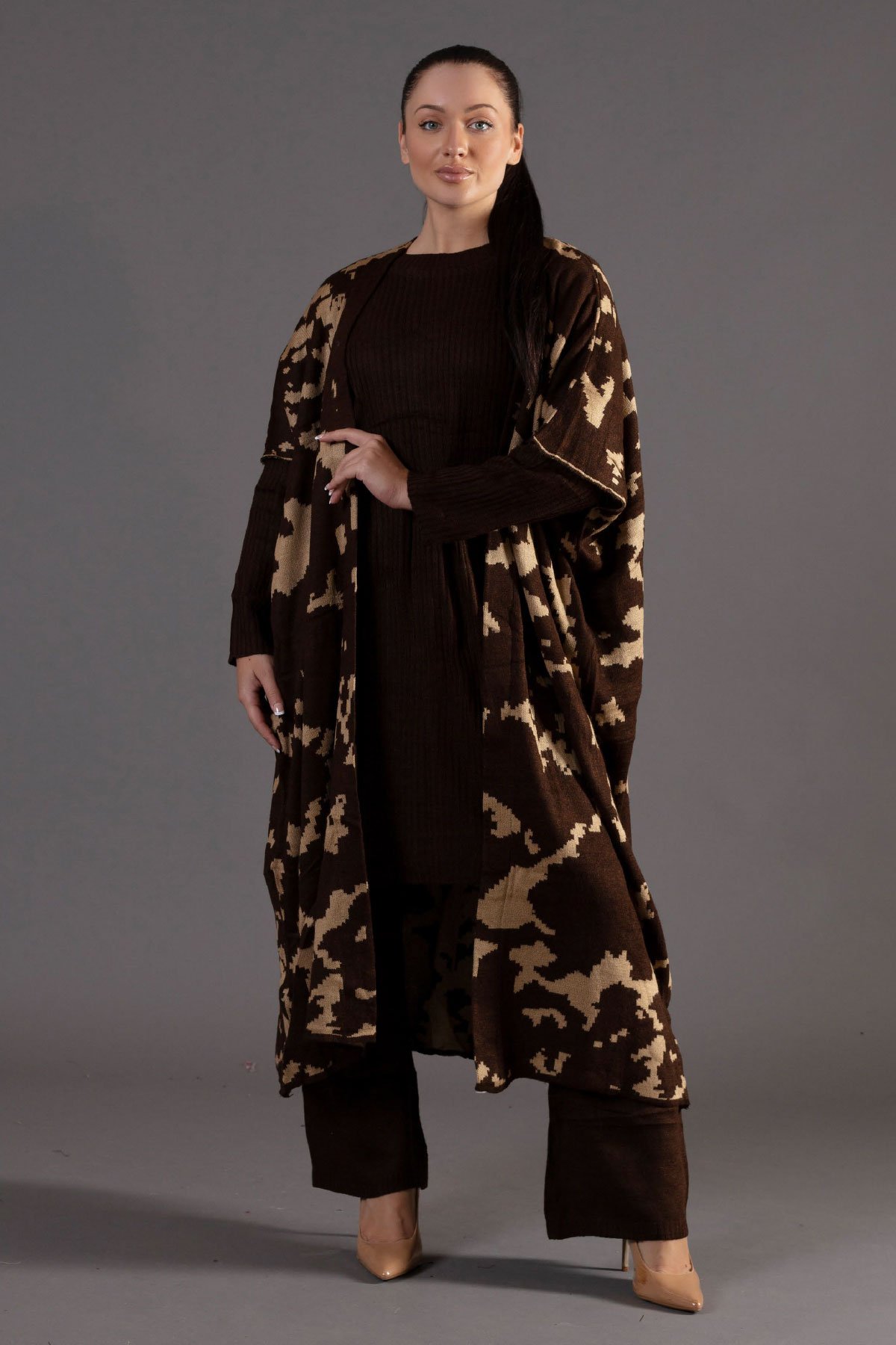 Get the cosy vibe in a knitted co-ord featuring a long length jumper with open sides and knitwear straight leg trousers. Paired with a luxury printed jacket style cardigan on top. Perfect casual attire for this winter look.